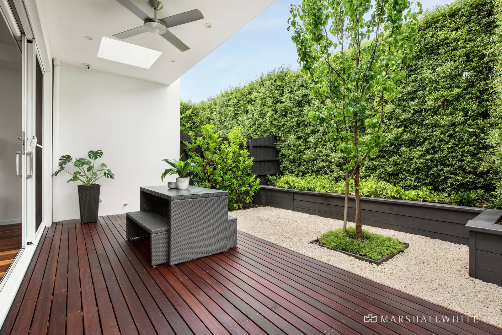 An inviting first impression is created by the warmth of solid Spotted Gum floors in the entrance hall, convenient home office and sitting room/retreat or 4th bedroom with designer en suite and walk in robe. The timber floors continue through the expansive open plan living and dining room where high ceilings enhance the sense of space and a sleek, premium kitchen boasting Miele appliances, white stone benches and a butler's pantry caters to every culinary requirement. Glass sliders open the living to a fabulous, private covered deck with ceiling fan surrounded by lush, landscaped northeast facing greenery, creating a wonderful peaceful setting for year-round outdoor dining and entertaining. Broad sky lit stairs lead up to the generous main bedroom with lavish en suite and walk in robe, two additional double bedrooms with robes and a stylish bathroom.