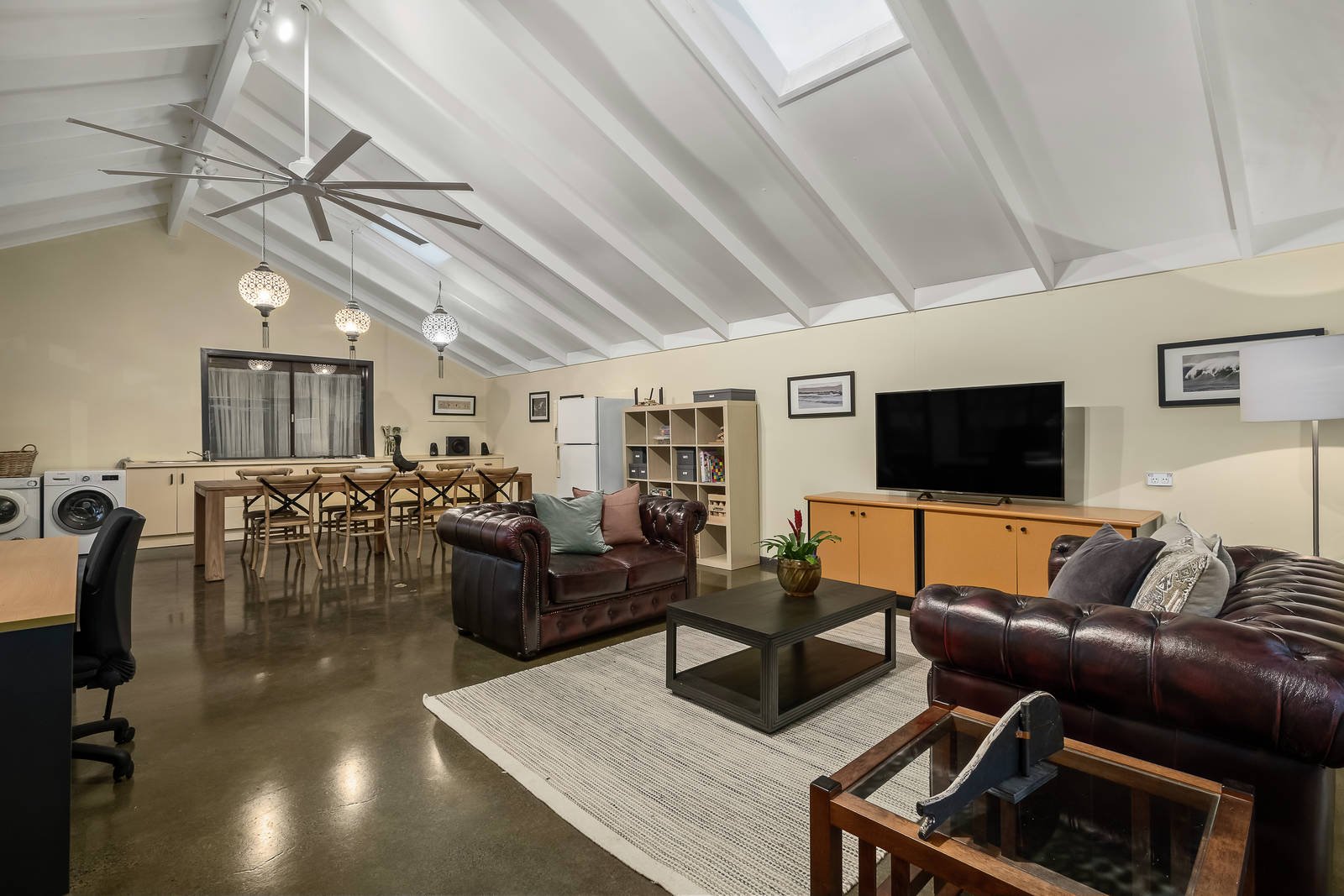 Awash with northern light, the spacious main bedroom comprises mirrored built in robes and ensuite, while two additional bedrooms with robes share a dual entrance bathroom with separate bath and shower. A truly versatile family home, additional features include an external bedroom/studio equipped with vaulted ceiling, polished concrete floors, kitchenette and laundry facilities plus an outdoor workshop, wine cellar, ducted heating and cooling, 15,000L water storage and off street parking.