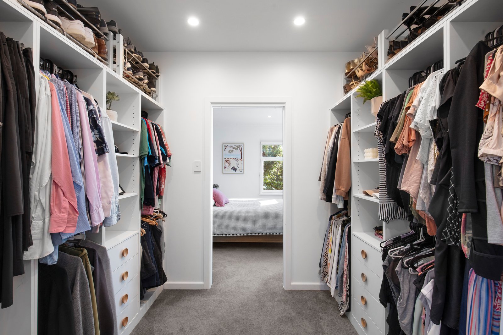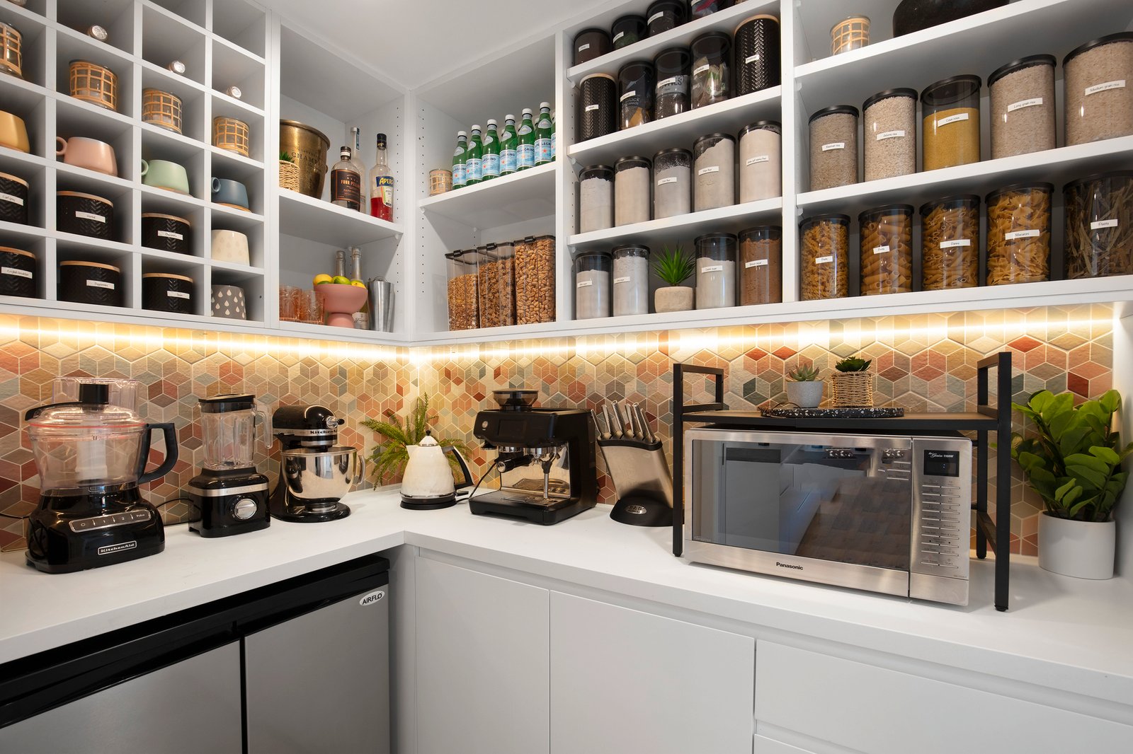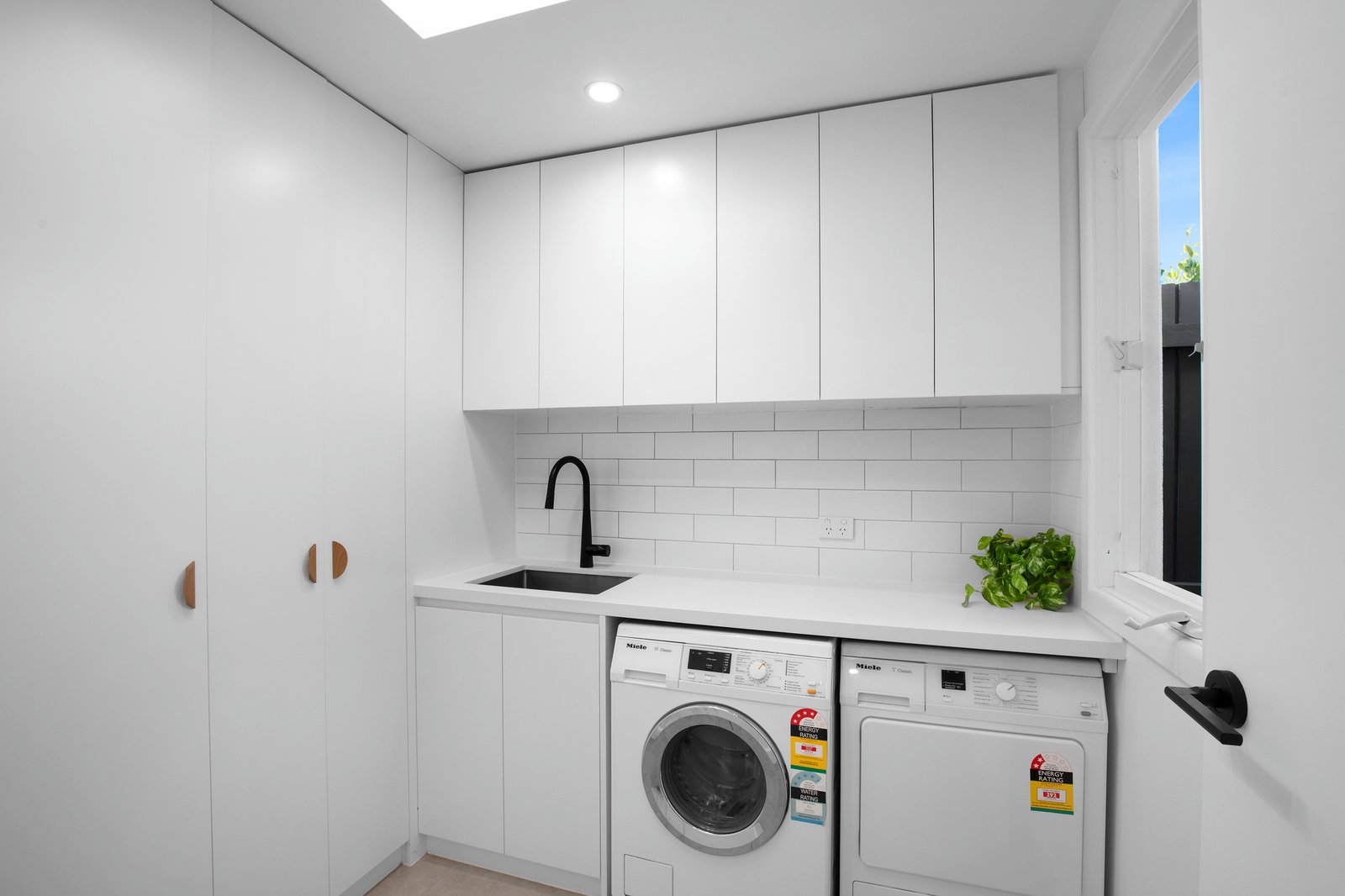 The thoughtfully designed kitchen is the ultimate for entertainers, featuring a bespoke concrete island bench, generous storage and Miele appliances, including two slick black wall ovens, glass rangehood and integrated dishwasher. Walking through the spacious kitchen to the stylish butler’s pantry is the laundry, which features an in-built drying rack, adding extra practicality and functionality for families.