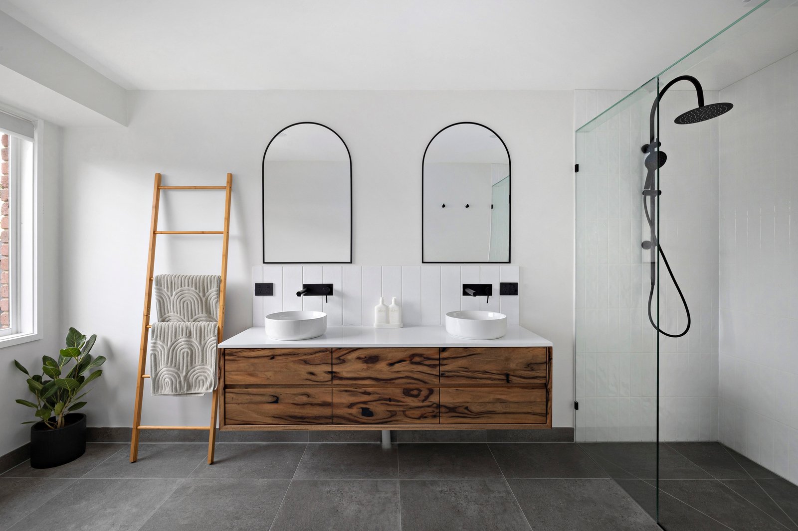 The main suite is a highlight, complete with a dual-access walk-in robe designed for two and a spa-like en-suite, featuring a floating messmate vanity and oversized twin shower. Three additional bedrooms, each with built-in robes, are situated within a rear wing alongside a striking wet-room bathroom featuring a freestanding bath and a separate WC, ensuring every detail complements the modern aesthetic. Vaulted ceilings rise above the lounge, amplifying light and volume, while a wood-burning fireplace brings seasonal warmth. Expansive casual zones extend out further, supported by a sleek kitchen with premium appliances, including a Westinghouse induction cooktop, 900mm oven and integrated Bosch dishwasher, plus a custom-made timber dining table extension that aligns perfectly with family living.