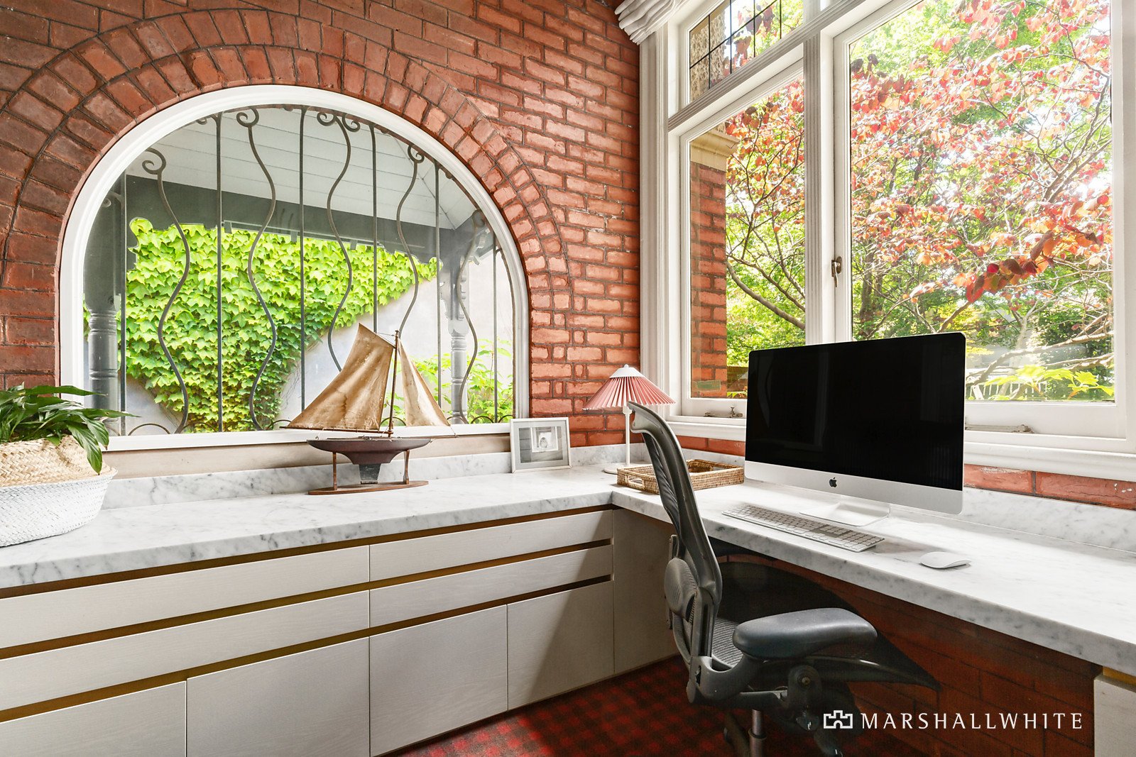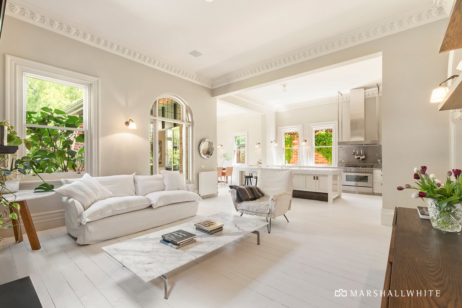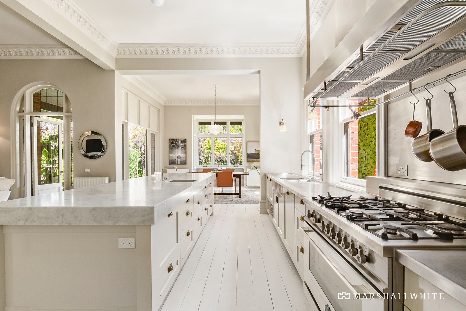 Gracious proportions, high ceilings, leadlight windows and stunning whitewashed timber floors define the timeless elegance of the double arched entrance hall, expansive living room with a fireplace and the beautiful dining area overlooking the garden. At the heart of the living and dining spaces, the sublime gourmet kitchen is a chef's dream with its marble island, stainless steel work bench, 90cm Italian oven and integrated fridge/freezer. Ideal for al fresco dining, a large decked area and bluestone terrace beneath a vine covered pergola areset amidst the glorious west-facing private garden with a carport accessed via the rear lane providing ample space for parking. The magnificent main bedroom with bay window, fireplace, walk in robe and lavish en suite includes a fabulous, fitted home office enjoying garden views. There are two additional bedrooms with built in robes and a designer bathroom.