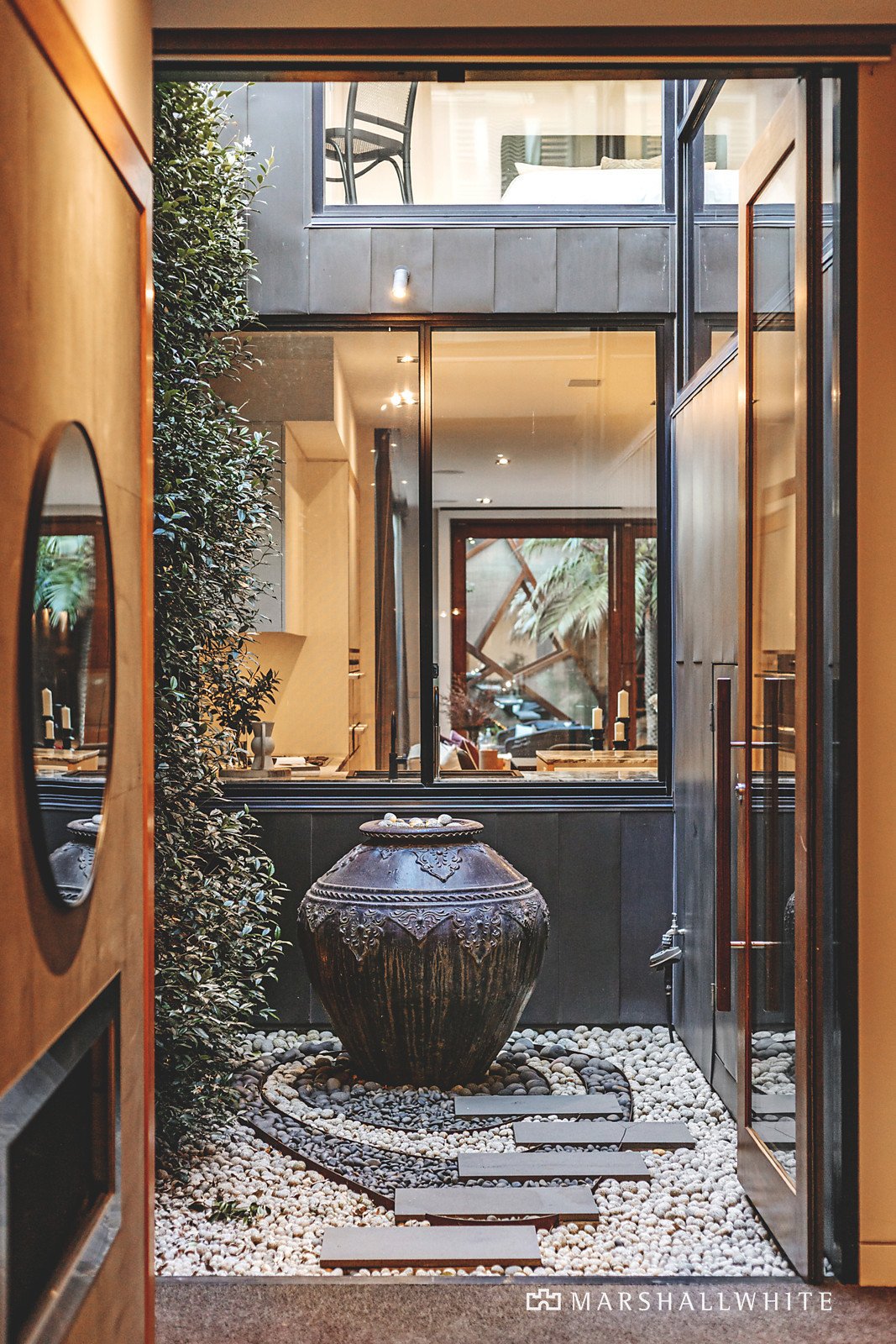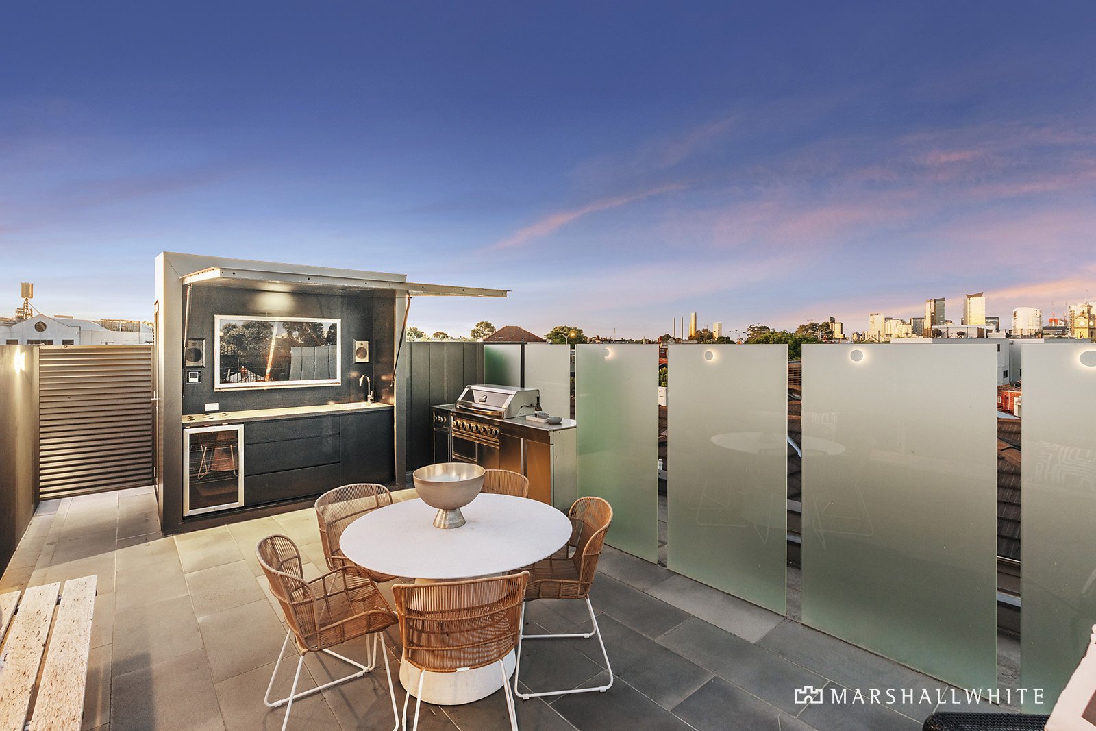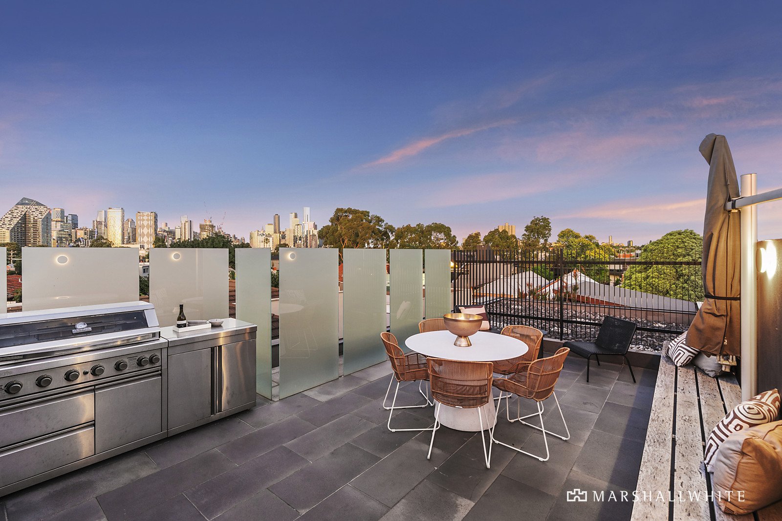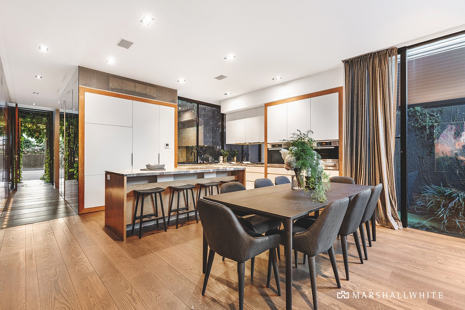 Intelligent design filters northern light from every angle, emphasised with glass walls and ceilings, contrasting beautifully with the warmth of natural timber and Bluestone underfoot. A sublime kitchen with glamorous natural stone bench tops, a walk-in pantry and an integrated Miele suite is the centrepiece of the open-plan living and dining, which embodies an elevated scale of contemporary sophistication that extends entirely through double pivot doors to the Bluestone courtyard. Entertain in style on the fabulous rooftop terrace and enjoy the city lights as you dine in style, with a BBQ kitchen and built-in bar concealed behind a gas-pump door.
