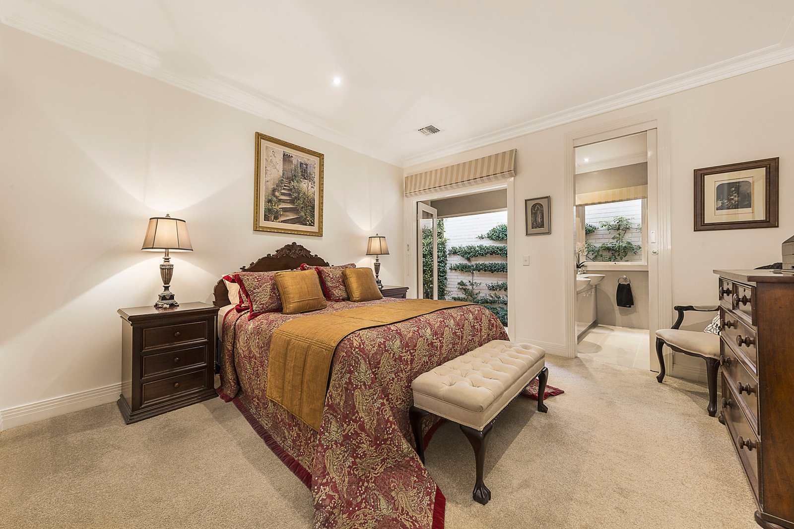 Elevated ceilings add to the sense of space in the gracious sitting and dining room which opens out to a private side courtyard featuring espaliered camellias. Parquetry floors flow through the light-filled casual living and dining room and a gourmet kitchen boasting stone benches and new Smeg appliances. Filled with fruit and citrus trees, the lush private north-facing courtyard can be covered entirely by a remote sun-awning. Intelligently designed accommodation has the beautiful main bedroom with walk in robe and designer en-suite opening to a private landscaped courtyard while two additional double bedrooms with built in robes are in a separate wing with a stylish bathroom.