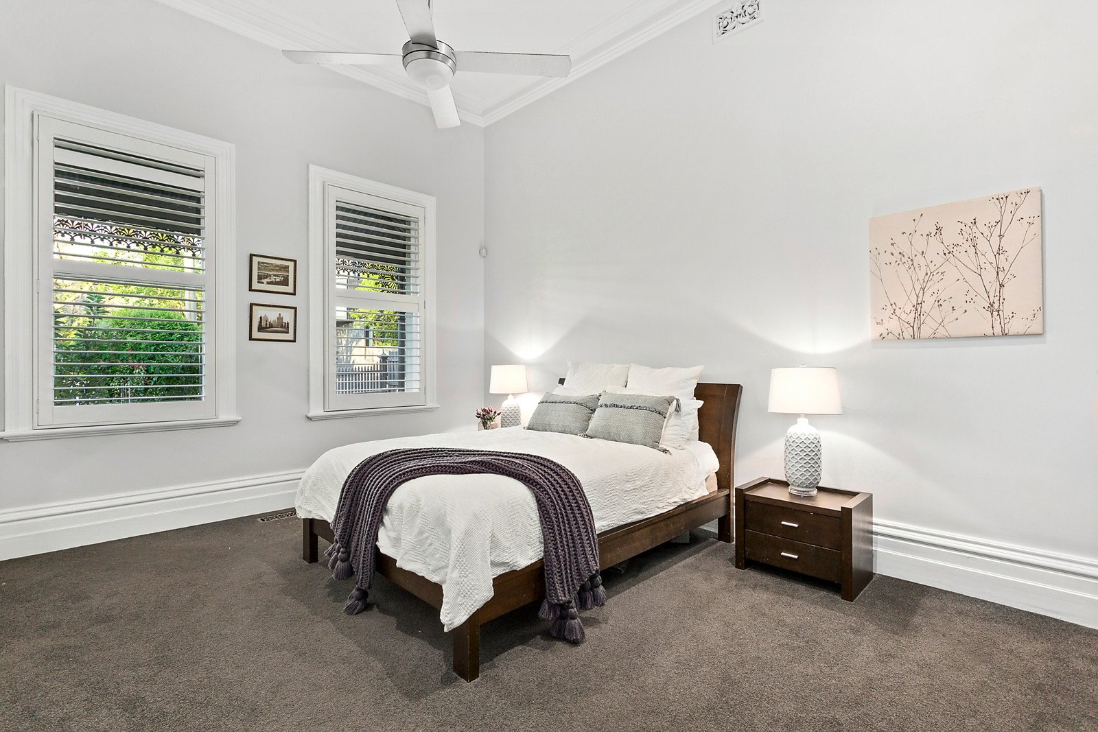 The combination of dark timber floors and high ceilings makes a wonderful first impression in the wide arched hallway and the magnificent sitting and formal dining rooms boasting two marble gas fireplaces. Two superbly proportioned bedrooms with marble fireplaces and built in robes and a third double bedroom with built in robe are matched by two stylish bathrooms. An inviting living room with gas fireplace, sublime gourmet kitchen featuring Smeg appliances and white stone benches and the light-filled family dining area open through bi-fold doors to the deep hedged private garden with a covered deck.