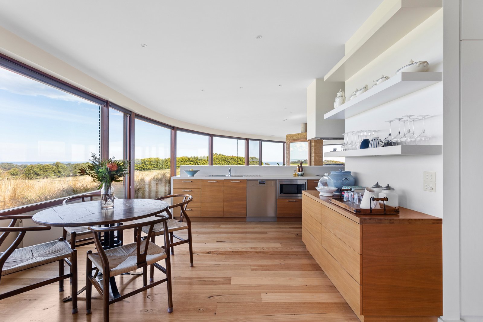 Showcasing spectacular scenery, striking design, and a premier address, this remarkable property is undoubtedly one of Flinders’ most impressive offerings. Spanning approximately 32 acres, it captures sweeping eastern vistas across the Bomboras, Phillip Island, Seal Rock and The Nobbies, with dramatic southern views stretching over Bass Strait. Designed to embrace its surroundings, the home combines rammed earth walls, fluid architectural curves, and vast expanses of glazing to frame the ever-changing landscape.