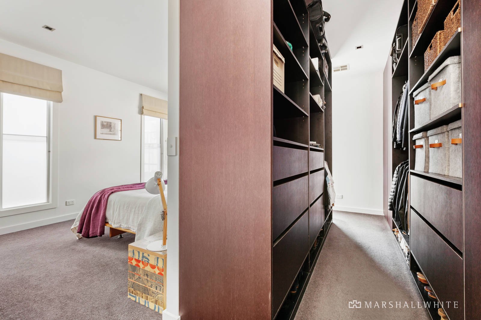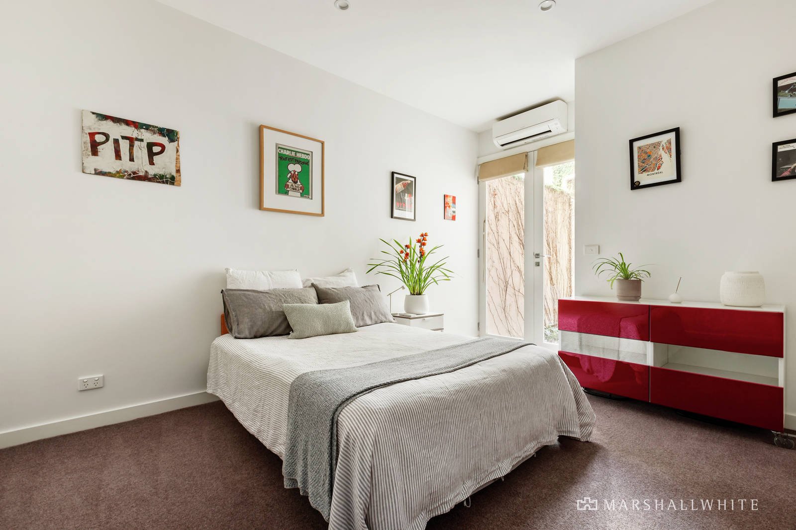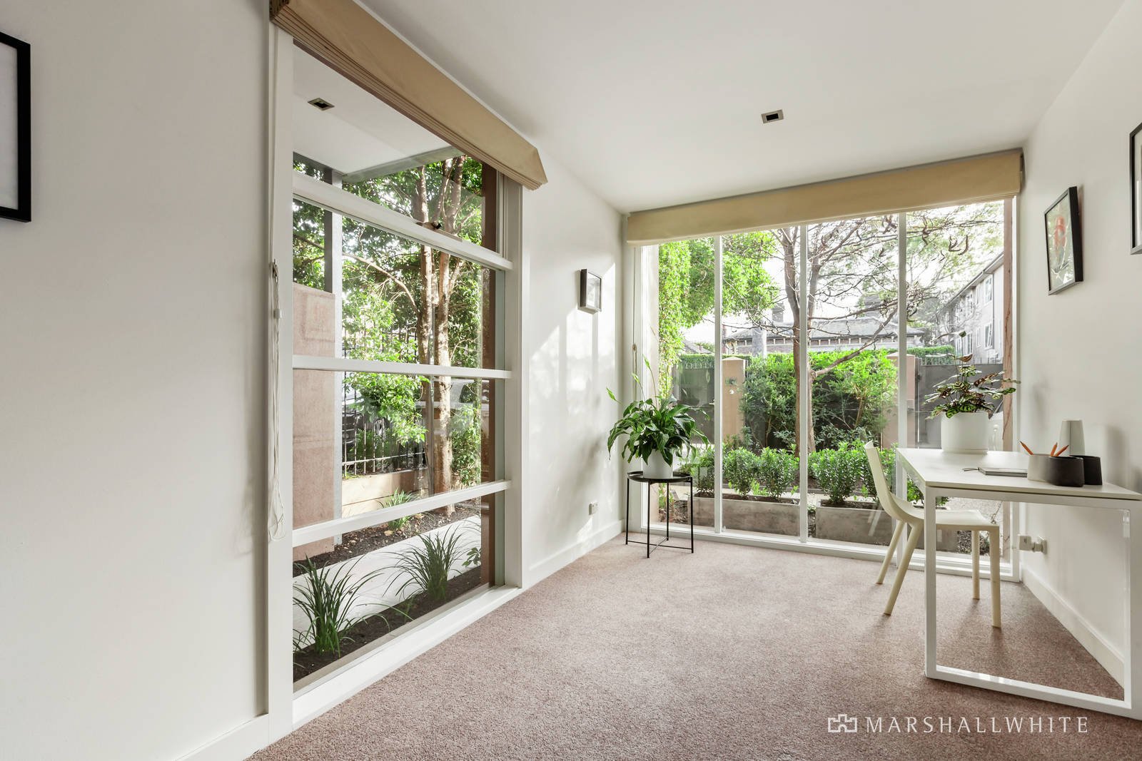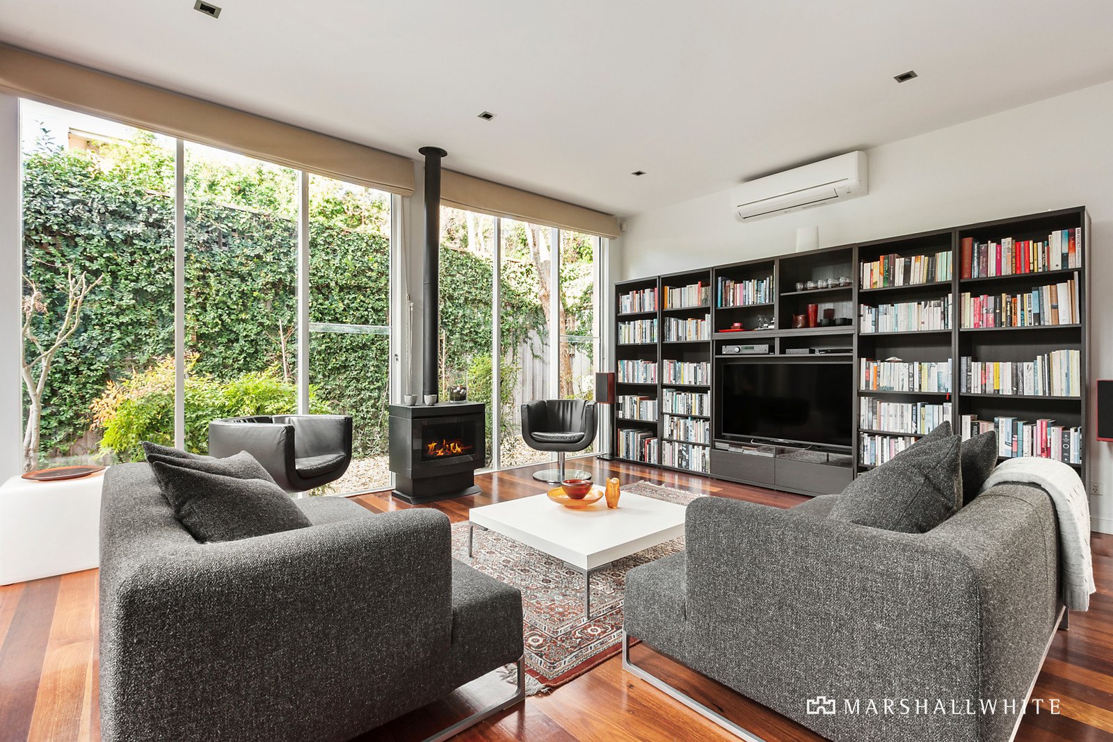 Peacefully positioned behind a high walled landscaped garden, the welcoming entrance hall featuring marble floors introduces a sun-lit home office and impressively spacious sitting and formal dining room with a gas log fire. The sleek gourmet kitchen boasting Smeg appliances and stone benches and the expansive living and dining room with a second gas log fire are bathed in year-round northern light. A series of French doors opens both the formal and family living spaces to a private north-facing garden and fabulous undercover outdoor dining terrace. A downstairs double bedroom with built in robe and en suite/bathroom opens to a private courtyard while upstairs there are two additional bedrooms with robes and west-facing balconies, a stylish bathroom and beautiful main bedroom with bespoke walk-through robes and designer en suite.