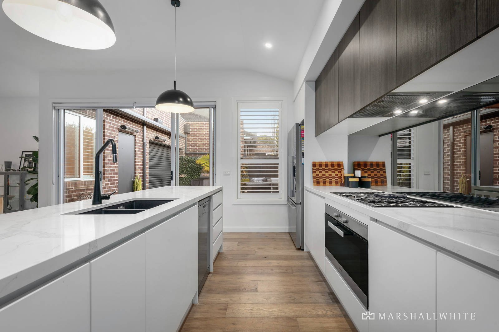 Meticulously presented 'as-new', the home's generously proportioned and light-filled dimensions are immediately apparent from the ground floor entry with towering ceilings and an open plan layout. Seamlessly connecting via glass sliding doors, the private decked and paved alfresco courtyard has a motorised awning and outdoor heating to allow for all-season enjoyment, while engineered oak flooring and plantation shutters add a coastal ambience, befitting the home's seaside location. Defined by a waterfall-edged stone island bench, the chef's kitchen is equipped with a 900mm Miele gas cooktop, oven and dishwasher, while its sophisticated style is enhanced with designer tapware, pendant lighting, and a mirrored splashback.