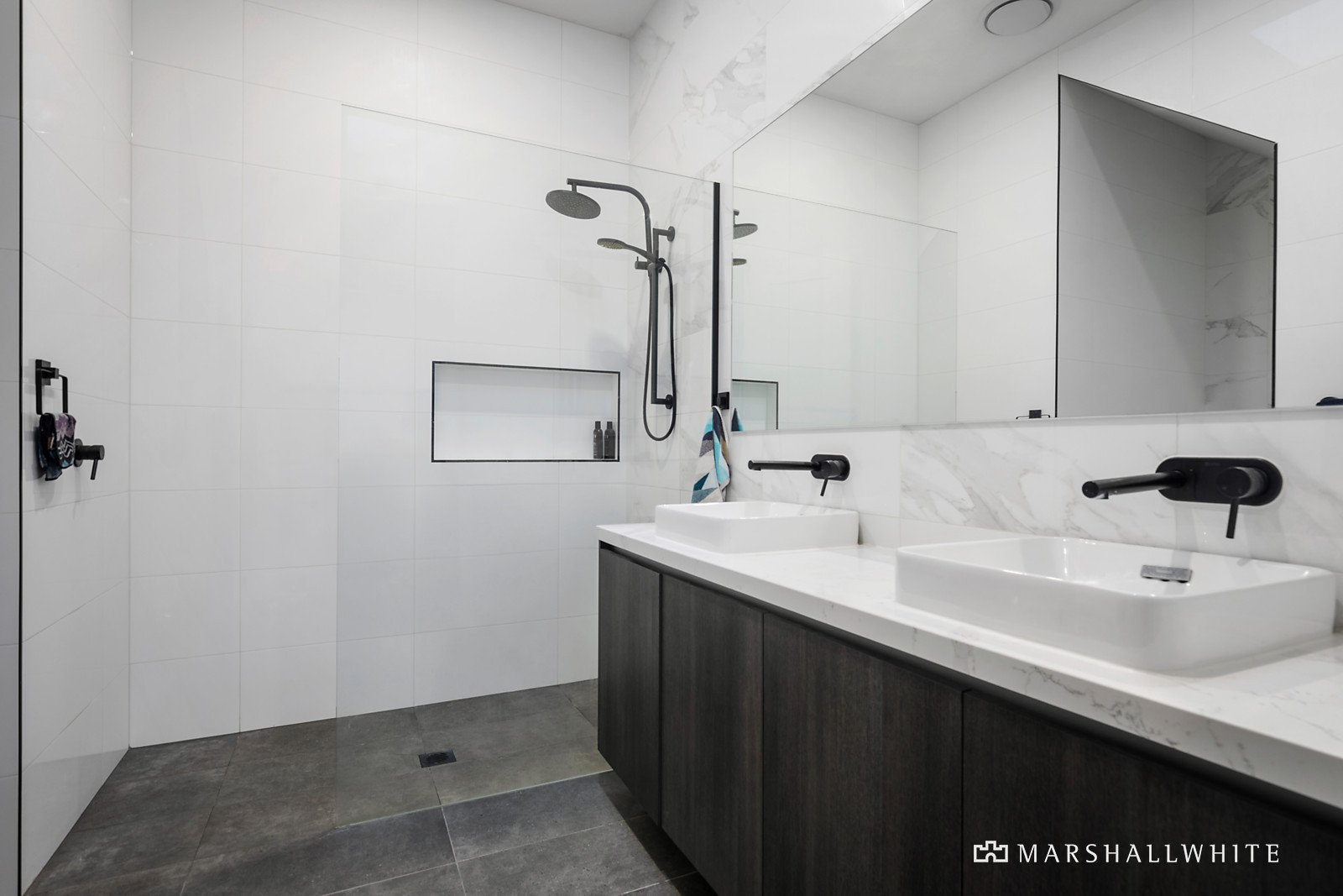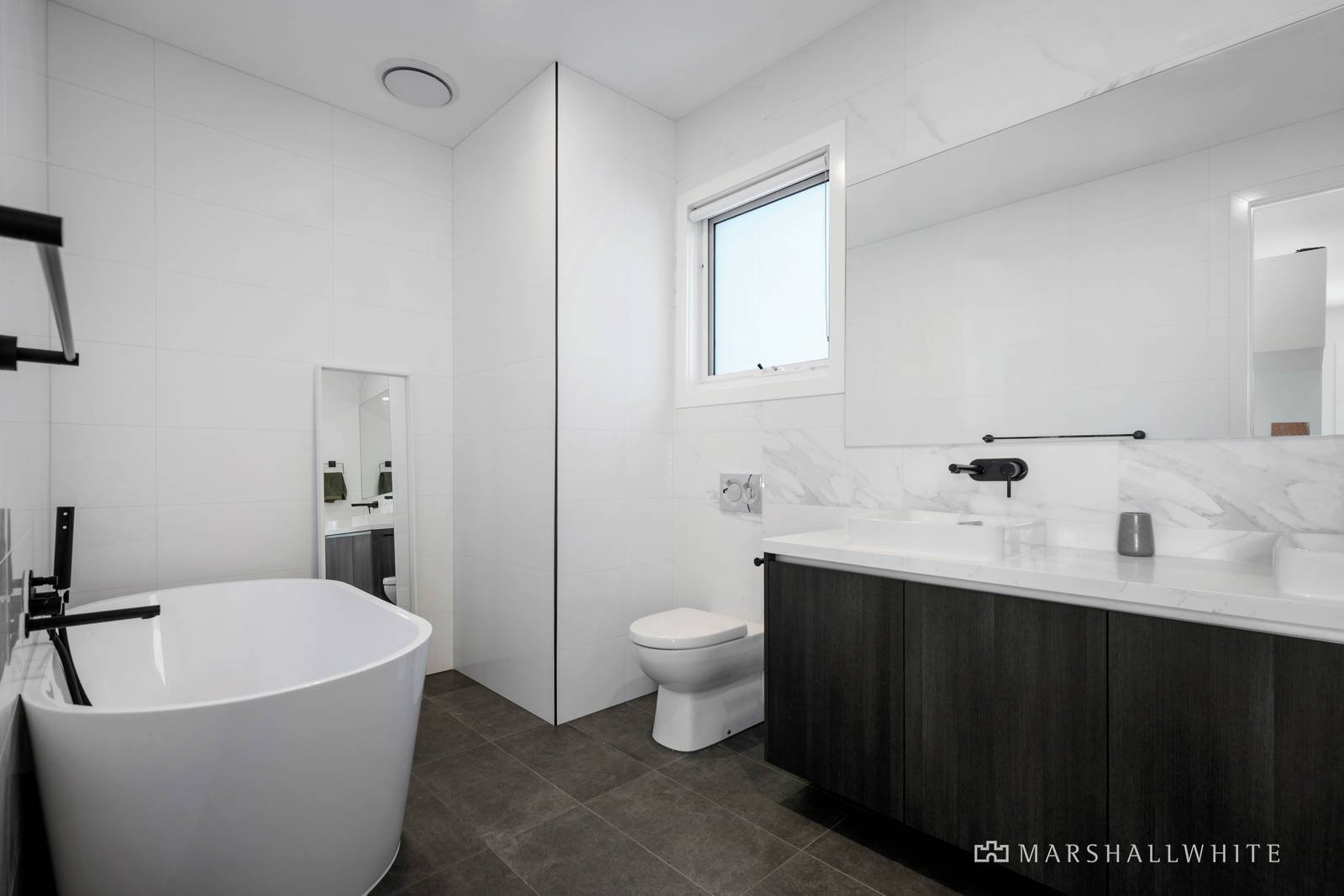 The primary bedroom suite is on the ground level, and its walk-through fitted robes and luxe fully-tiled ensuite with twin stone vanites and walk-in shower, are both illuminated by skylights. Upstairs is a second living area/retreat with a built-in desk, making it a perfect work-from-home space, and another two good-sized bedrooms, both with mirrored-door built-in robes, one with an ensuite with twin vanities and walk-in shower, while the stunning main bathroom is defined by its freestanding tub. Additional features include ducted heating, refrigerated cooling, solar hot water, double-glazing, full-sized stone laundry, powder room, security intercom, alarm system, water tank, and a double remote-operated oversized double garage with internal access, plus a roller door to the courtyard and internal access.