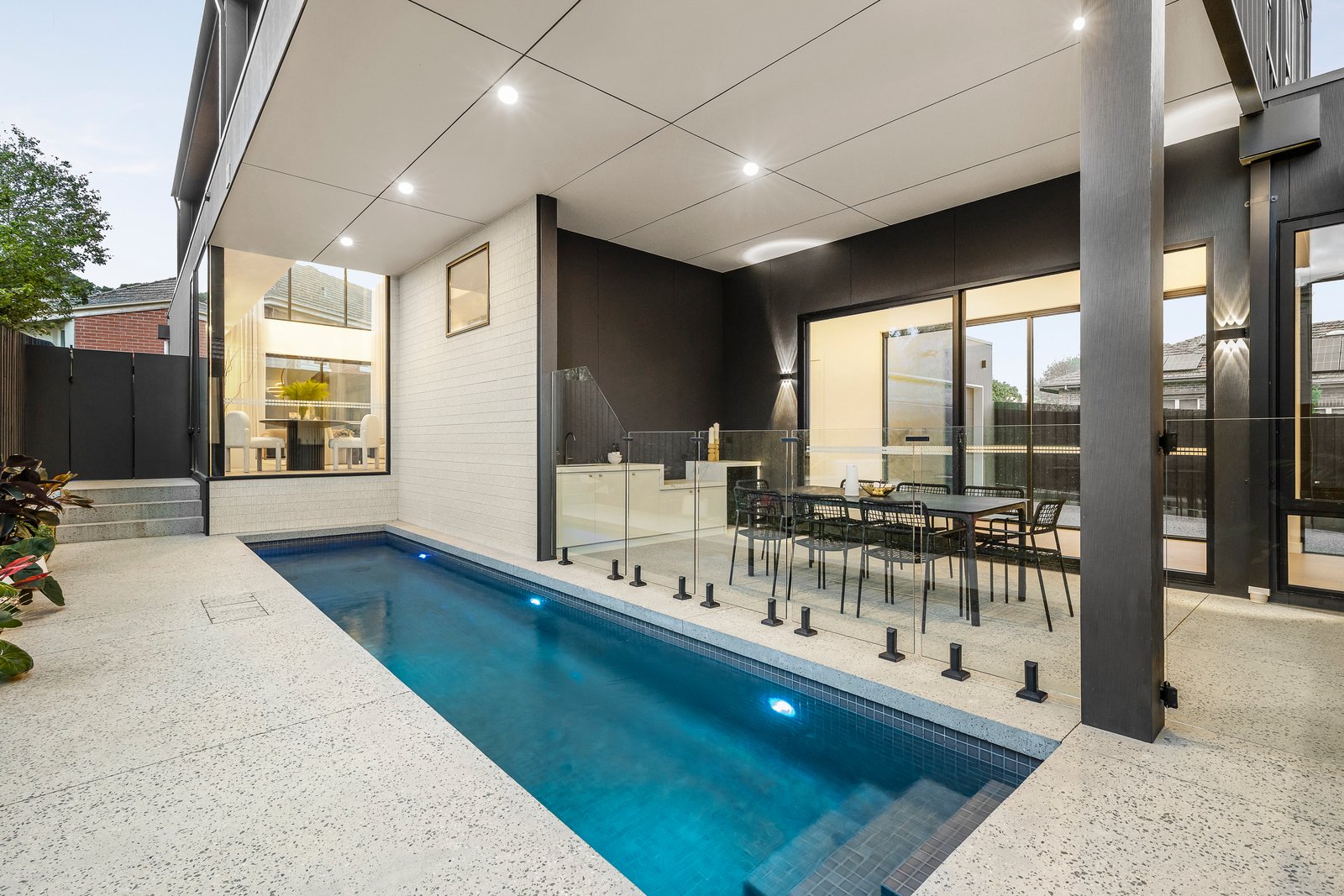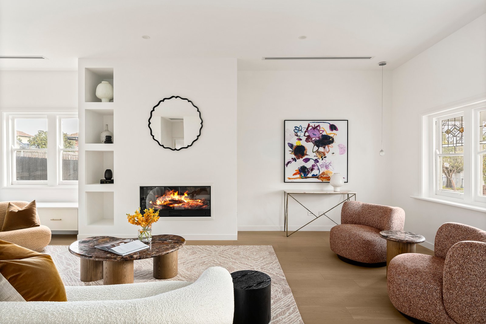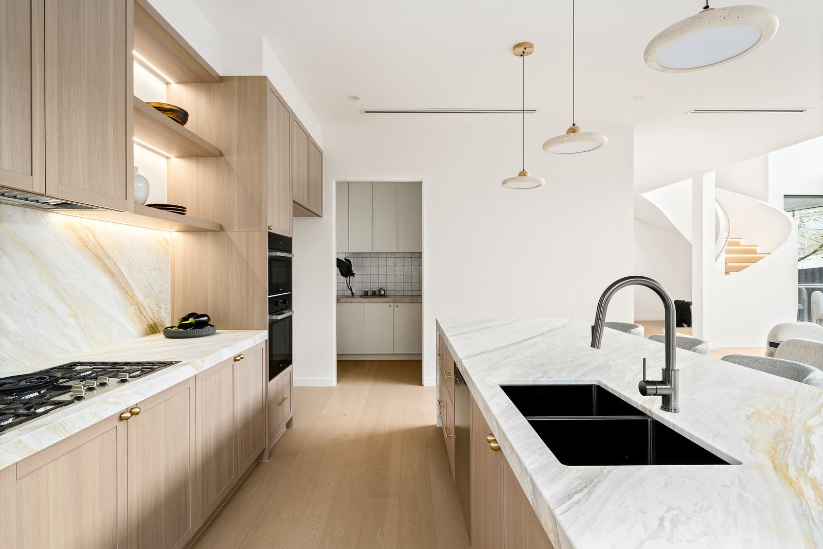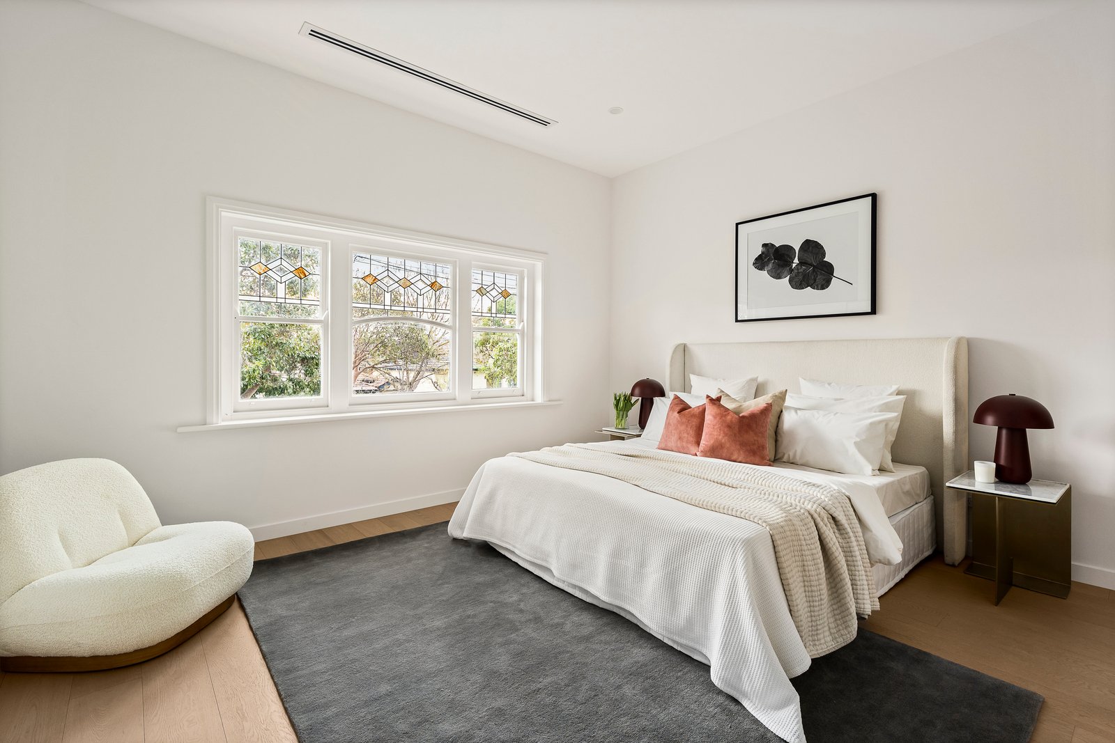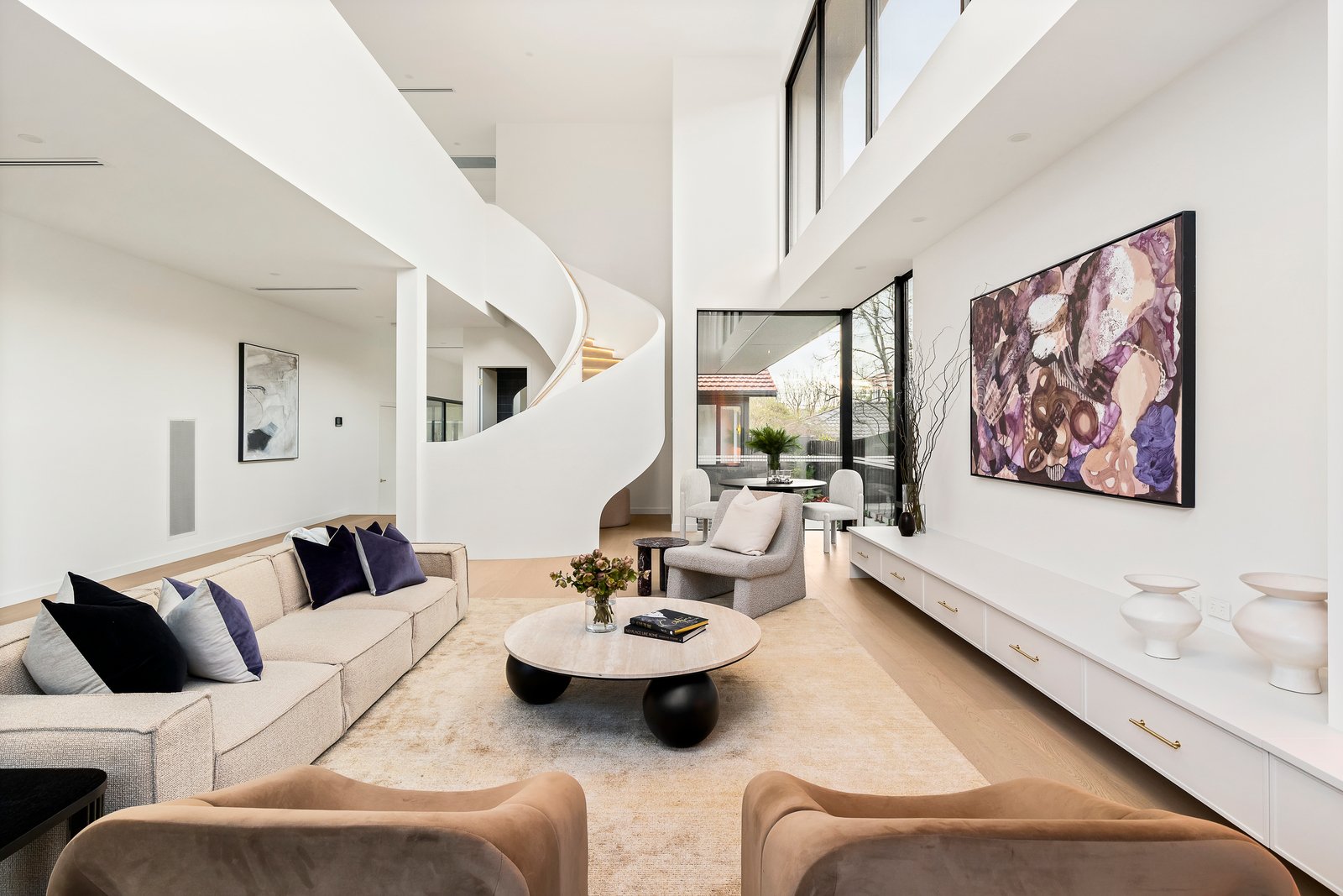 Behind the traditional exterior profile, the extension has been impressively clad in striking brushed concrete for a sophisticated, tactile and durable finish. The imposing scale of the entrance hall and sitting room with an electric log fire is enhanced by the 3.3m ceilings. Oak floors flow through to a home office and to the palatial open plan living and dining room dramatically set beneath a soaring double height void promoting year-round natural light flow. Glass sliders open to a large undercover al fresco terrace and the picturesque heat pump self-cleaning pool. Beautiful Venus Gold marble makes a bold statement in the premium kitchen appointed with a full suite of Miele appliances, bespoke cabinetry and a butler’s pantry/2nd kitchen with wine display. A guest bedroom with designer en suite and walk in robe is conveniently on the ground level while a sculptural curved staircase leads up to three additional bedrooms with robes and stylish en suites, a spacious retreat and the sumptuous main bedroom with lavish en suite, freestanding bath and walk in robes.
