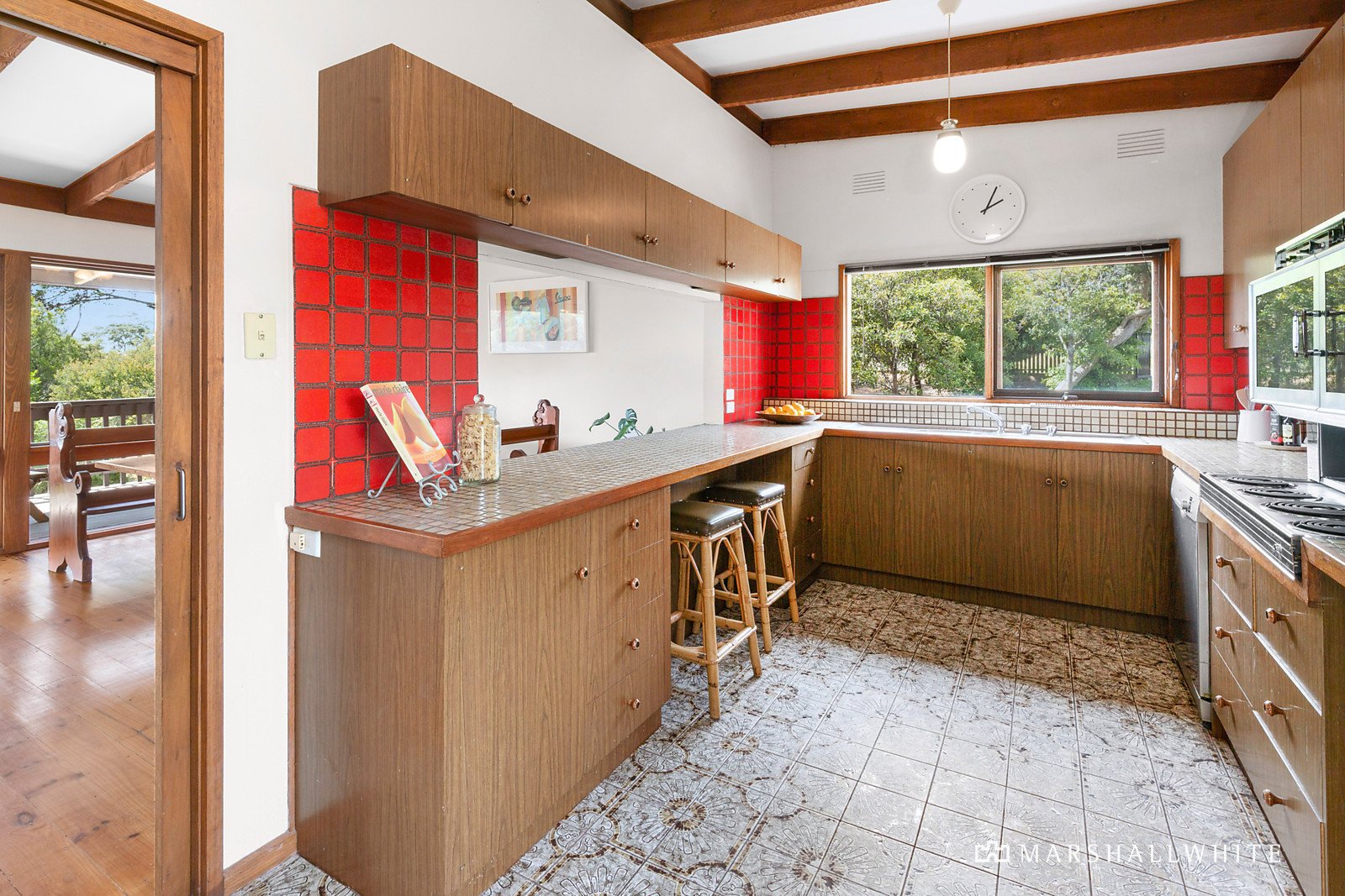 Positioned in Mount Eliza's unrivalled Golden Mile, this 1970's architectural beauty displays an untouched artistic flair perfectly reflecting that of its era, with a double-storey design accented by exposed rustic timber beams, signature timber panelling and bursts of technicolour, surprising across both levels.