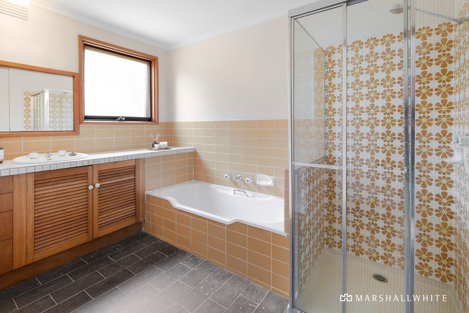 Stepping inside, original slate tiles carry the eye across a grand foyer, revealing access to a dynamic, light-laden rumpus room with adjoining bedroom (BIRs), downstairs bathroom with separate WC, designated laundry, internal garage access and separate access to the sweeping north-facing balcony. Stunning tree-top views collide with the sparkling waters of Port Phillip Bay, mesmerising in proximity and scope, whilst setting the vast and hypnotic tone for the remainder of the home.