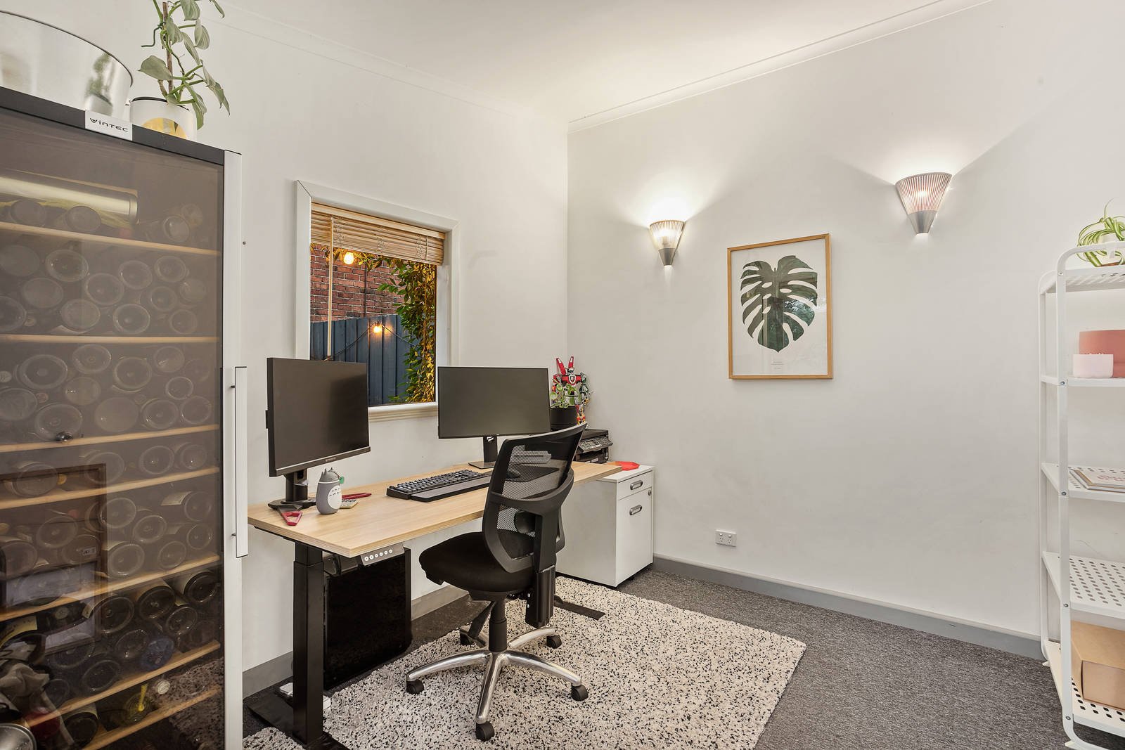 Traditional high ceilings are paired with parquetry floors in the arched entrance hall which flows through to a generous living room with Baltic pine floors and a marble open fire. The sleek gourmet kitchen appointed with stone benches and a 90cm Ilve oven and a gorgeous dining area beneath a spectacular light-fitting open to the private north-facing paved garden with a studio/home office, outdoor toilet and secure off street parking for 2 cars. The three very spacious bedrooms, all with Baltic pine floors and built in robes share a modern bathroom.