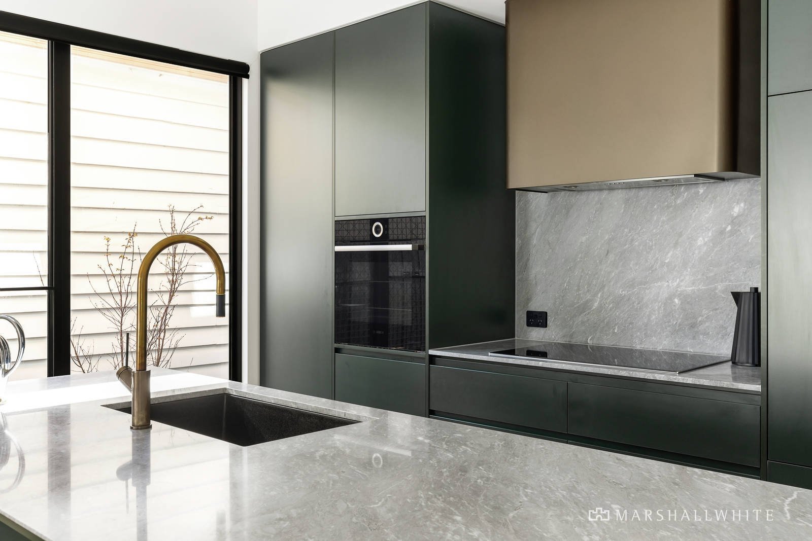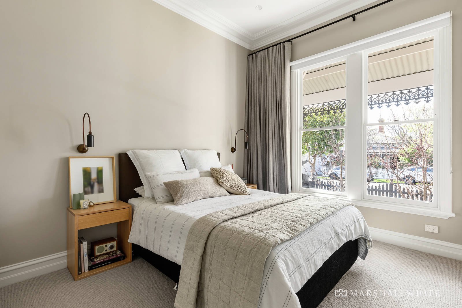 Completed less than a year ago, the block-fronted facade reveals an interior resplendent with traditional high ceilings, bespoke joinery, limed oak floors and elite marble finishes. The arched hallway flows through to the beautiful main bedroom with built in robes and a designer marble en suite, two additional double bedrooms with robes and a stunning bathroom with bath. Beneath an evocative curved vaulted ceiling, the light-filled open plan living and dining room features a sleek gourmet kitchen appointed with marble benches, Bosch appliances including induction cooktop, a copper wrapped exhaust and integrated fridge/freezer. Fully opening glass sliders extend the living out to a serene northwest facing sanctuary designed by Andrea Clements with stone pavers amidst greenery providing off street parking via the rear lane.