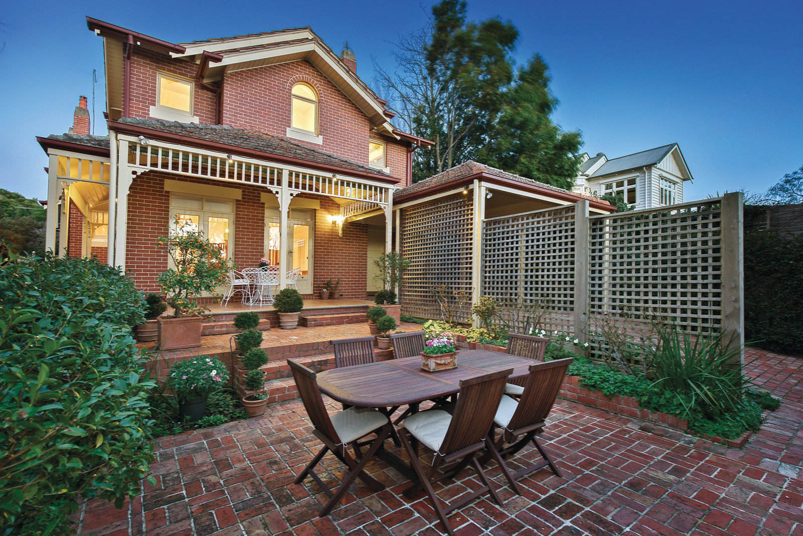The interior features an entrance hall opening to a formal sitting room with bay window, beautiful adjacent dining room, two downstairs bedrooms, main with WIR and ensuite plus a family bathroom. Through to a warm timber kitchen with granite bench-tops, Bosch and Miele stainless steel appliances and dining leading to the two upper level family bedrooms and a second bathroom; plus lower level laundry, WC and living room flowing to a wrap around verandah. Which overlooks a lovely garden with brick paved outdoor dining, tranquil water feature and lines of ornamental trees and camellias. Other features include period-style bathrooms, ducted heating, original OFPs, R/C air conditioners (meals/living & upstairs bedroom), upstairs tree-top views and City skyline glimpses, rear lane remote roller door to a double carport with internal access.