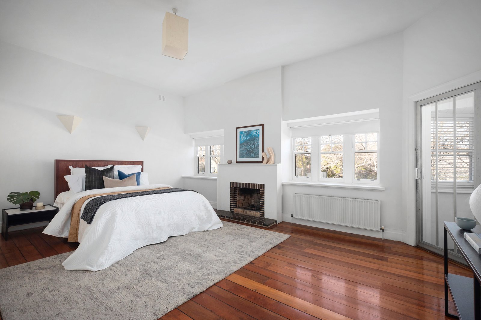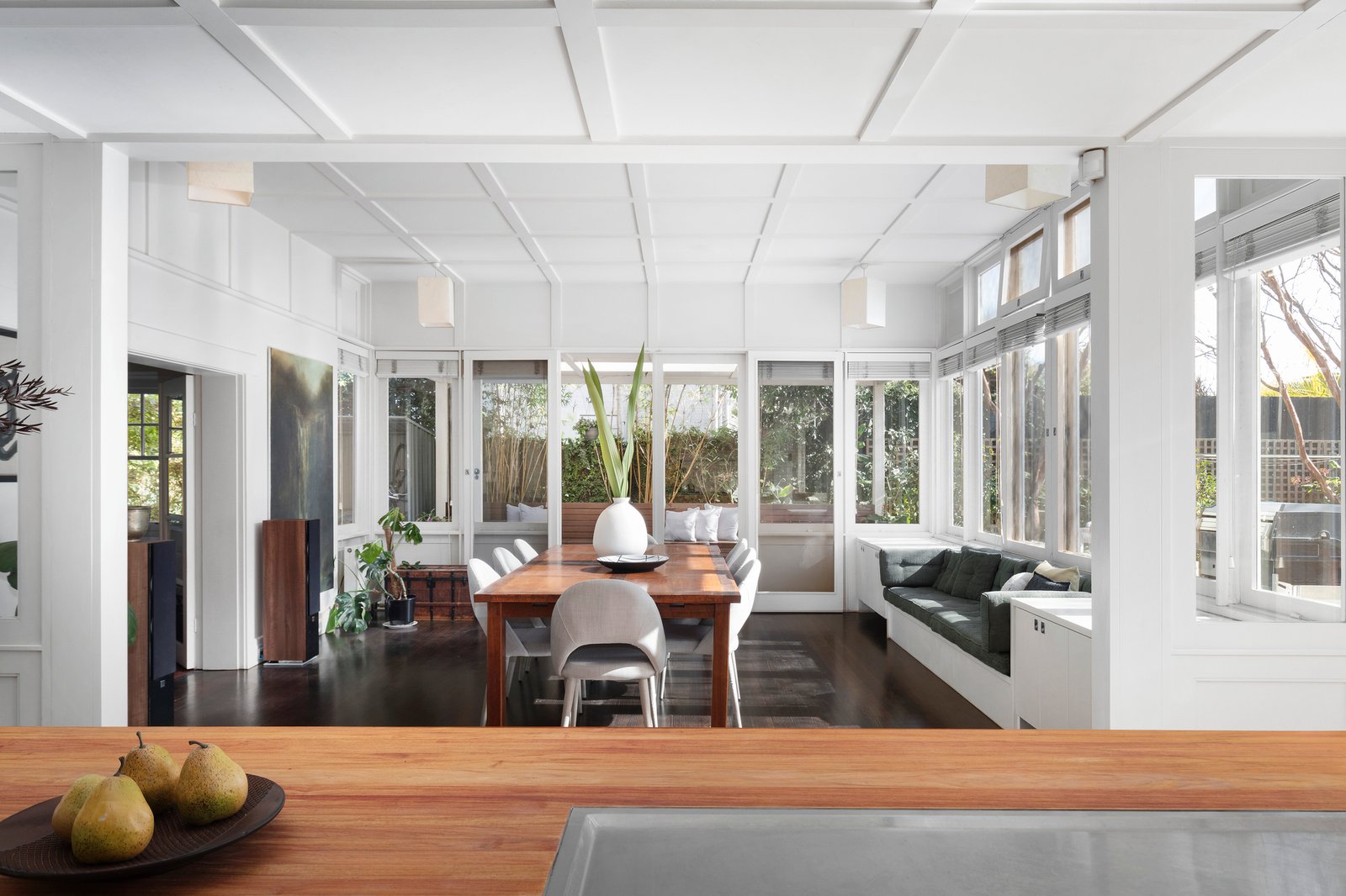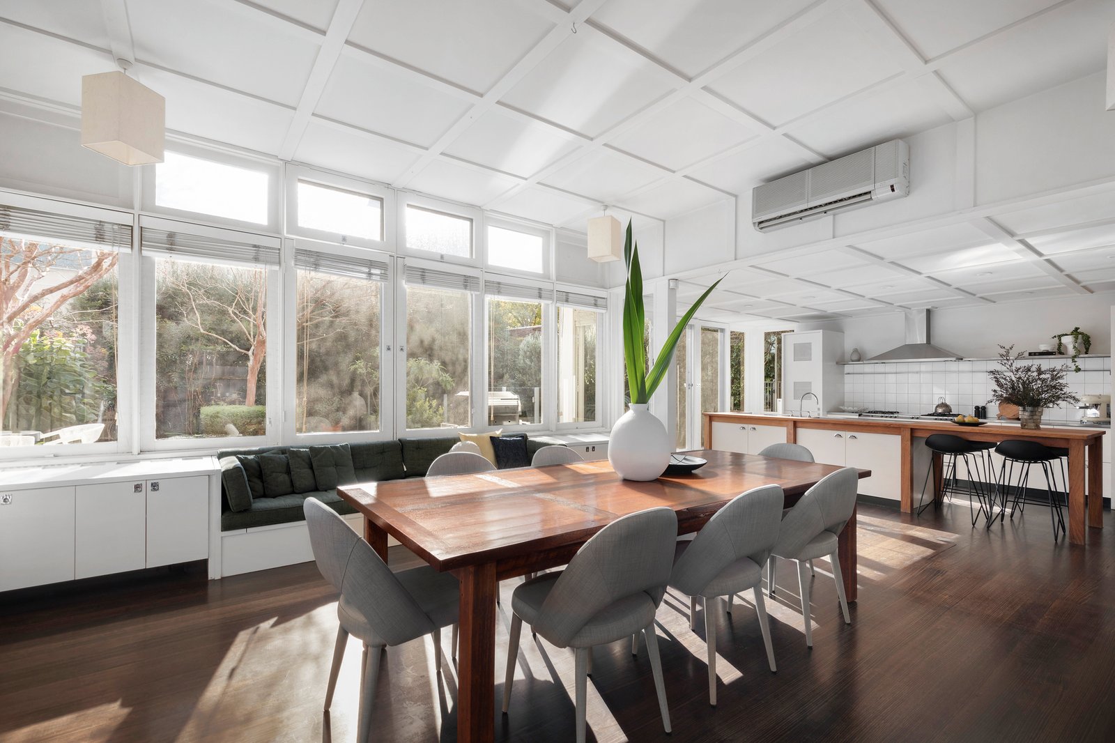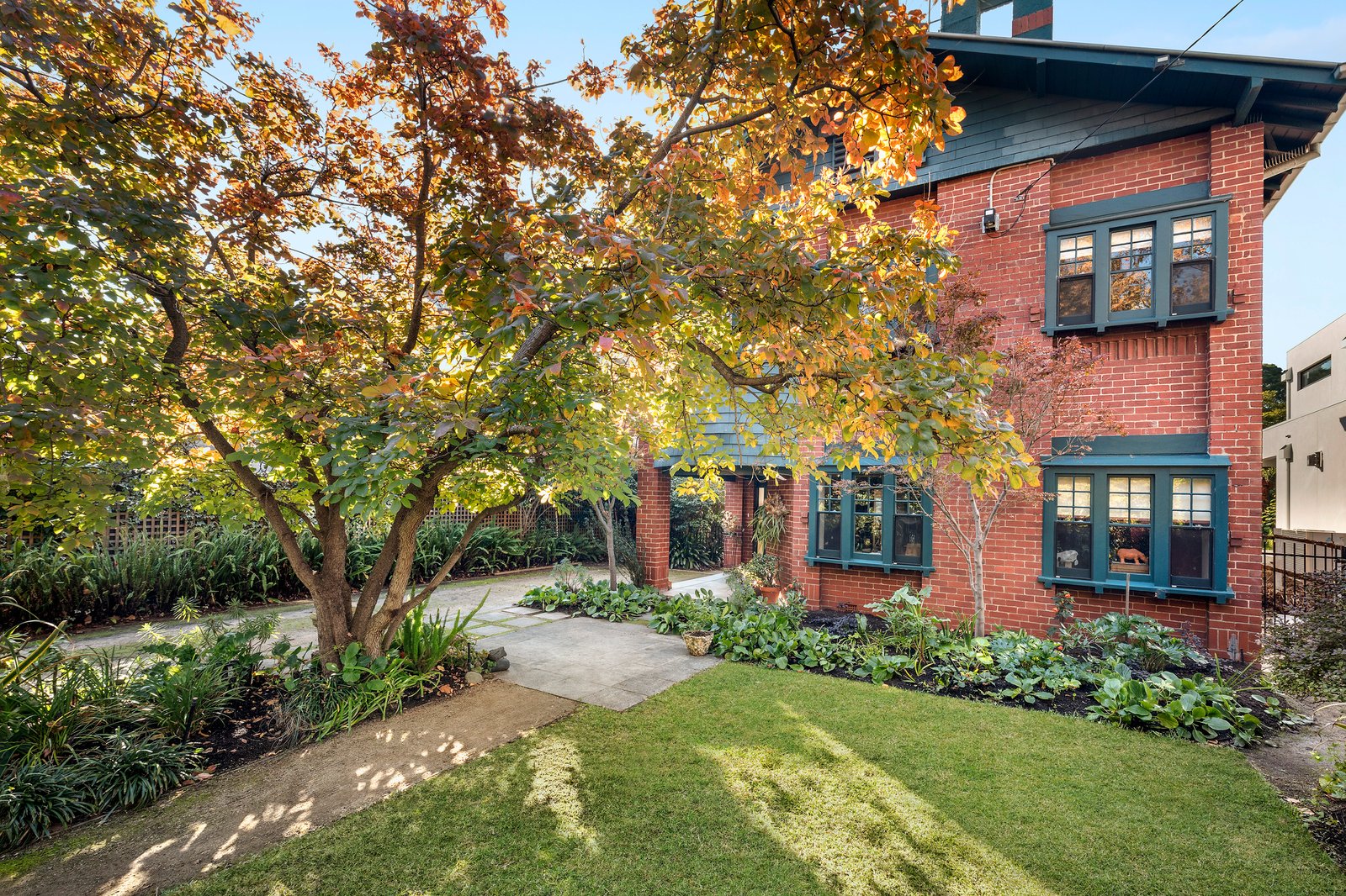Verdantly surrounded by all-seasons designer gardens, the double-storey Arts & Crafts style solid-brick residence is securely set behind automated gates. On the market for only the second time since its construction, the original home underwent a major renovation and rejuvenation in the early 2000s inspired by the design aesthetics of illustrious Scottish architect Rennie Mackintosh. The timeless result is a harmonious fusion of period and modernist sensibilities showcased with polished original Kauri timber flooring on both levels, signature Mackintosh style accents throughout, a showstopping custom timber staircase, box bay and leadlight windows, lofty ceilings with strapping detail, and a high-spec minimalist kitchen defined with a refectory-table-inspired island bench.