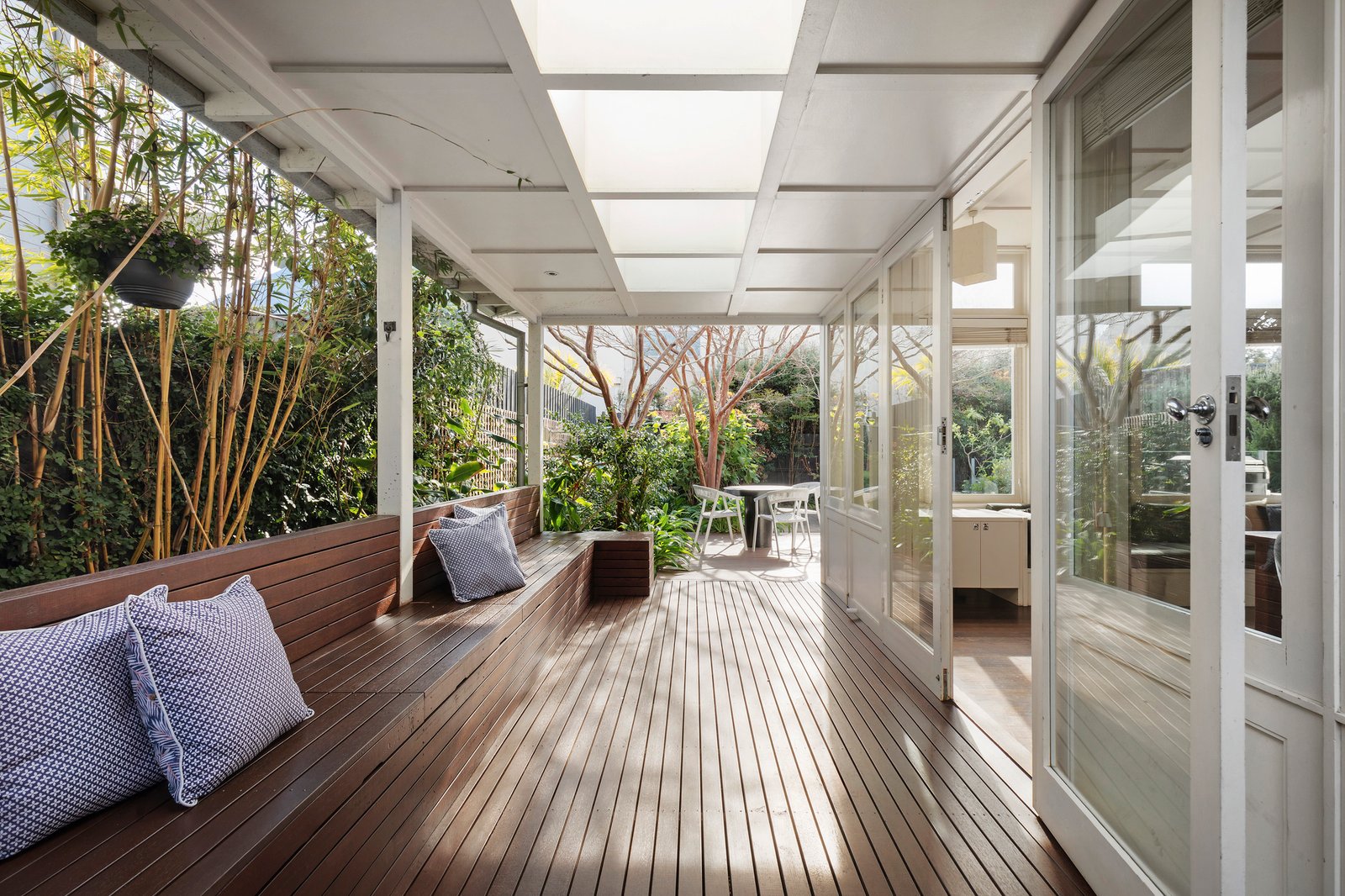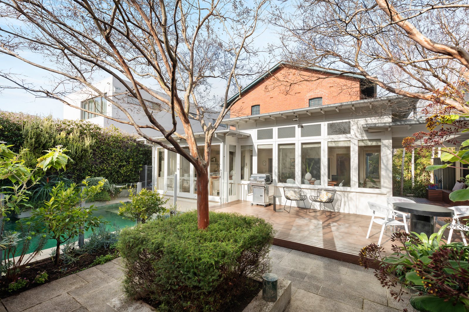 Luxuriously light-filled, the abundantly glazed north-facing open-plan culinary and main living area connects to a wrap-around alfresco deck with an undercover zone, and a delightful courtyard garden with a paved dining terrace. Completing the idyllic outdoor entertaining amenities is a solar-heated step-in immersion pool, edged with glass mosaic tiles and surrounded by lush greenery.