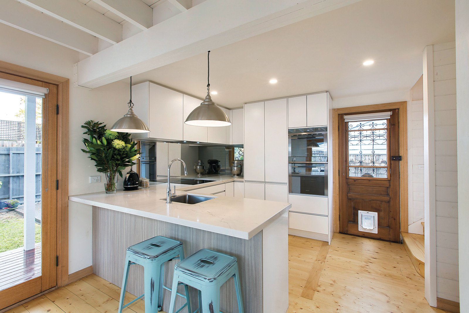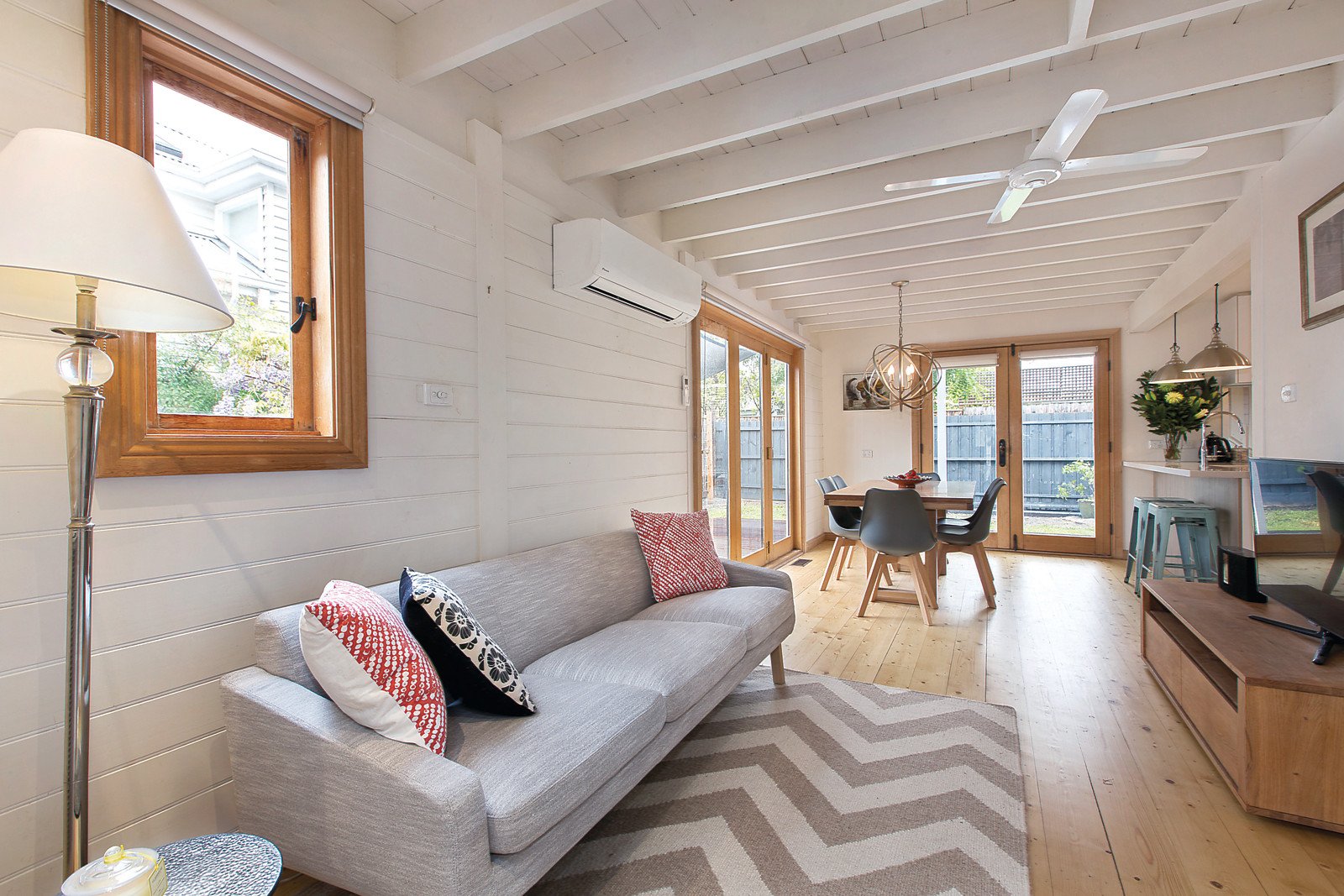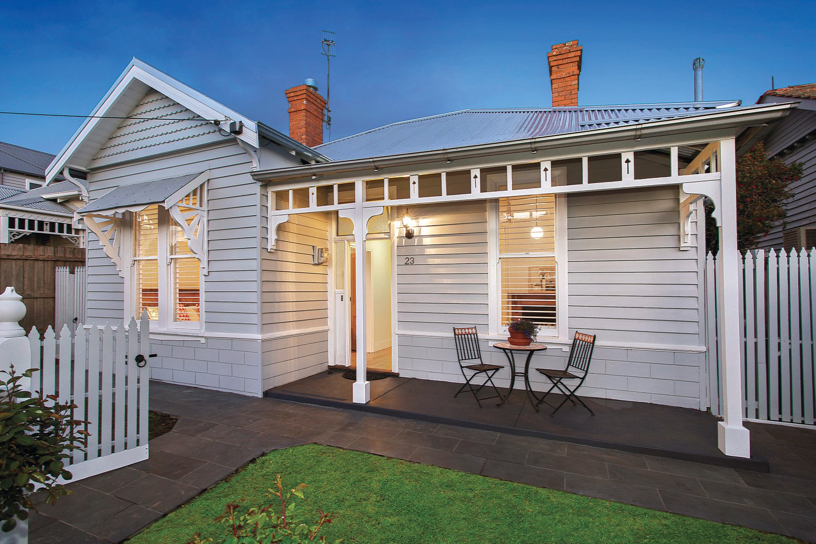 Just completed renovations have transformed this Edwardian timber home into a smart and chic living environment introduced by a distinctive grey and white trimmed façade. The stylish interior over two levels features white walls and woodwork plus subtle period attributes including ceiling roses, cornice, hard wax oil finished Baltic Pine floors, and OFPs. The central entrance hall opens to three downstairs bedrooms with BIRs, pristine bathroom and laundry with WC; flowing to a sitting room with gas FP and informal living/dining room (both opening to a north-east facing wrap-around deck with shade sail) and incorporating a sleek kitchen with CaesarStone benches and prestige Smeg stainless steel appliances - providing sunny and private spaces for indoor/outdoor entertaining. Upstairs, the beam pitched roof main bedroom has a rear balcony, sparkling ensuite and WIR. Other features include easily manageable gardens, ducted heating, R/C air conditioning, 2,000ltr rain water tank, off-street parking with auto gates and rear lane access.