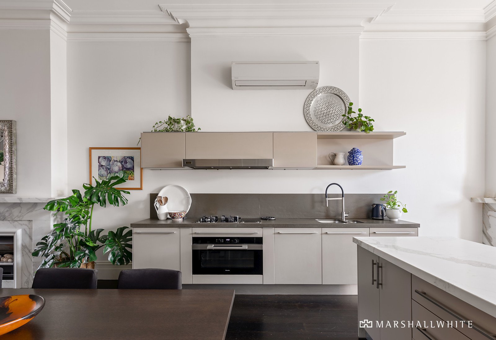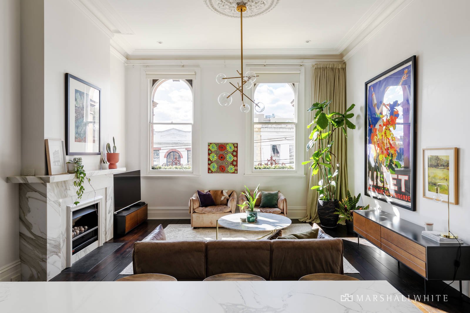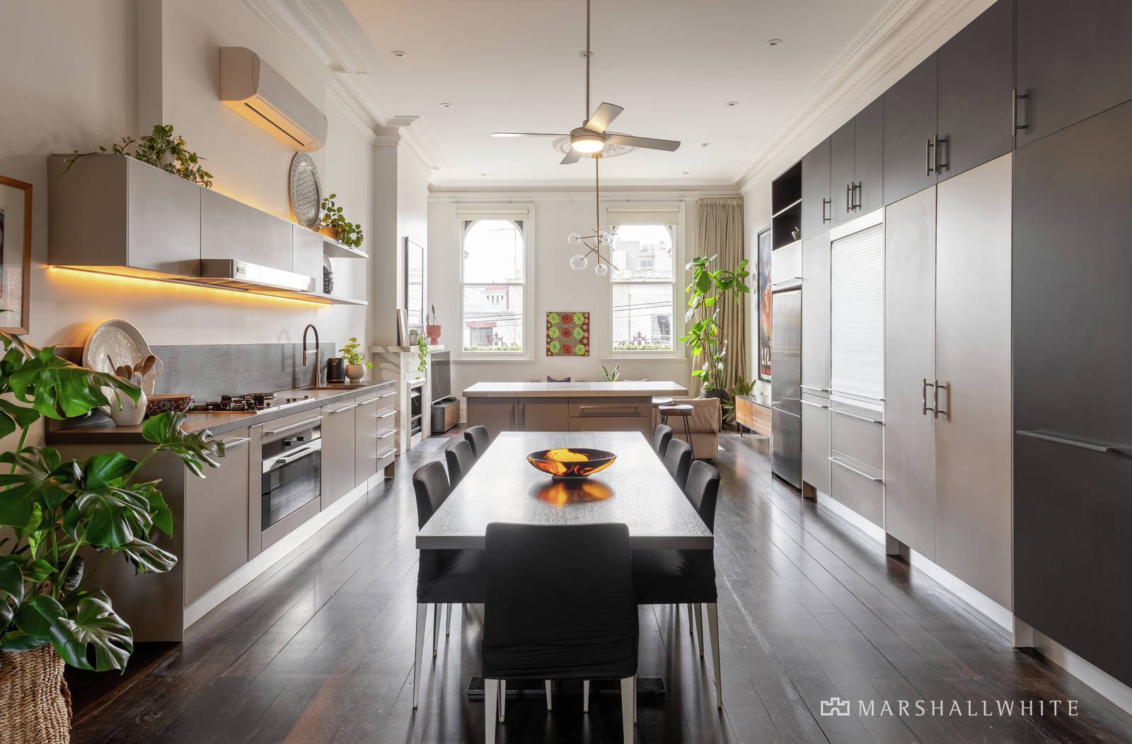 Soaring 14-foot ceilings and large north-facing windows bring light and views into the open plan living areas, which are flanked by two Calcutta marble gas fireplaces. The kitchen has striking Poliform cabinetry, Miele appliances, a moveable kitchen bench and myriad storage options. The three large bedrooms with built-in robes and two stylish bathrooms are complemented by a private study nook for work at home convenience. Additional insulation was added to the floor and walls to ensure a quiet and energy efficient environment. The video gate intercom system provides security and reverse cycle heating and cooling system ensures year-round comfort. The title also boasts a rare off street car park on title as well as permits for local parking.