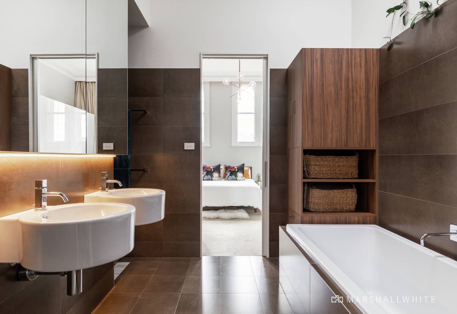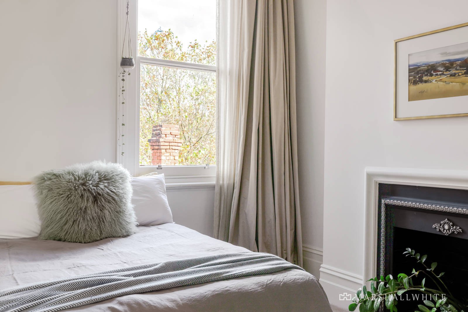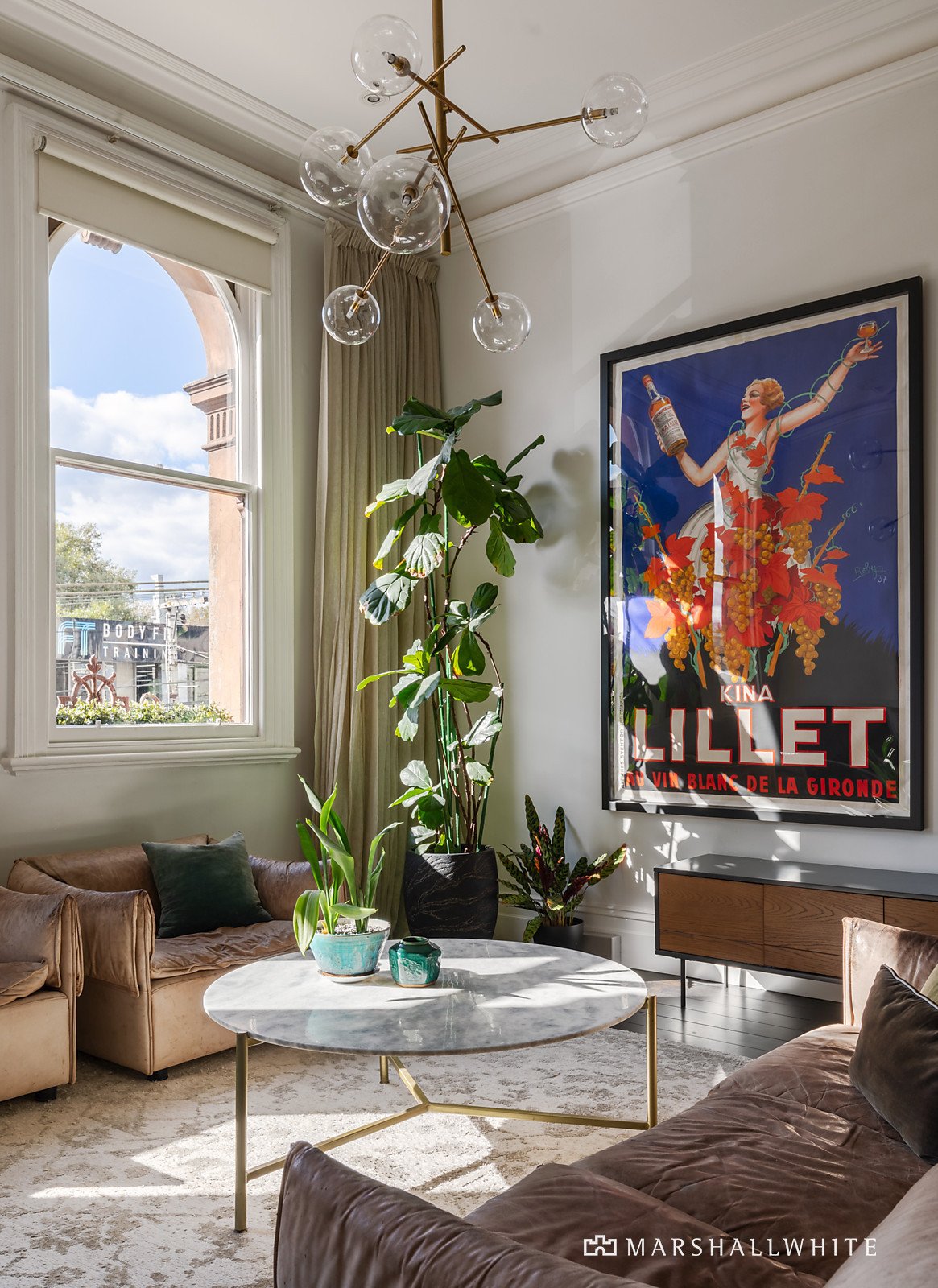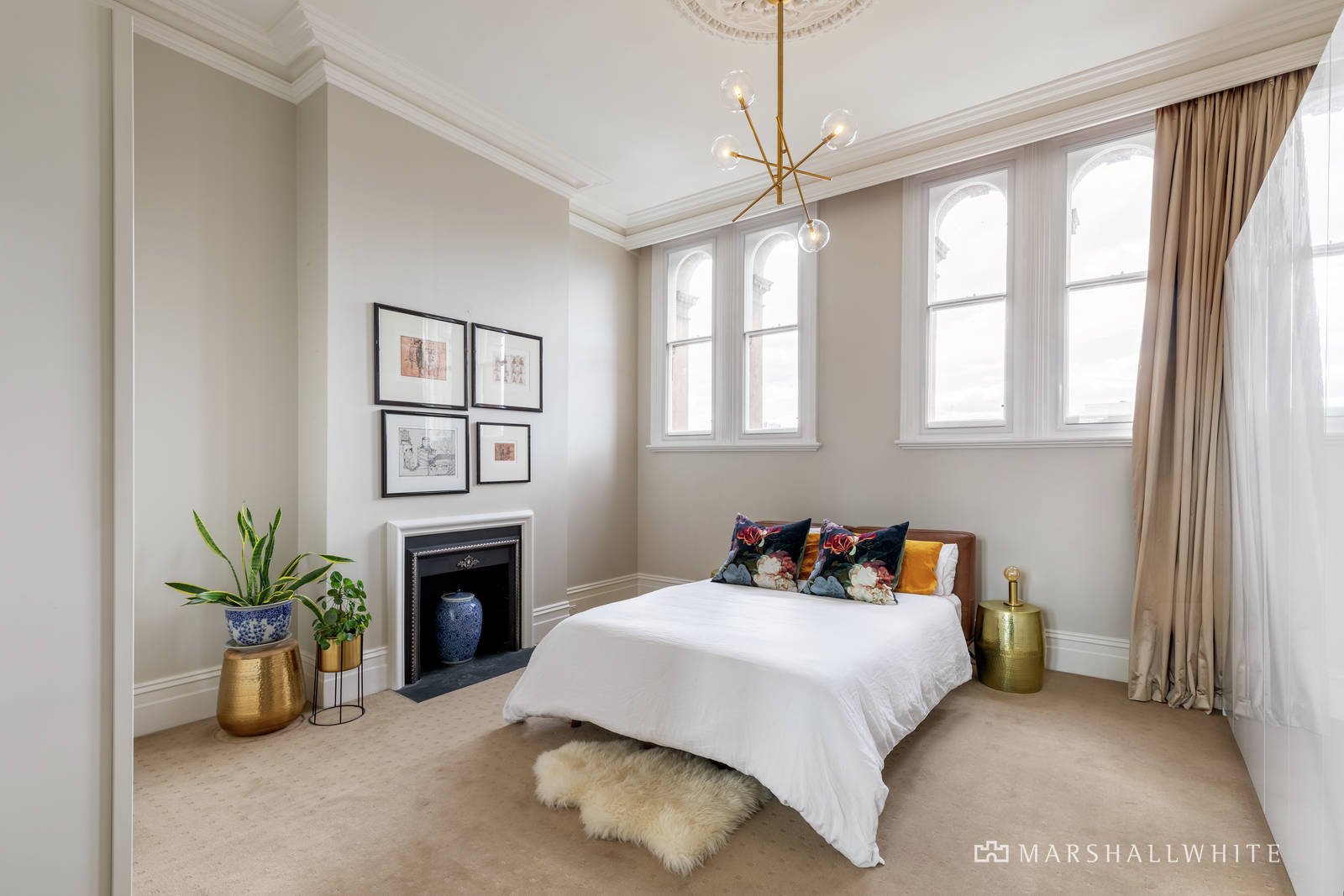 Soaring 14-foot ceilings and large north-facing windows bring light and views into the open plan living areas, which are flanked by two Calcutta marble gas fireplaces. The kitchen has striking Poliform cabinetry, Miele appliances, a moveable kitchen bench and myriad storage options. The three large bedrooms with built-in robes and two stylish bathrooms are complemented by a private study nook for work at home convenience. Additional insulation was added to the floor and walls to ensure a quiet and energy efficient environment. The video gate intercom system provides security and reverse cycle heating and cooling system ensures year-round comfort. The title also boasts a rare off street car park on title as well as permits for local parking.