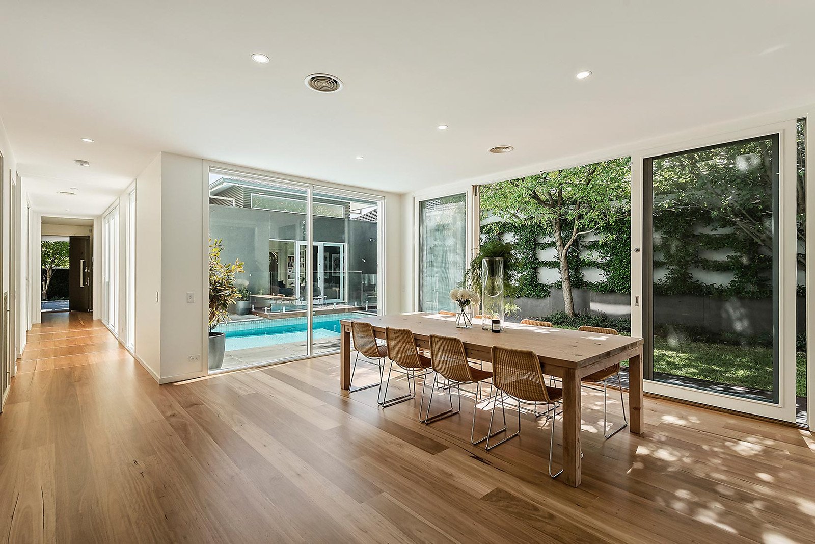 Expansive proportions, hardwood floors and an abundance of glass, the intelligent floor plan is oriented to capture northern light and garden and pool vistas from every room. A generous library with access to the lush leafy forecourt and the street is the perfect home office while an oversized media room with ultra-high ceiling is a wonderful entertaining room that extends out to a deck and the pool. A refined sitting room overlooking the pool complements a light-filled dining space. The palatial open plan living room with a gas log fire and sublime gourmet stone kitchen appointed with Miele appliances opens out to a large entertaining deck, solar heated pool and landscaped surrounding greenery which includes espaliered Jasmine. The gorgeous main bedroom with walk in robe and en suite enjoys city views. Also upstairs, there are three additional bedrooms with robes, a stylish family bathroom and very spacious retreat. Enviably situated in the Gascoigne Estate walking distance to Central Park, Wattletree Rd trams and shops, good schools and Malvern station, it is comprehensively appointed with keyless entry, alarm, video intercom, heating/cooling, 3rd bathroom, laundry, irrigation, water tank, ample storage and internally accessed double garage. Land size: 711sqm approx.