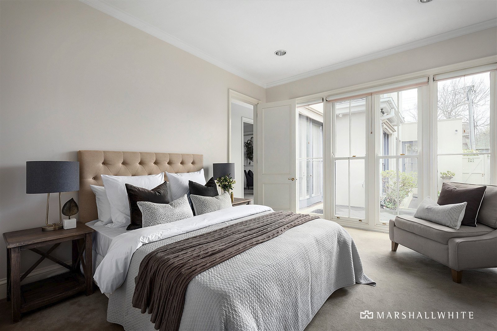 Two of the bedrooms benefit from ensuites - downstairs also with built-in robes and delightful vistas of both the courtyard and the deck, upstairs with walk-in robes, as well as a stone-topped vanity and heated towel rail. Accessed securely via intercom entry, the home also presents an internally accessed double lock-up garage and a third bathroom adjacent to the third bedroom, plus there is a powder room, central heating and air conditioning.