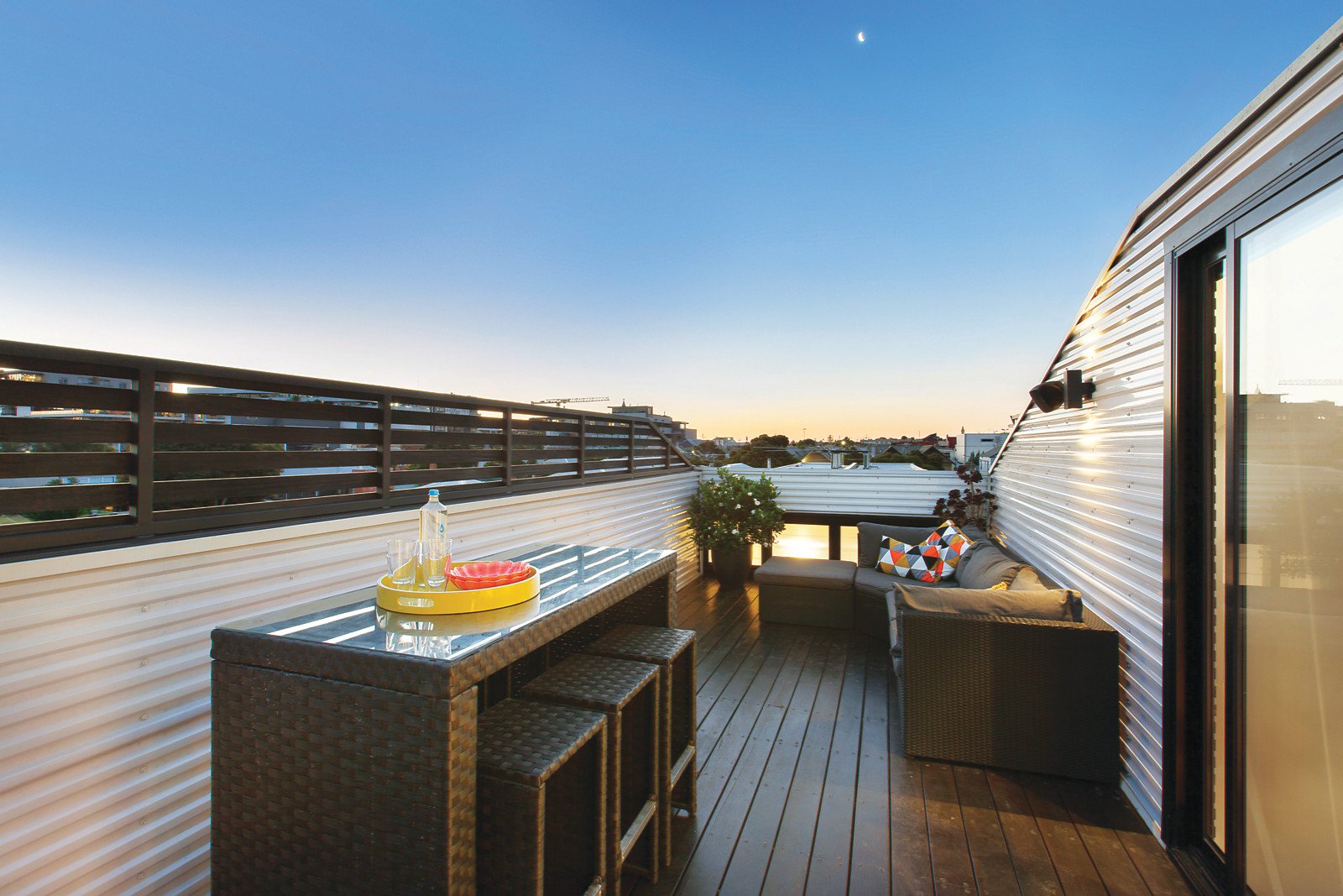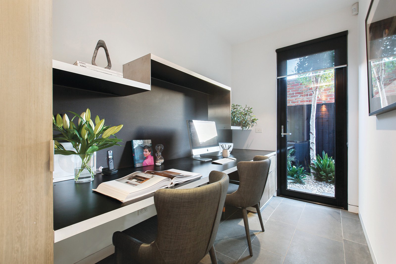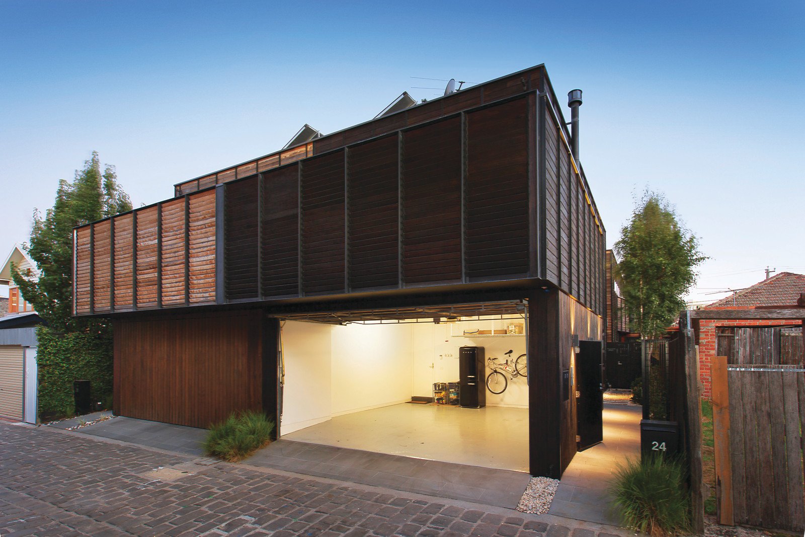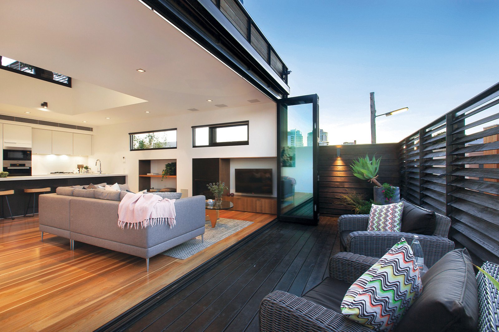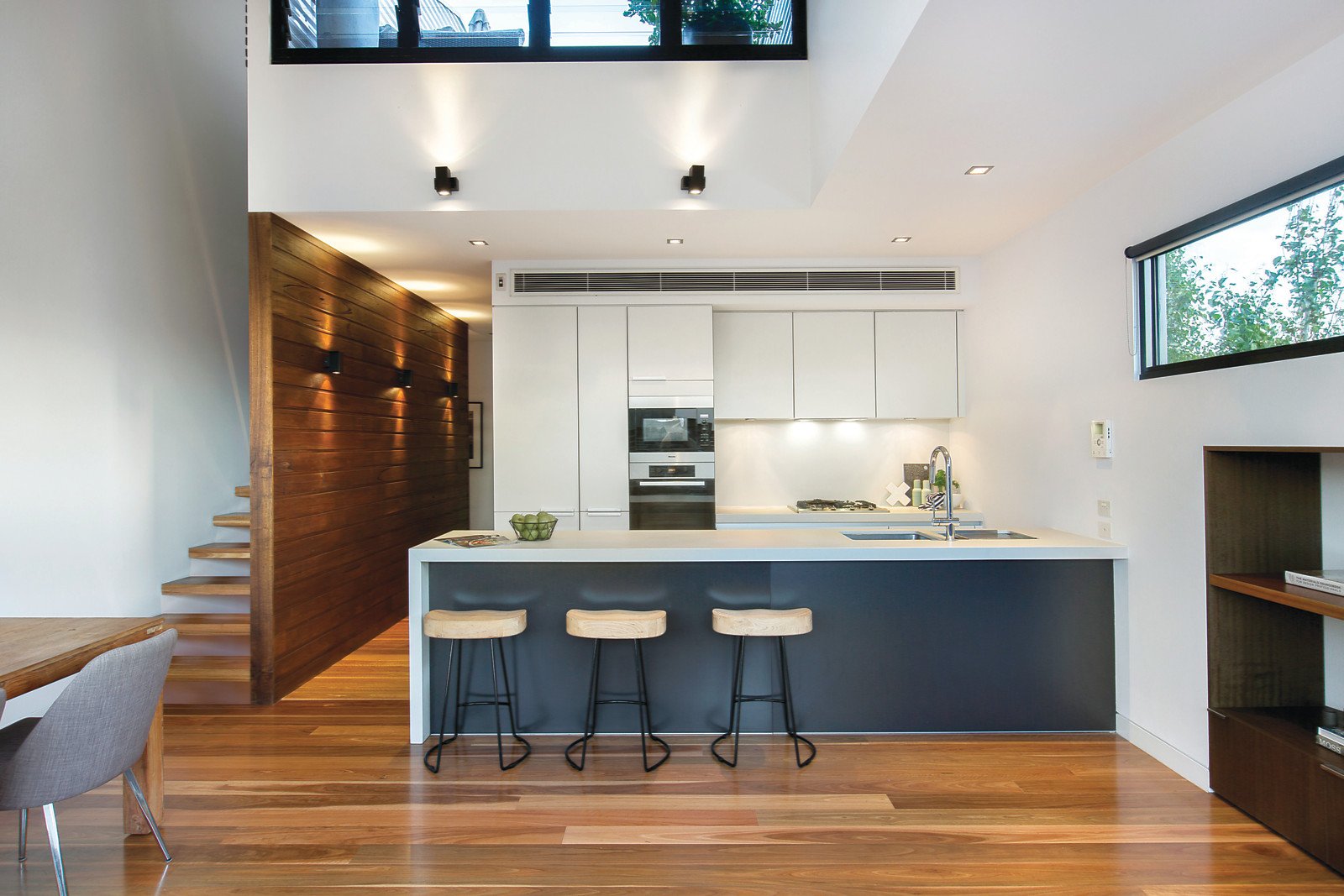 Behind a striking dark timber façade, Silver Ash feature walls and Bluestone and Spotted Gum floors create an inviting palate inside. A soaring raked ceiling accentuates the natural light flow and sense of space in the open plan living and dining room with a gas fireplace and a sensational Poggenpohl gourmet kitchen boasting Italiana Quartz stone benches, Miele appliances and integrated Liebherr fridge/freezer. Bi-fold doors open to a wide private north-facing balcony, ideal for entertaining. The gorgeous main bedroom with designer en-suite, built in robe and a fitted study are on the ground level while the second double bedroom with built in robe and stylish bathroom are on the level above. A large private rooftop deck offers spectacular city views.