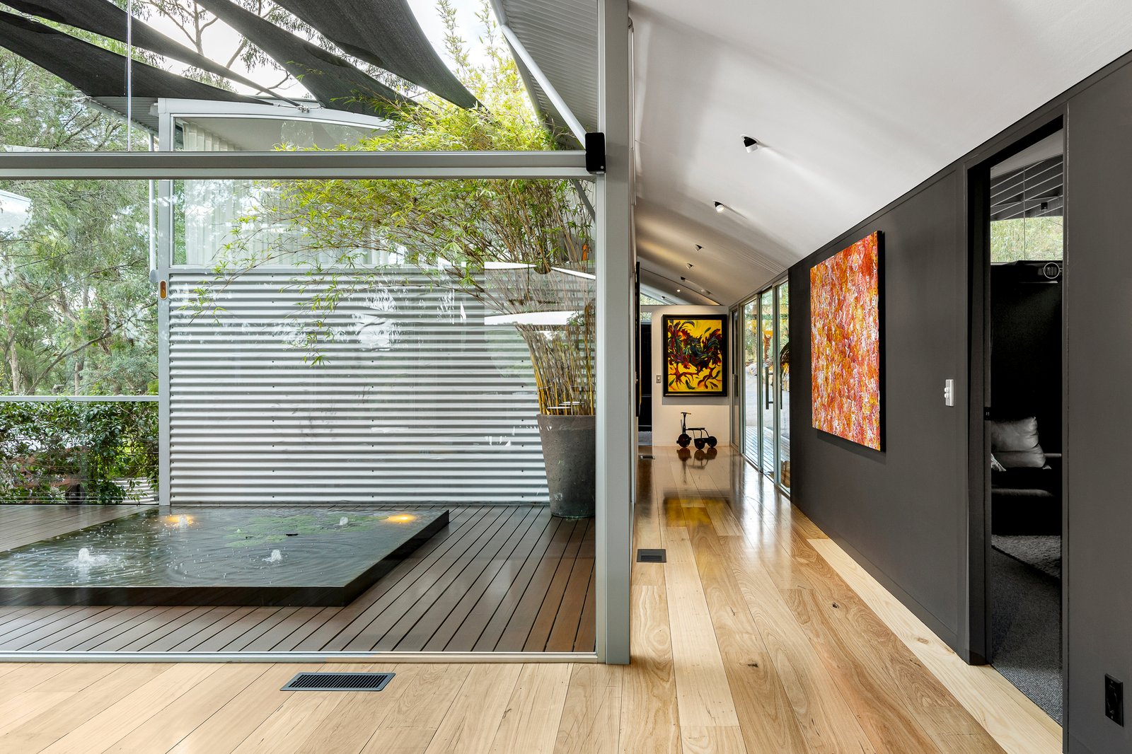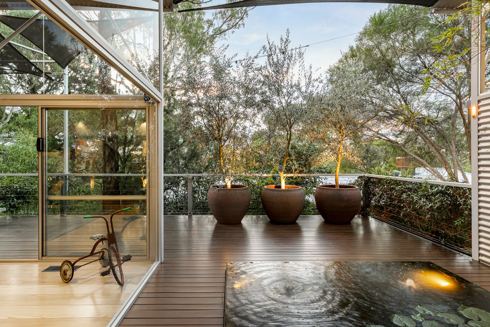 Outside, the Ironbark timber deck is a highlight; a large, tranquil space surrounded by nature, perfect for alfresco dining or soaking up the sun. A Corten infinity pond presents a lovely focal point.