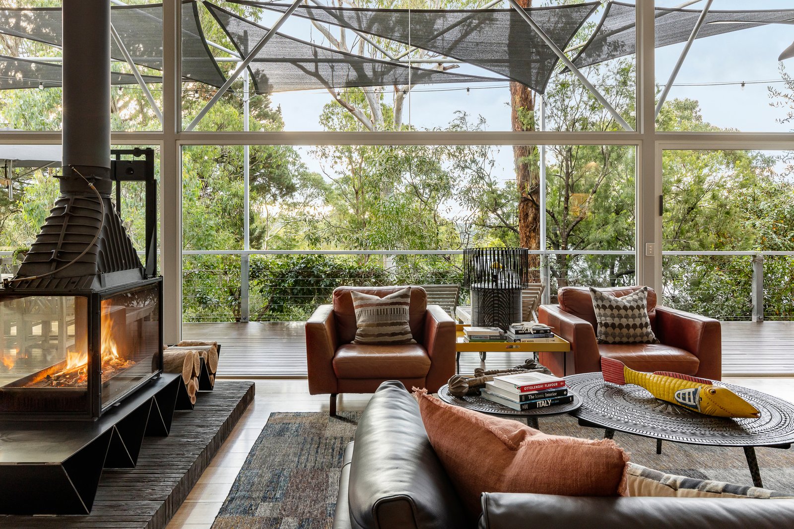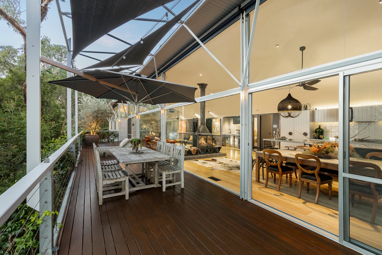 Step inside to discover a haven of comfort and sophistication, with leafy, panoramic outlooks all around. The heart of the home lies in its expansive living area, featuring a striking central Cheminees Philippe 3-sided fireplace and beautiful messmate floors. The open layout seamlessly connects living, dining, kitchen, and outdoor areas, making it ideal for gatherings and celebrations.