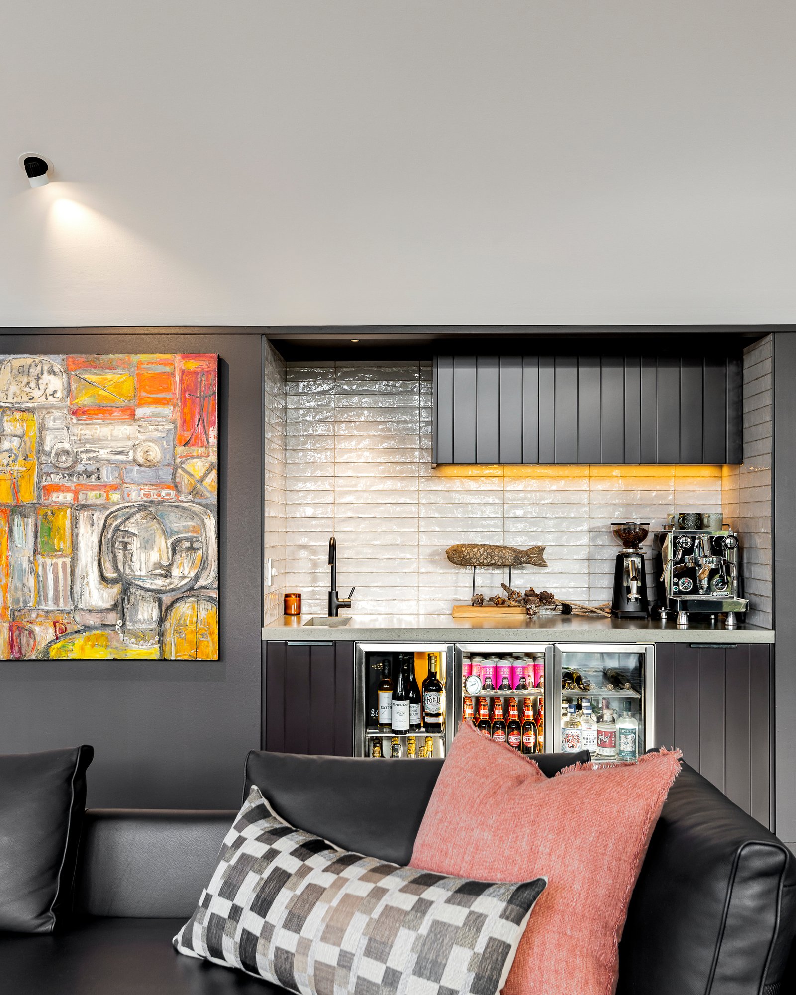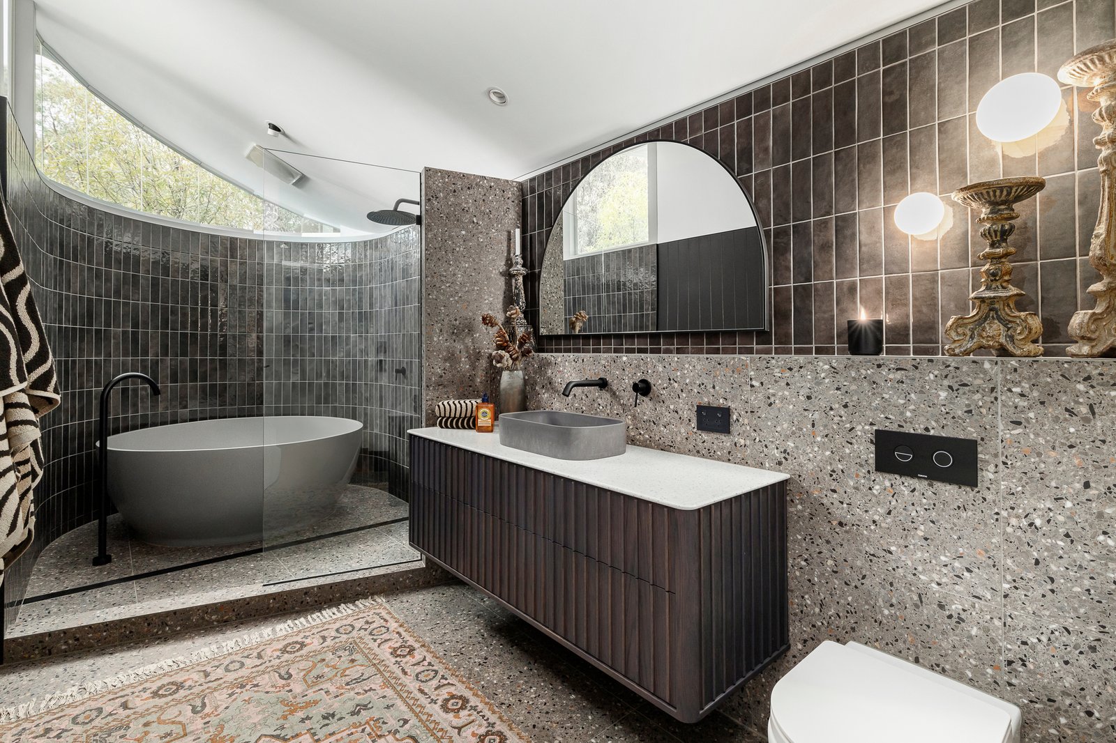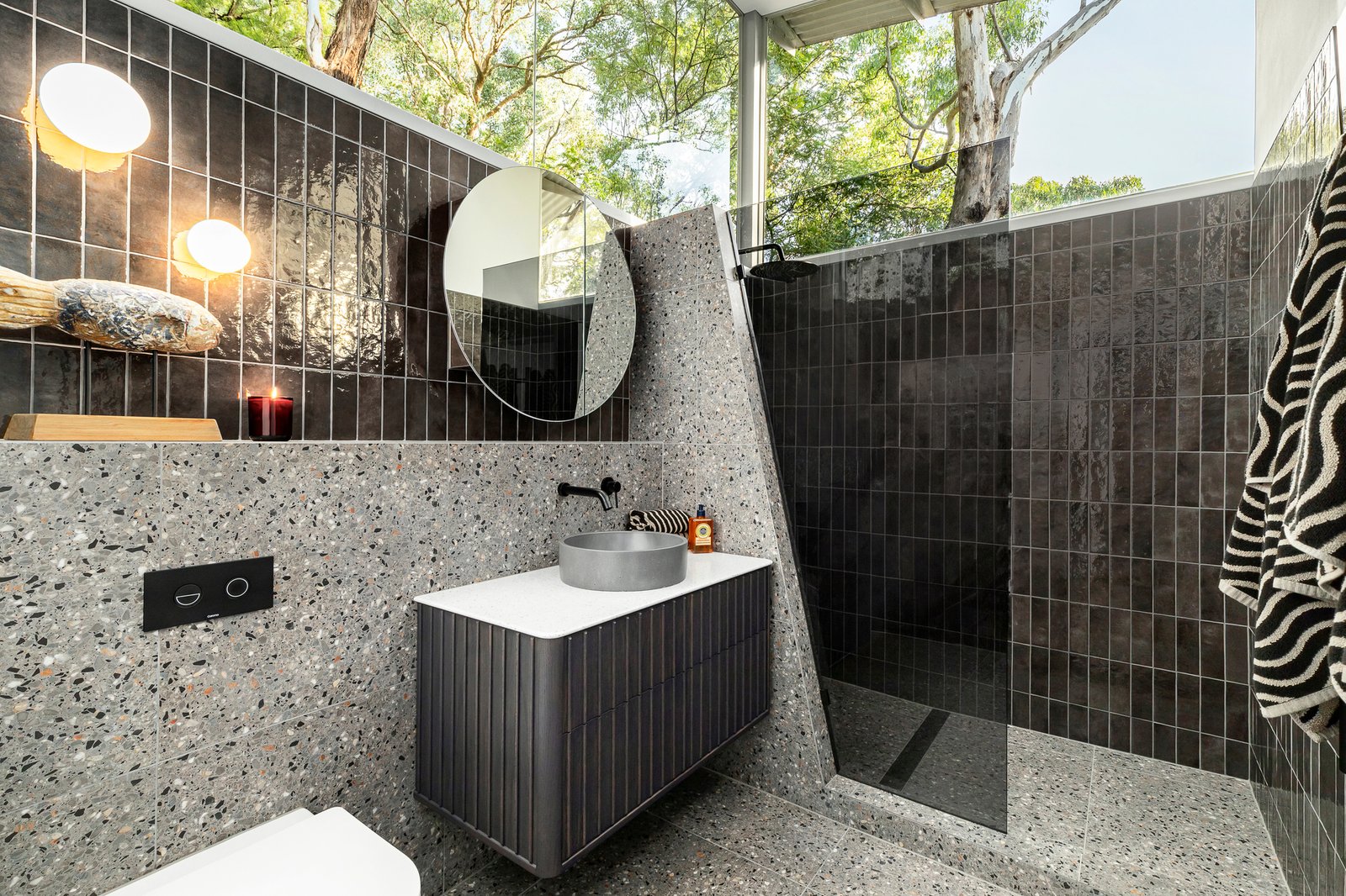 There are four beautifully fitted bedrooms, each offering privacy and stunning floor-to-ceiling windows. A separate living space is currently used as a home theatre, with wired surround sound, a giant screen, and courtyard access for intermissions. The spacious master suite features a walk-in robe and ensuite with oversized rain showerheads. The family bathroom is another highlight, with an enormous round concrete bathtub and spectacular styling.