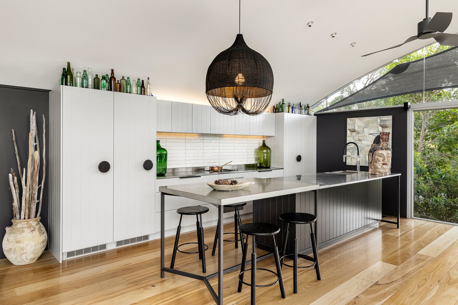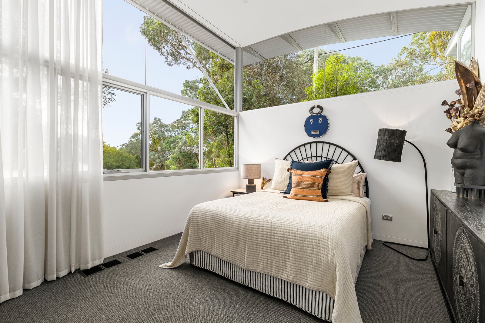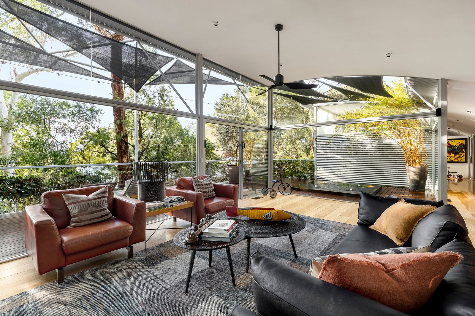 Nestled amongst the treetops, discover this elevated glass house where striking architecture and considered, modern interiors converge to create a truly mesmerising space to call home.