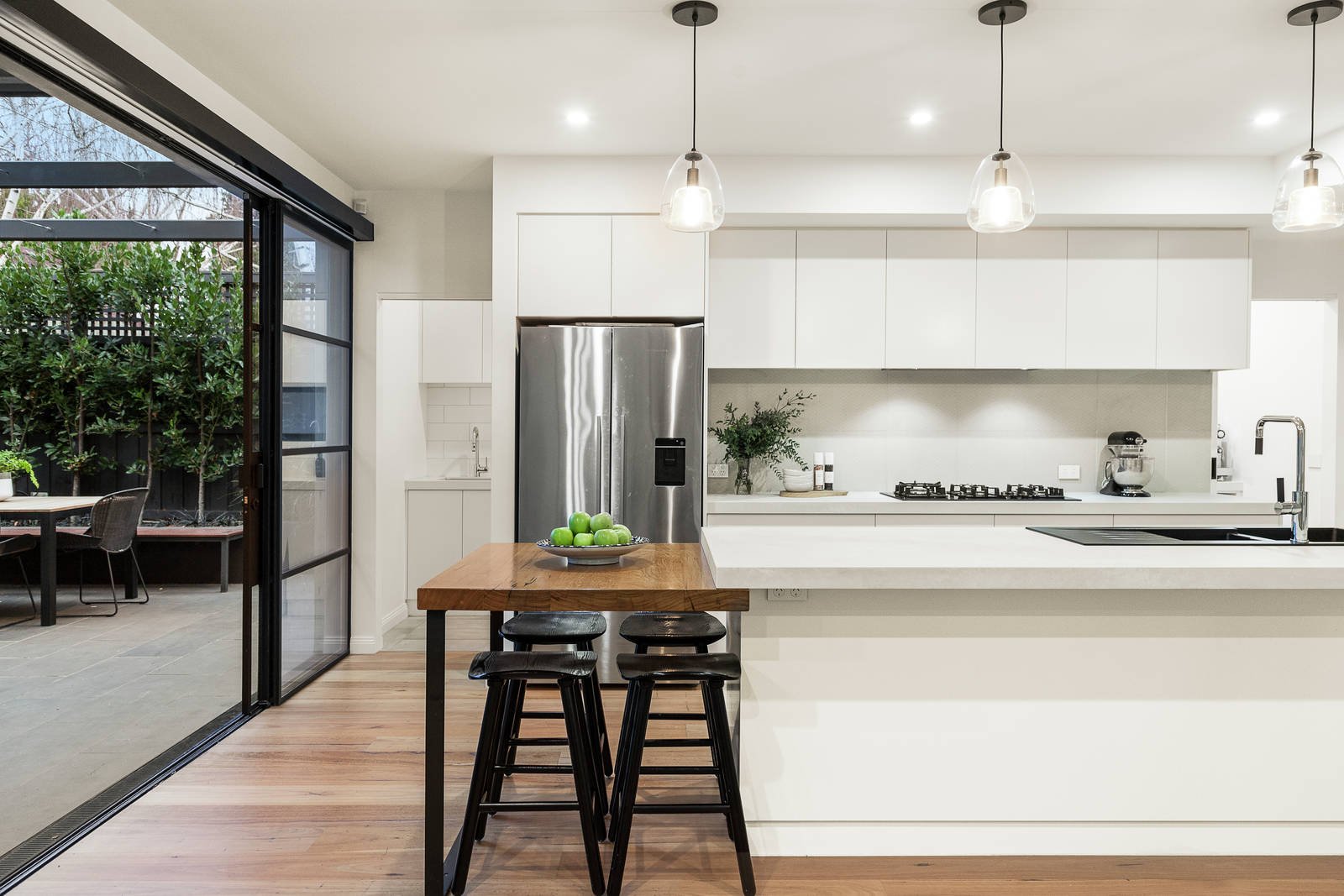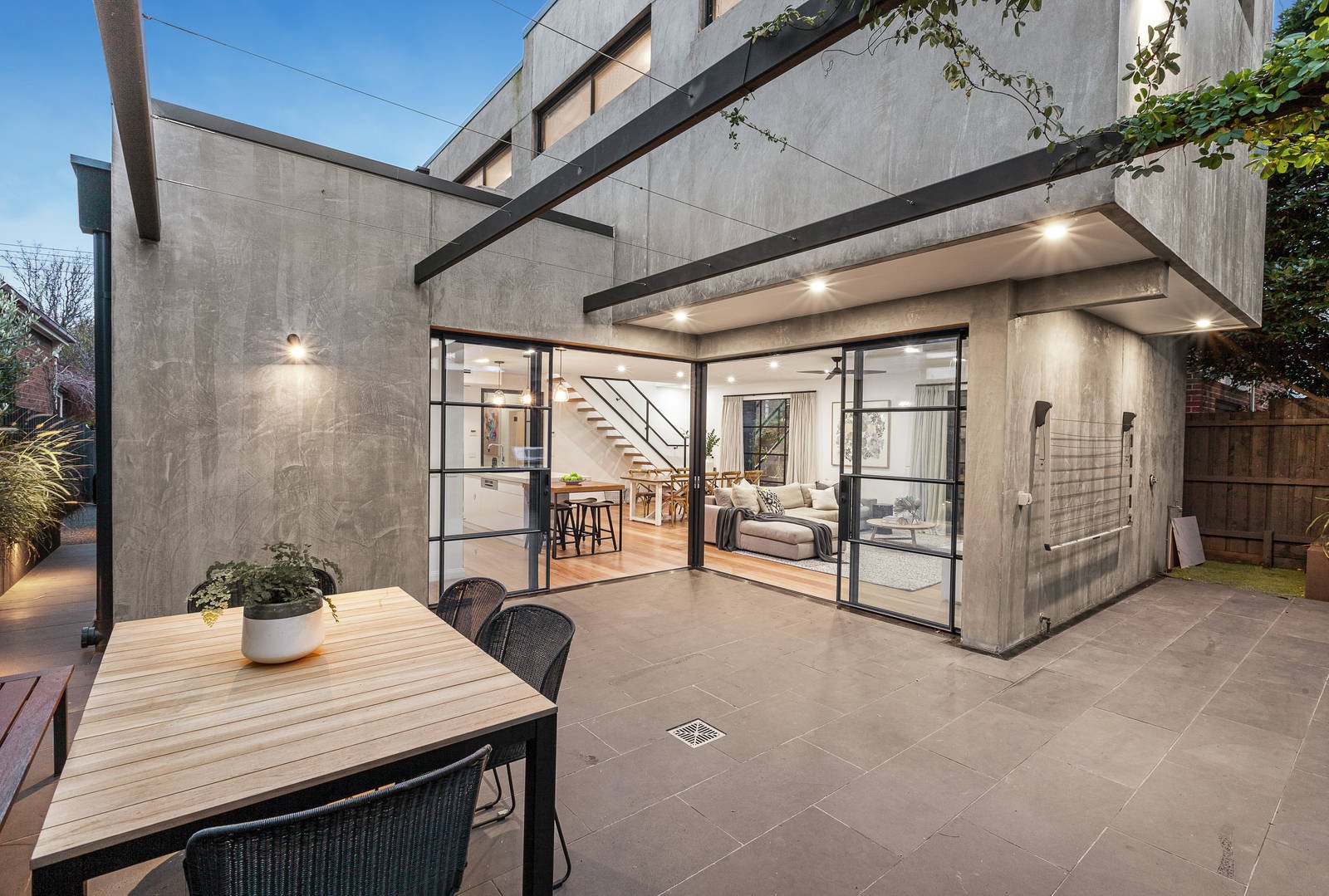 A tessellated verandah sets the scene for an arched central hall featuring lofty ceilings and Blackbutt floors. Striking black steel framed doors at the end of the hall introduce the contemporary extension housing an expansive open plan living and dining room warmed by a gas fire and served by a superb gourmet kitchen boasting stone benches, twin Bosch ovens and a butler's pantry. Corner black steel framed doors open the living to an idyllic northeast facing private bluestone paved garden. Beneath a vine covered pergola and featuring a built in BBQ, it is the perfect setting for al fresco dining and entertaining. Intelligently zoned accommodation comprises on the ground level the main bedroom with walk in/built in robes and a chic ensuite, a second bedroom also with a robe, a designer bathroom and generous home office or 5th bedroom with robe. In the sensational children's zone upstairs, there are two additional bedrooms with robes, a retreat and stylish bathroom.