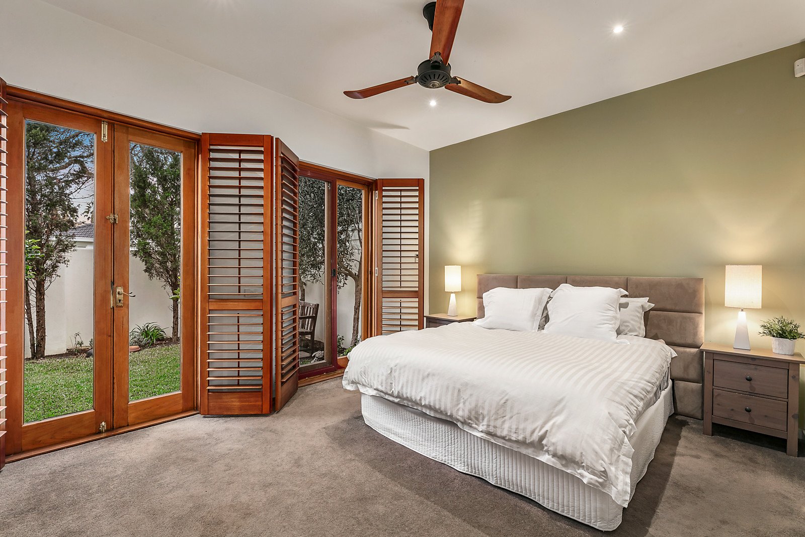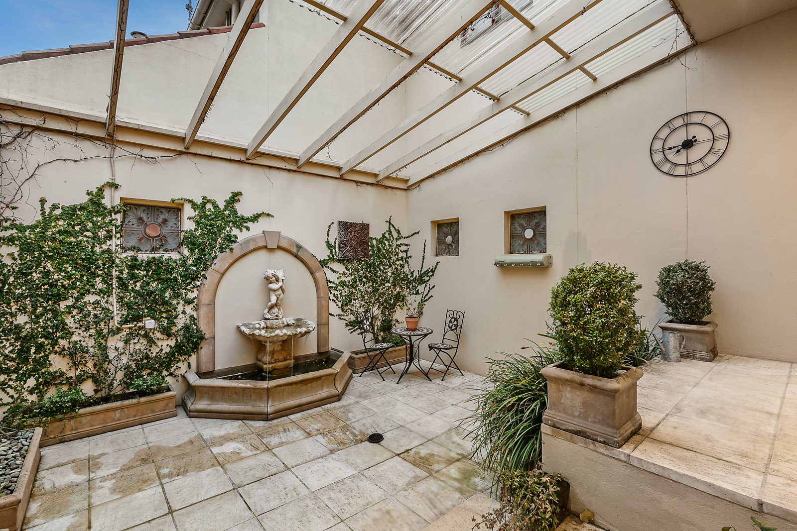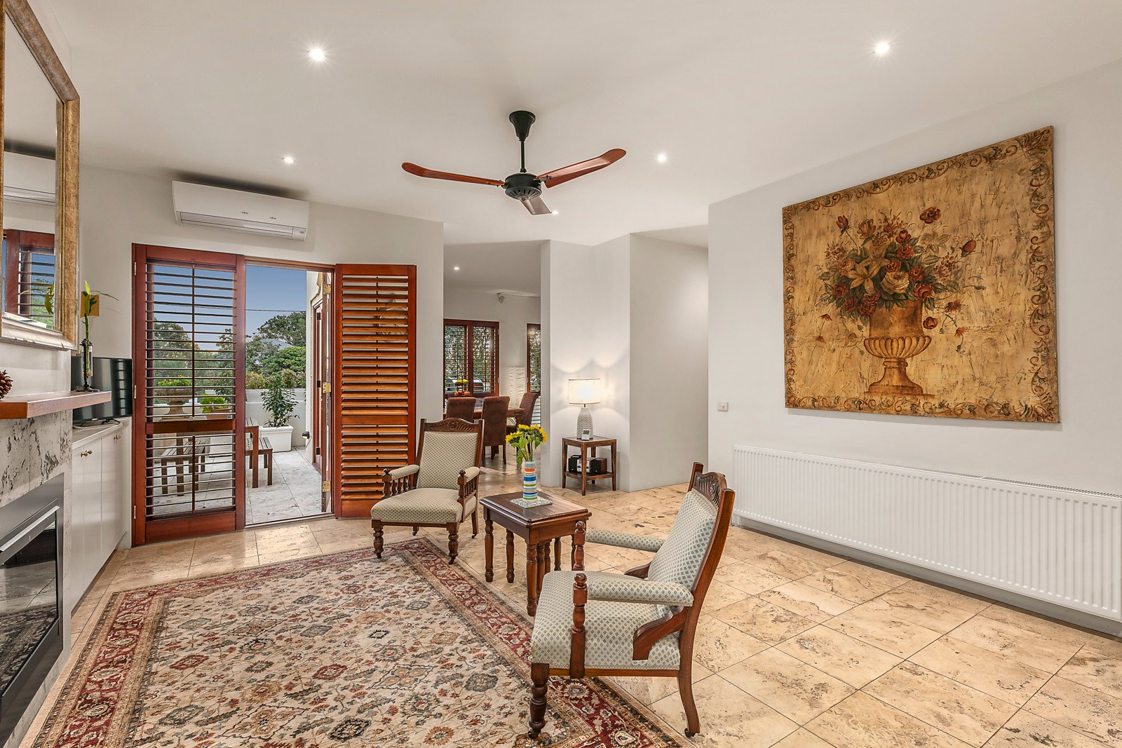 On the ground level you'll find a guest (or main) bedroom suite, powder room and open-plan living/dining room. The central kitchen has natural stone benchtops, solid timber cabinetry and Smeg cookware including a 900mm oven, gas cooktop and integrated microwave. Here look out to the fully-enclosed courtyard, replete with a classic water fountain and vine-covered walls - the perfect spot for summer evenings or winter mornings.