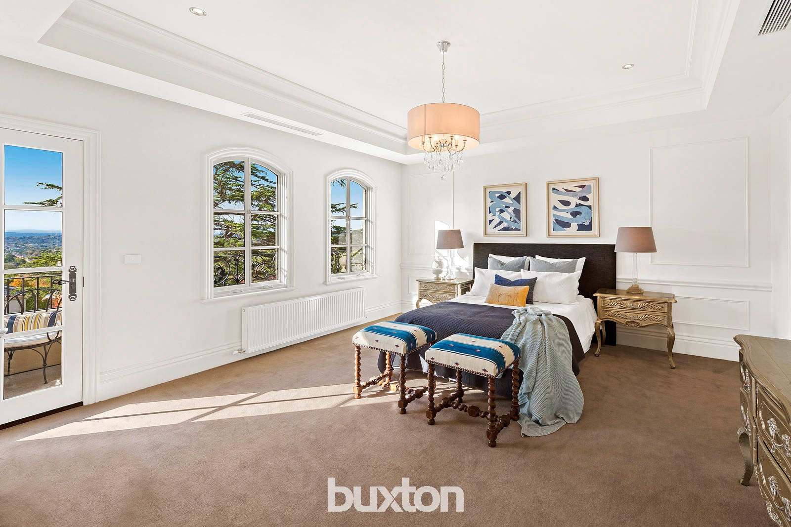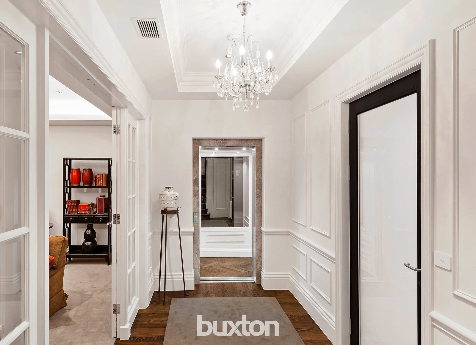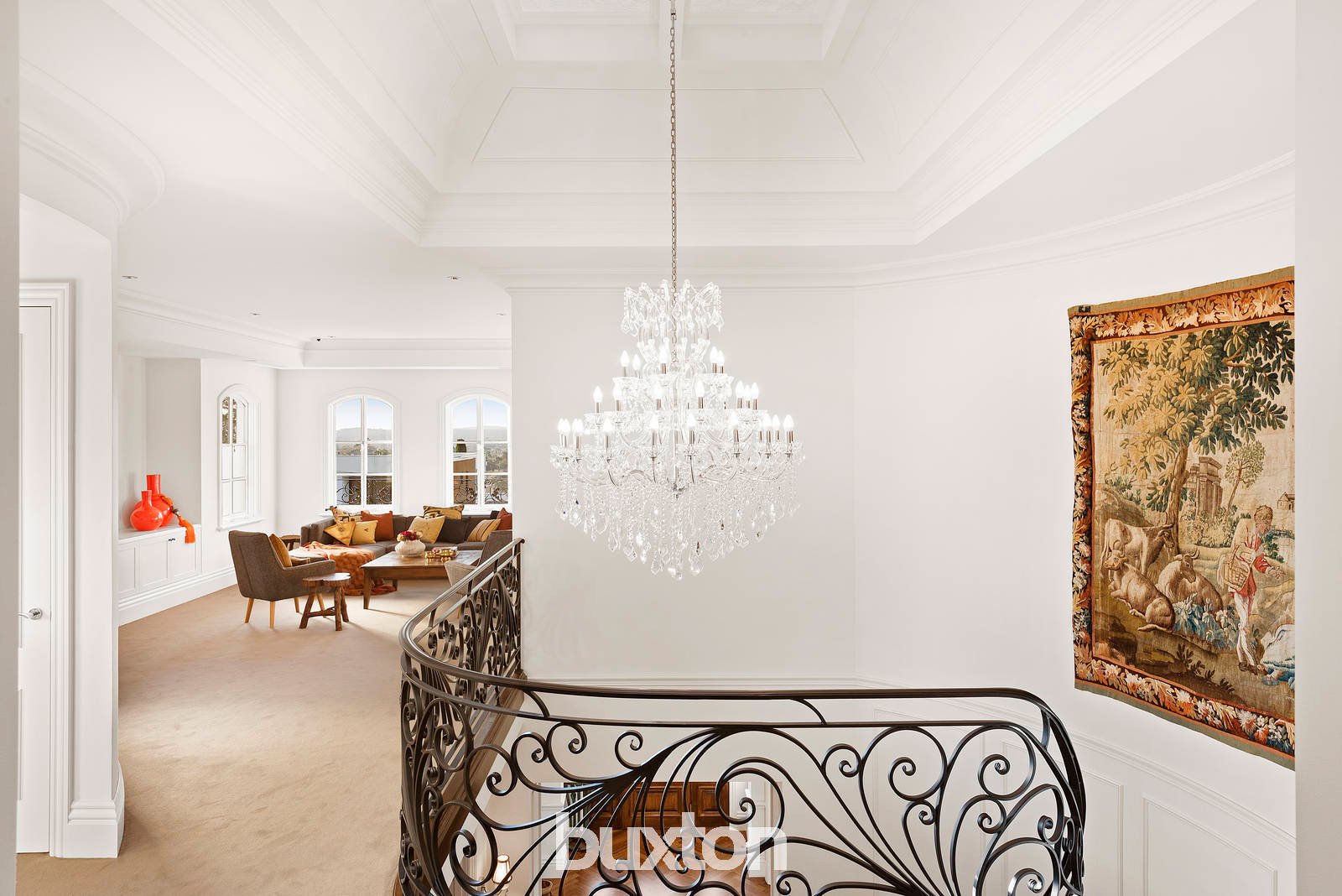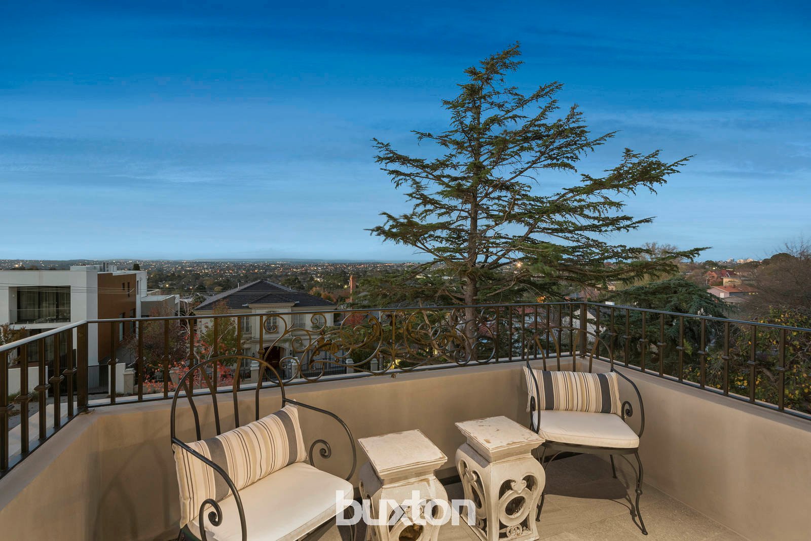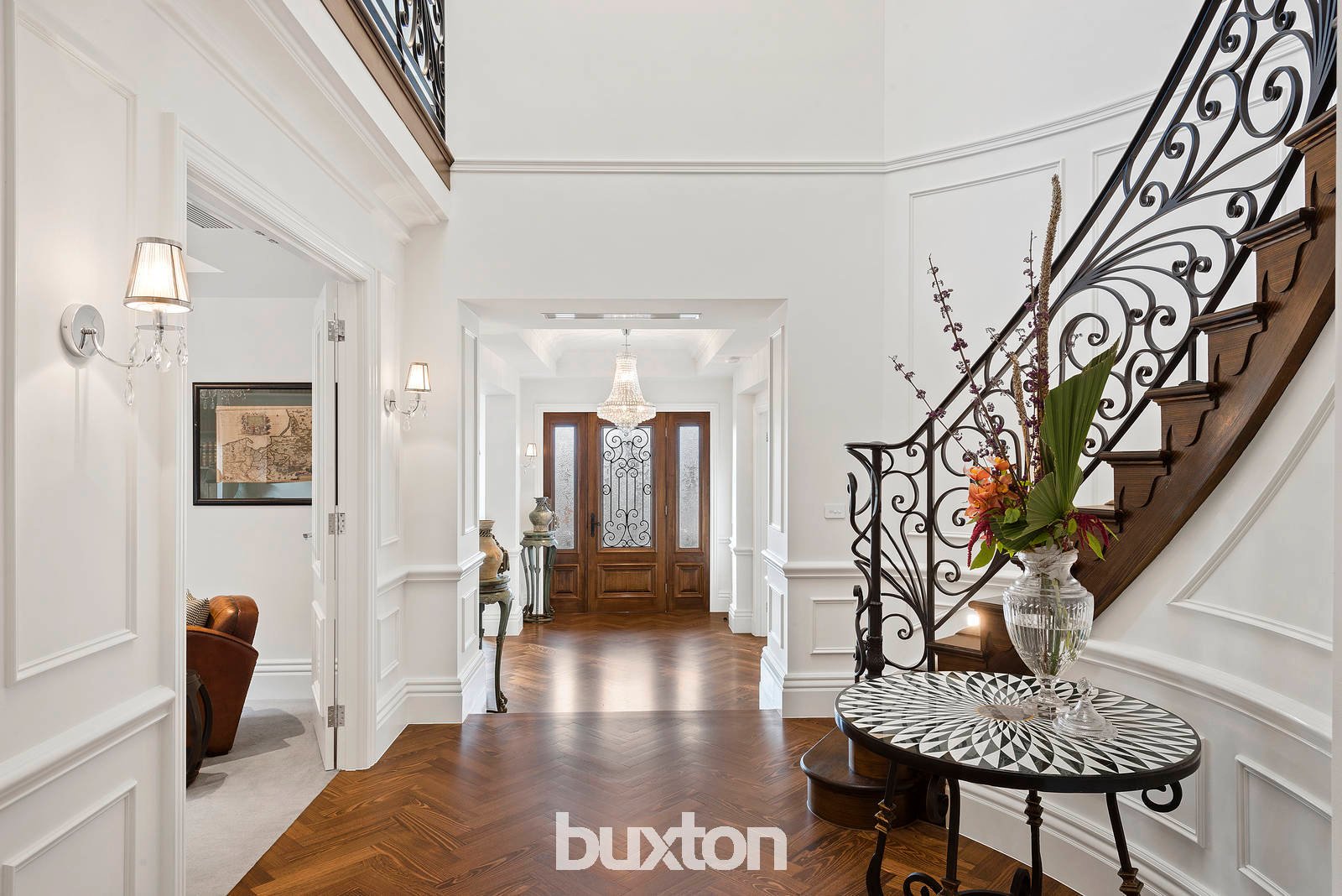 Breathtaking views across the northern sky to the Kinglake Ranges dominate the front sun filled rooms, terrace and balcony, balanced by a sublime foyer with panelled walls, three-metre ceilings (all three levels), Alpine Oak parquetry floors and a sweeping staircase with hand crafted wrought iron balustrade, chandelier and feature domed skylight.