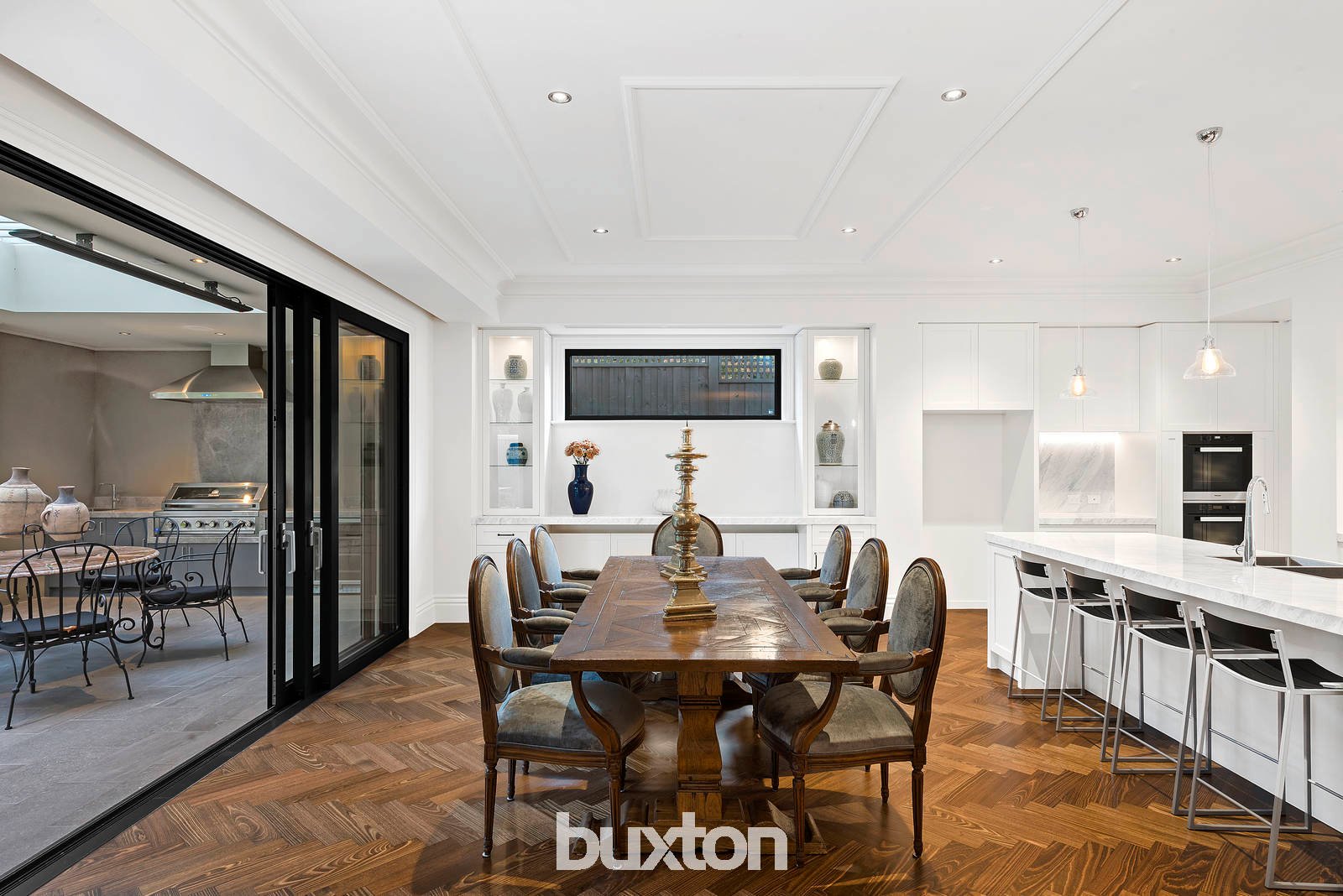 Greek marble lines the spacious Miele kitchen and second kitchen which has an additional 900mm oven. From this vantage point, play the role of gracious host as your guest experience the pleasure of the expansive family room, dining, alfresco with vergola electric roof and outdoor kitchen, plush lounge with marble gas log fire and its block panelled ceiling, and a large cinema room with wet bar.