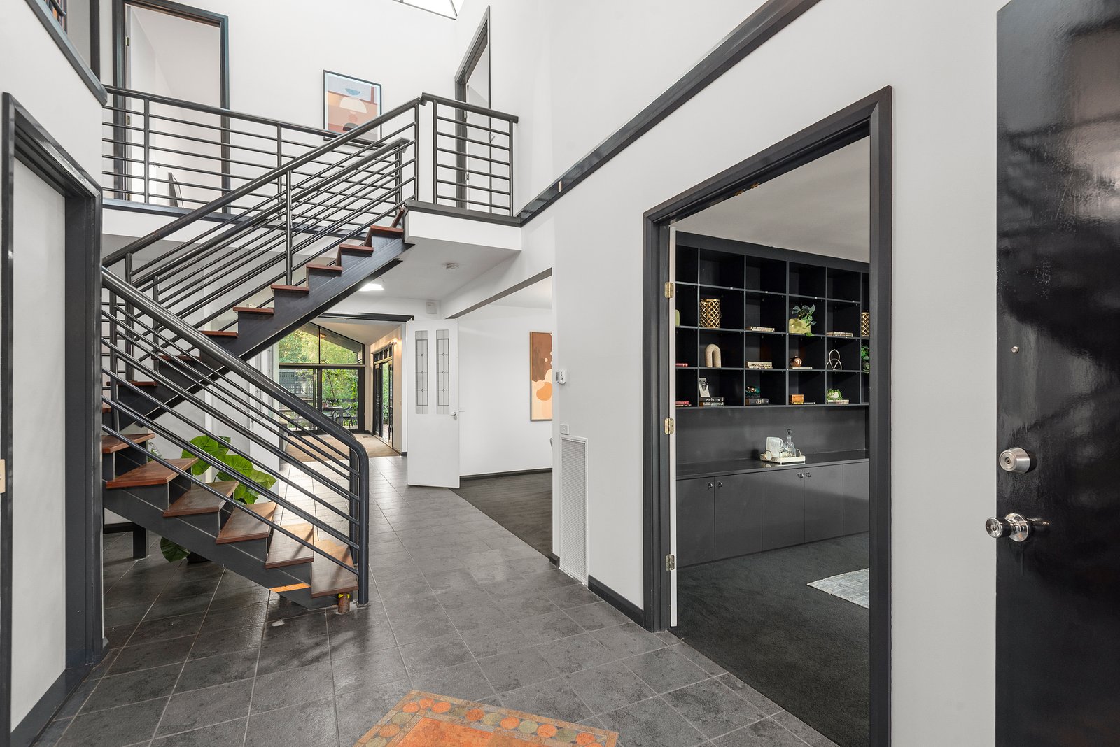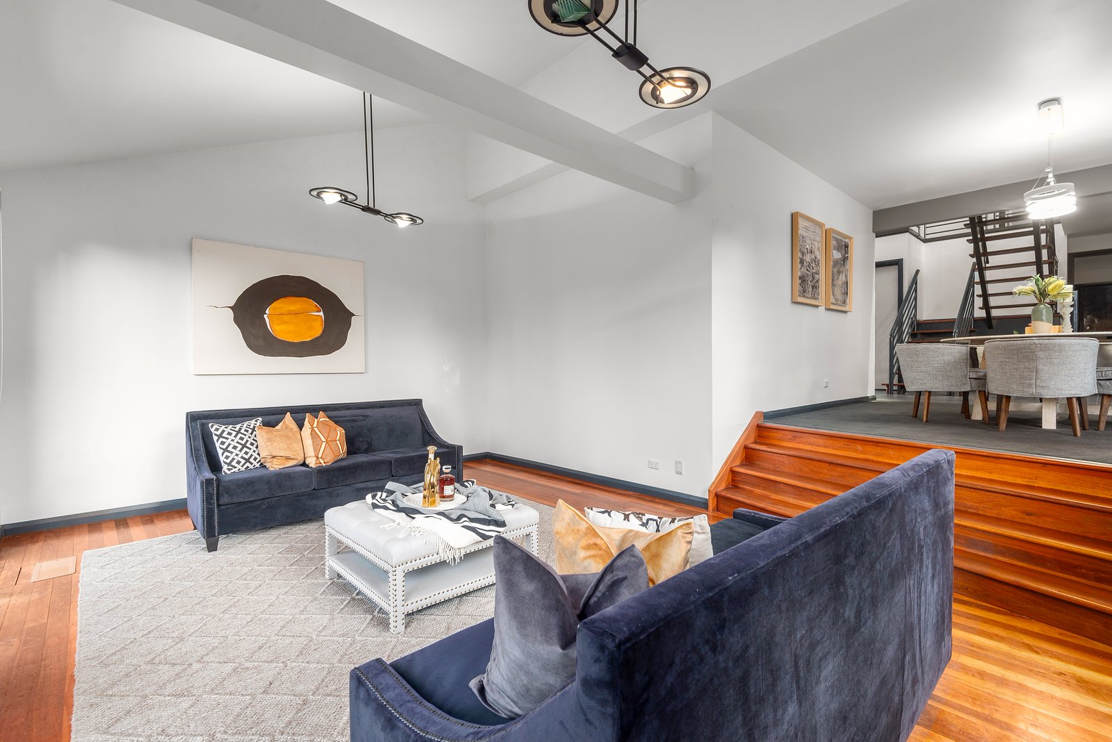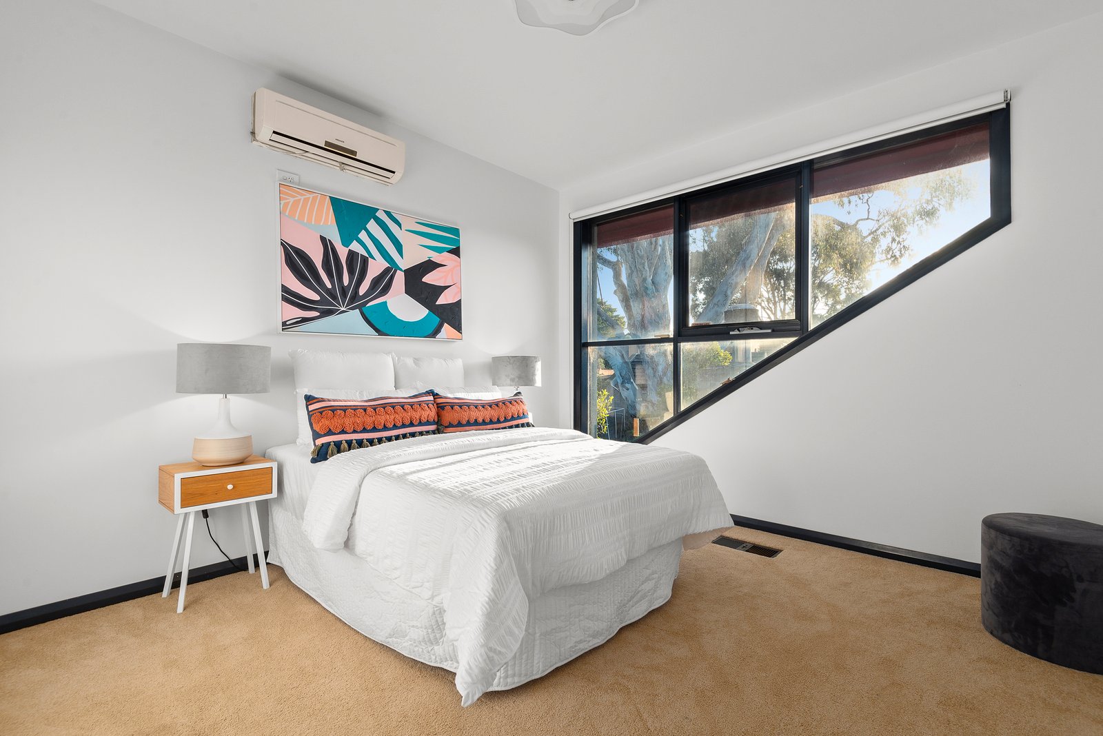 Set under a spectacular double-height entrance void, an eye-catching staircase leads upstairs to the main bedroom where sweeping views to the north are complemented by mirrored built-in robes and a spa ensuite, plus there are another two bedrooms sharing access to a family-sized bathroom and an upstairs living room. Further highlights of this unique residence include a huge double garage with extra storage space and a driveway parking space, plus there is a downstairs powder room, a laundry, ducted heating and reverse cycle air conditioning.