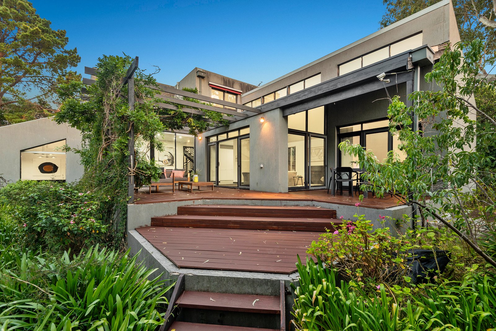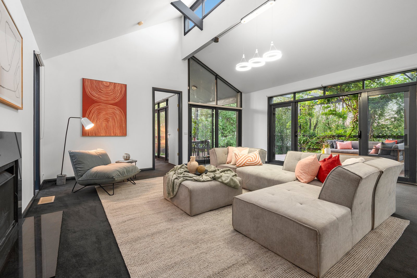 Brilliantly designed to frame garden connections in all directions, the home highlights a central kitchen / meals with premium Chef appliances, as well as a living room with a fireplace and two sets of double doors that open out to an alfresco deck and the garden. Meanwhile, a more formal dining area also connects seamlessly to outdoor living, while stepping down to a lounge room that feels wonderfully intimate.