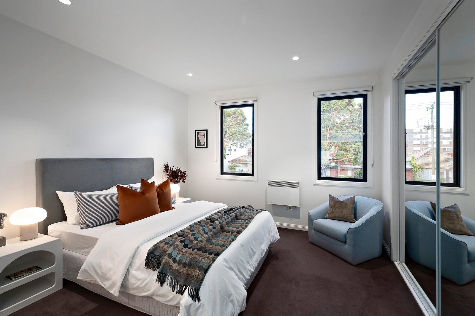 High ceilings and a central light well give depth and dimension to a superb second storey, with a pair of substantial robed bedrooms offering direct bathroom access, including the main with a private ensuite. Further up, an open-plan living and dining domain takes in exceptional urban views from its balcony terrace, supplemented by the well-appointed stone-bench kitchen primed for entertaining with quality European appliances. On the ground floor, a third bedroom, with convenient external access.
