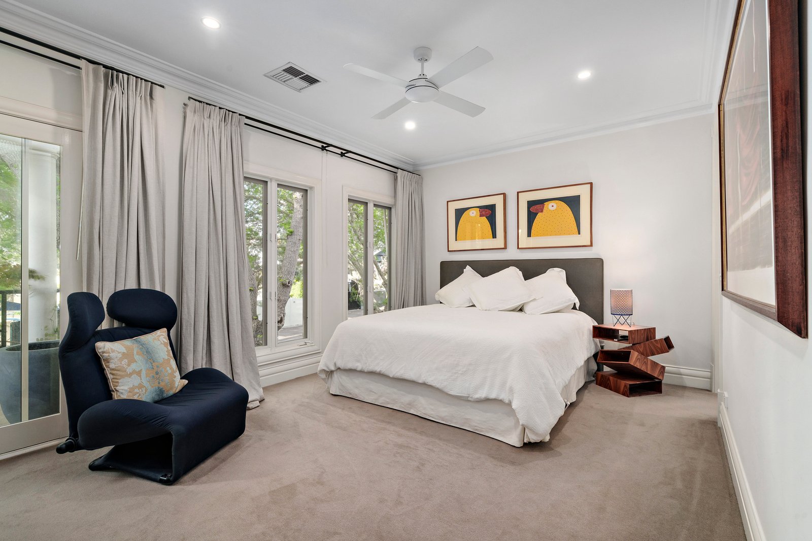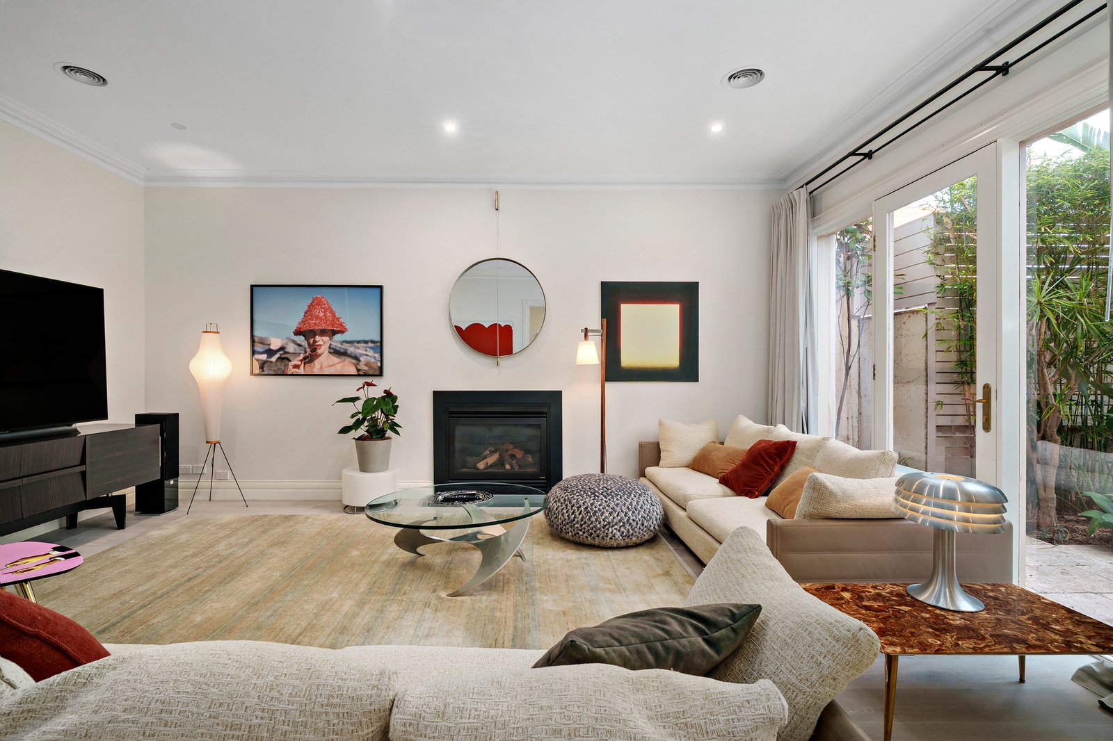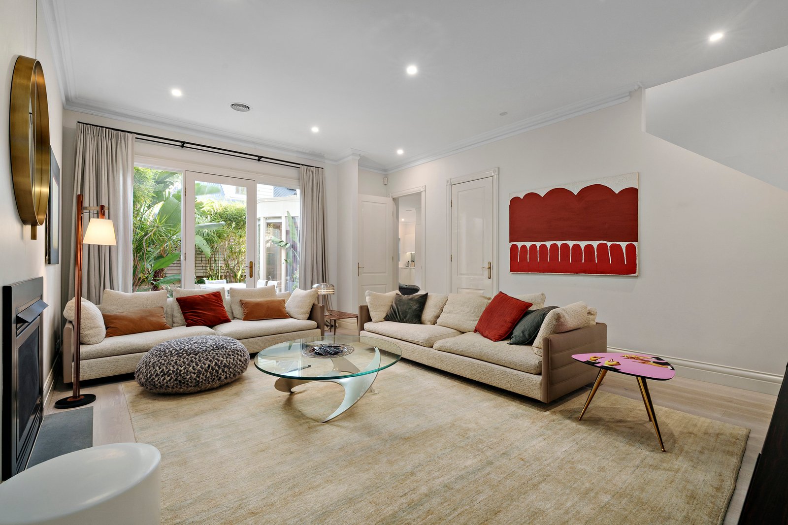 Flexible and beautifully balanced, the interior features two distinct living zones and a versatile study or fourth bedroom. Delicate morning light fills the open plan living and dining area, where the bay window frames a thriving tropical garden outlook. Cleverly placed skylights and a well appointed kitchen with premium appliances enhance the warmth and functionality of the home, while both living zones enjoy direct garden connection. A separate living room with a gas fireplace offers an intimate retreat, complementing the relaxed open plan domain.