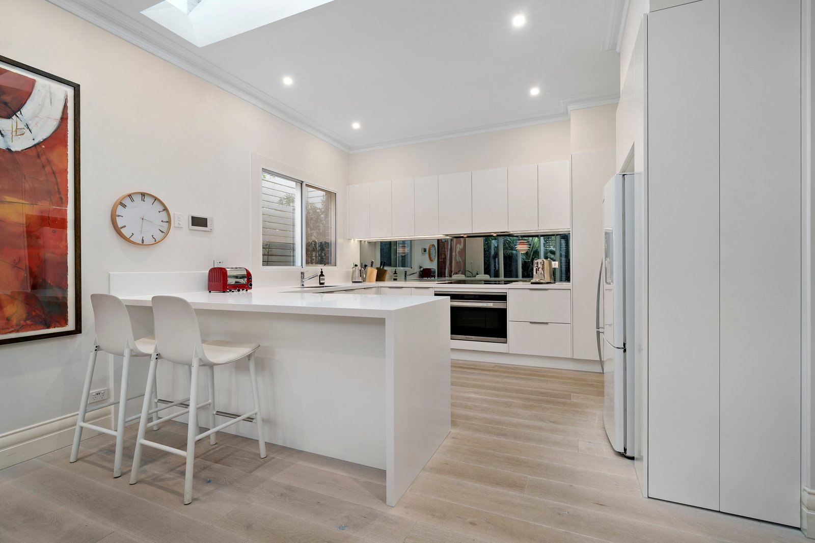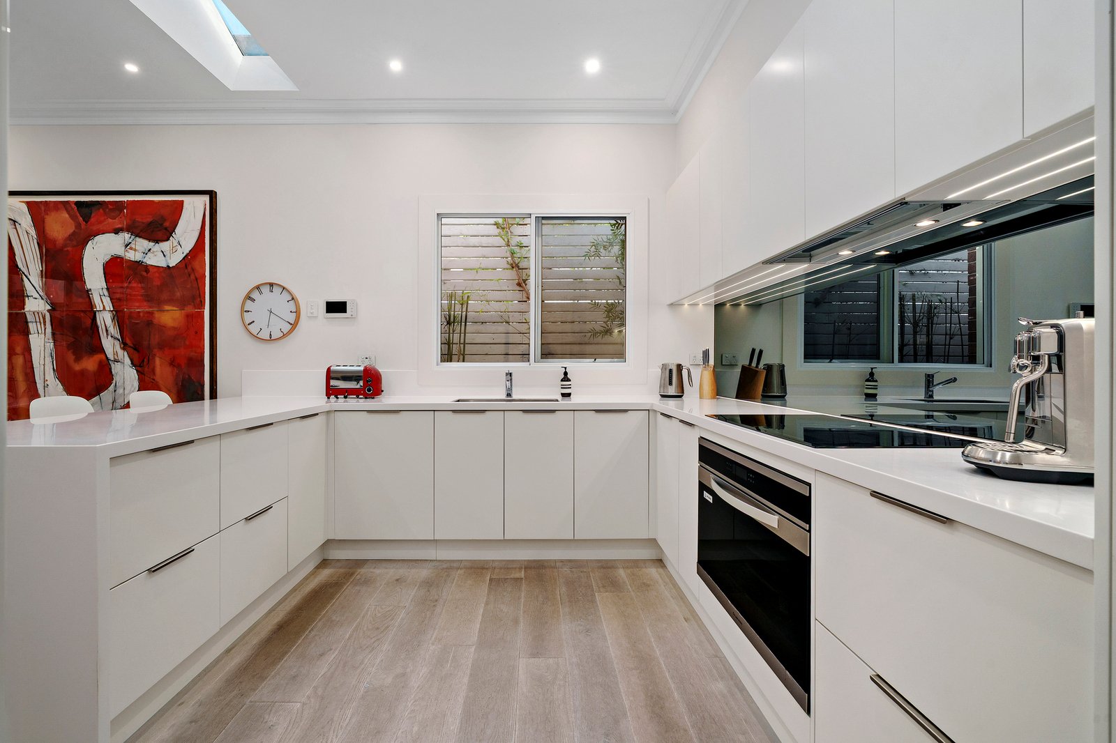 Striking street presence and captivating natural light define this classically inspired contemporary residence, perfectly positioned just minutes from the beach. High ceilings, oak floors and exquisite privacy combine to create a natural harmony and a sense of haven, providing generous space for every stage of family life.