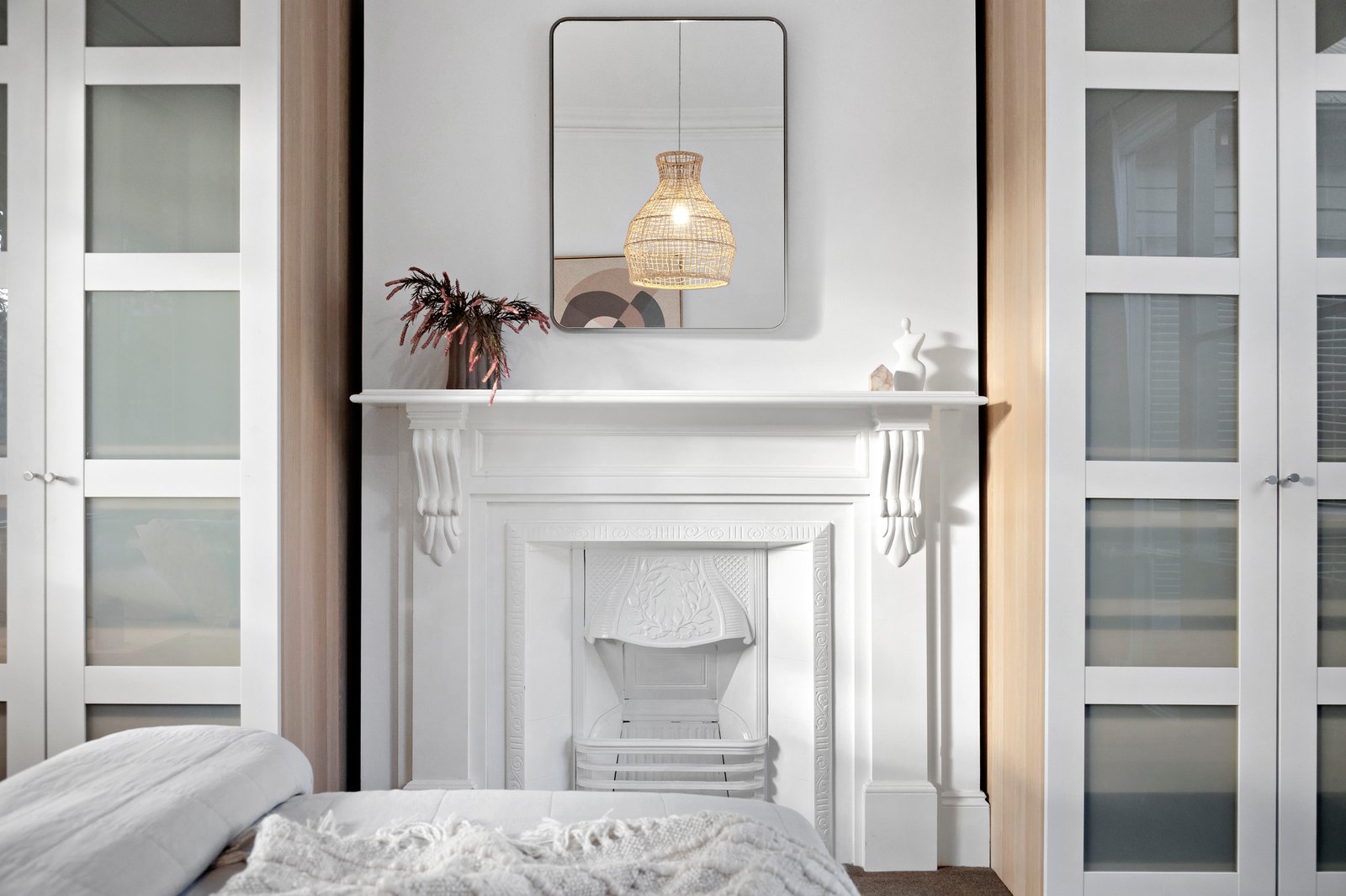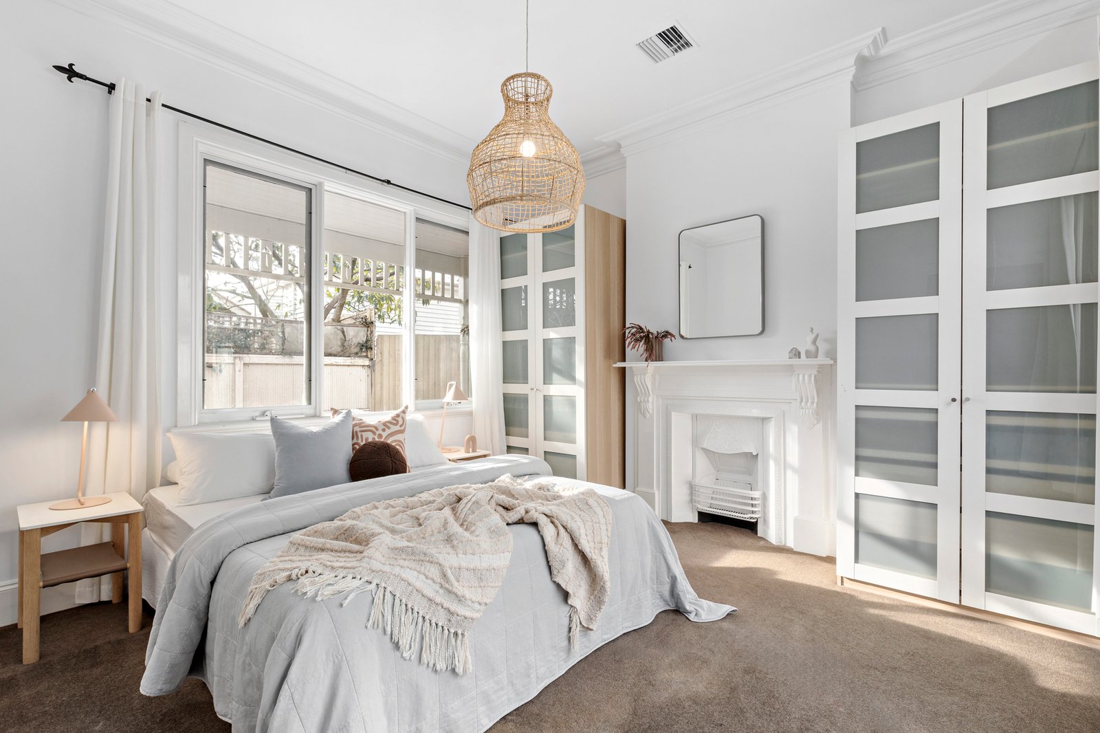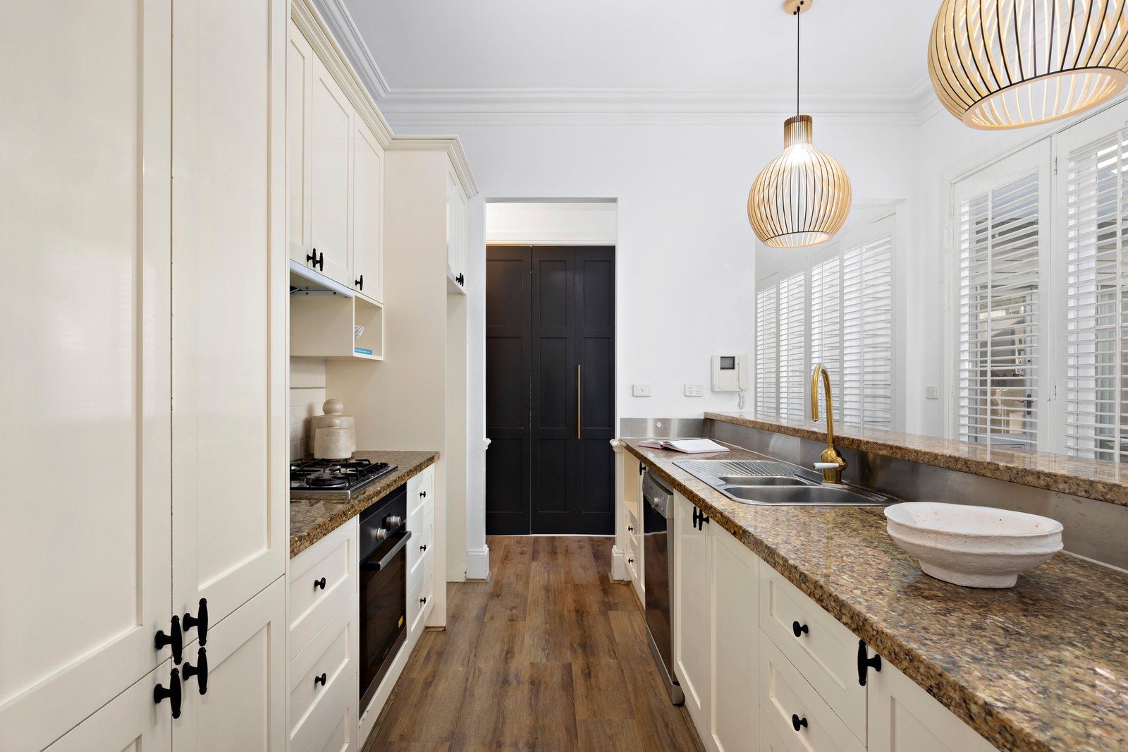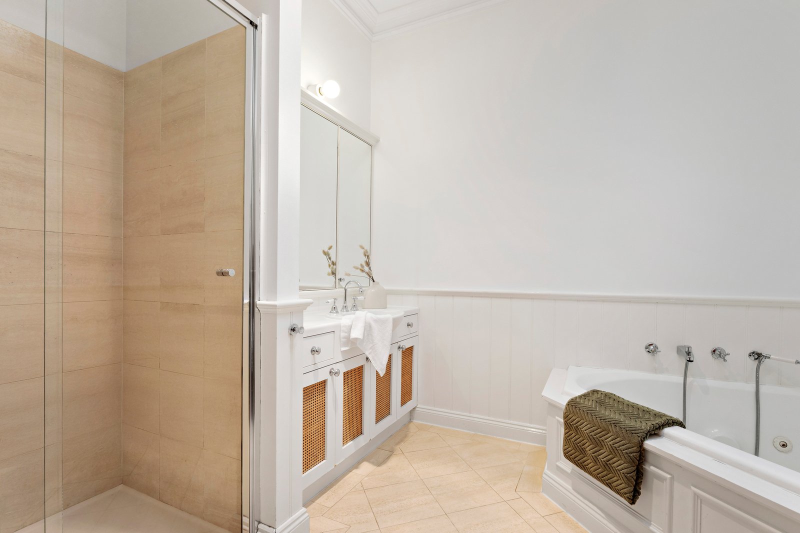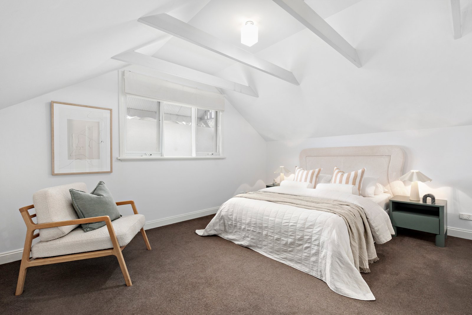 Offering outstanding low-maintenance functionality, the home’s brick-paved, gated forecourt and double remote-operated garage can provide secure off-street parking for three to four cars. Reflecting the century-old origins of this exclusive heritage-precinct street, a long shady verandah edged with timber fretwork and a leadlight-panel front door introduces the recently refreshed and updated custom weatherboard home’s character. Inside, soaring ceilings and traditional features including timber wainscoting, elegant French doors, and an ornate fireplace are complemented by contemporary enhancements including timber-laminate flooring, plantation shutter-blinds, designer light fittings, and custom joinery. The flowing open floor plan incorporates the central stone/Bosch kitchen and the living and dining area that extends to a light-filled home office, all facing the fully private decked alfresco courtyard. Offering adaptability for single-level liveability, there is a choice of two spacious main bedrooms, with the light-filled ground-level room with fireplace, custom robes, and French doors to the courtyard, or the upstairs attic-style room, which has a wall of built-in cabinetry and a skylit shower ensuite. The main family bathroom features a spa bath and separate shower, while the third bedroom has built-in robes and an access door to the side paved courtyard.