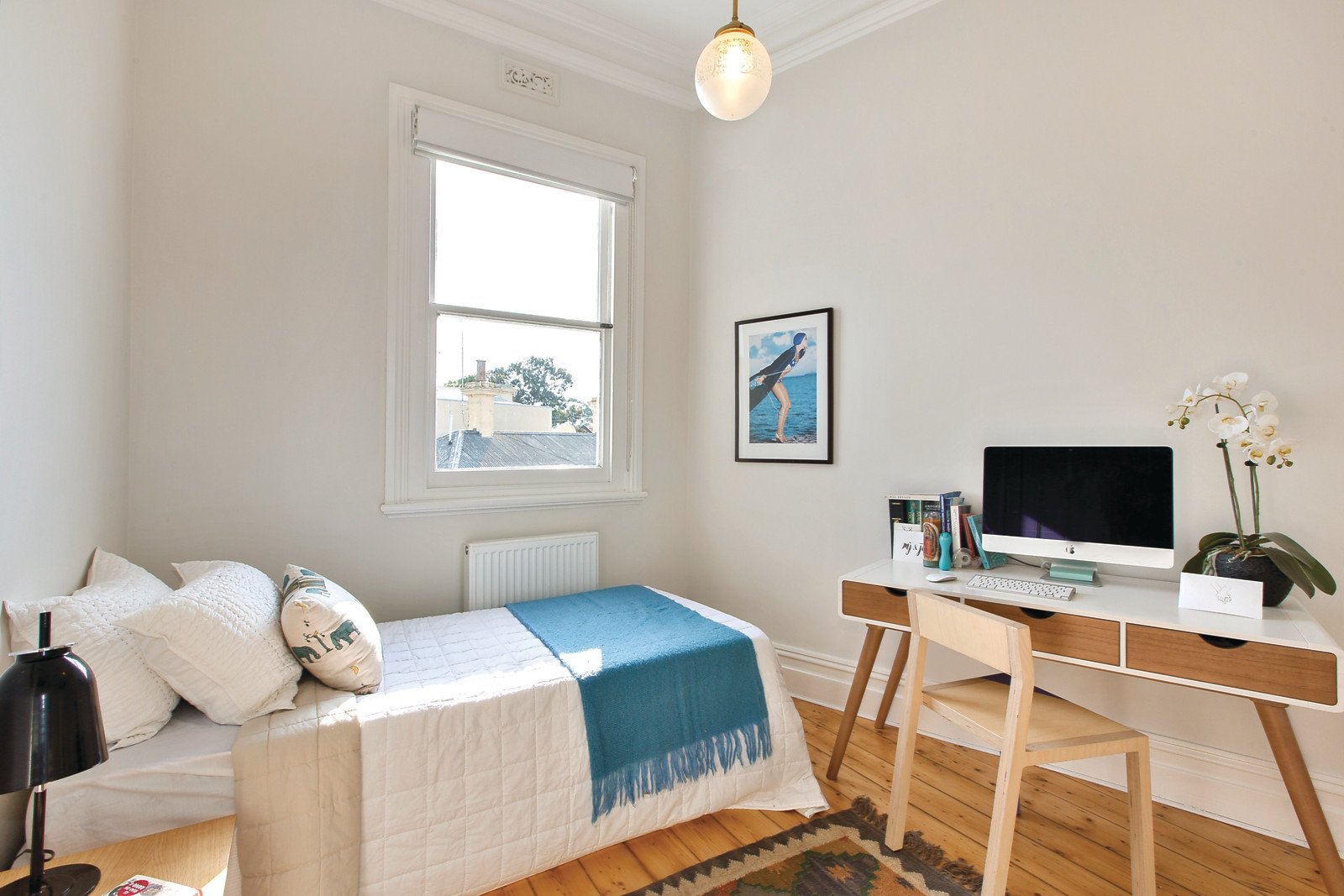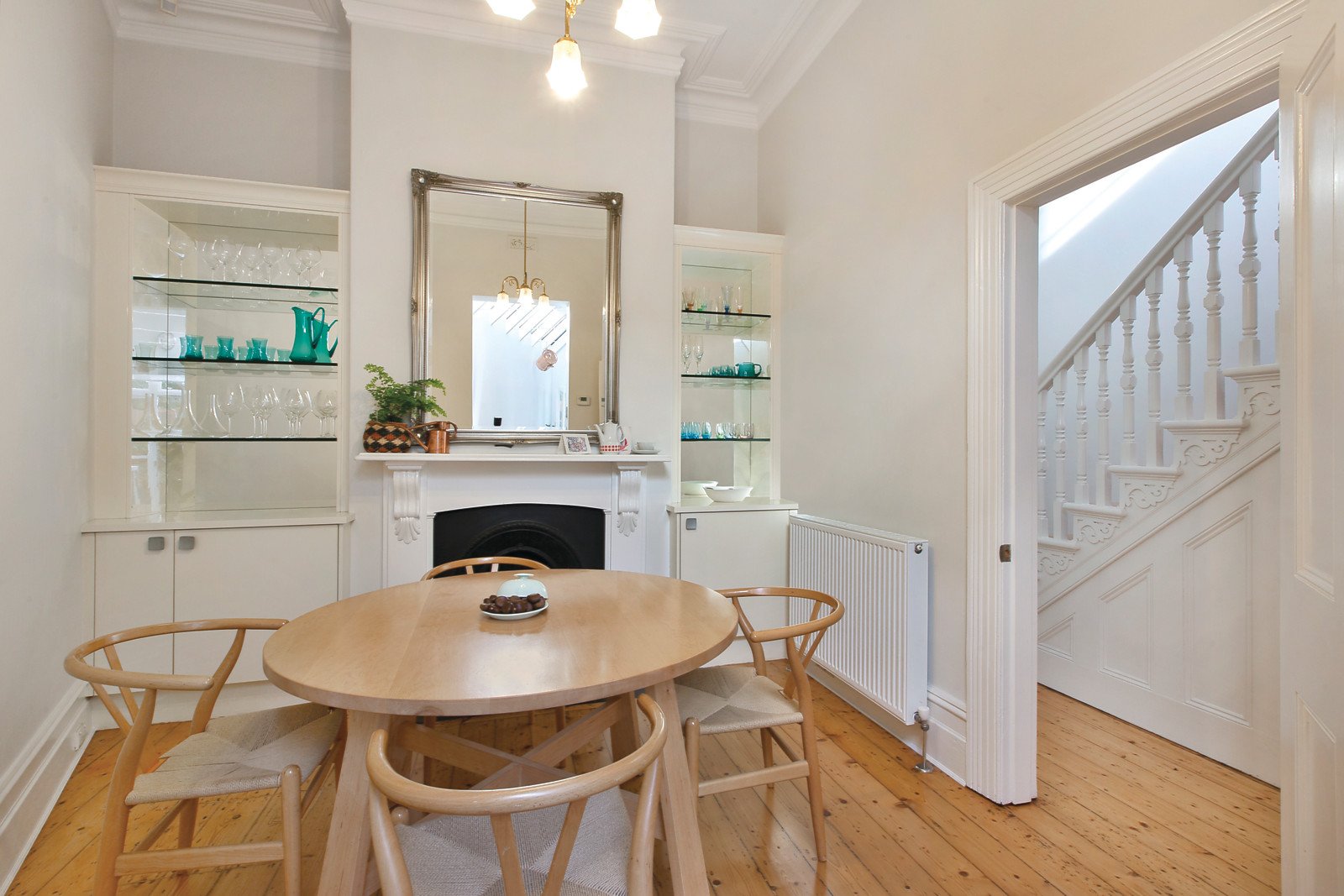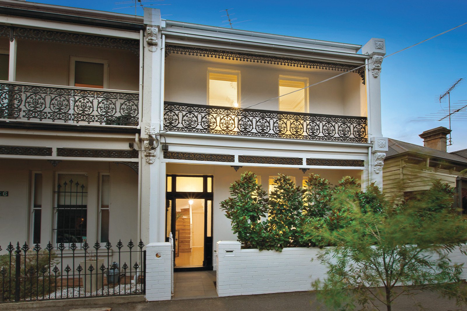 This handsome, semi-detached Victorian terrace, adorned with wrought-iron lacework would be impressive anywhere, but particularly so positioned opposite Albert Park Lake and close to the beach. Completely renovated with a designer's flair and hydronic heating throughout, it's an enticing offer. A souring ceiling crowned with a rose soars over original floorboards in the bright entrance hall with its elaborate, corbelled archway. The light-filled lounge up front, with sash windows, has a period fireplace flanked by twin bookshelves. Another original fireplace is bookended by mirrored display cabinets in the similarly spacious dining room. It opens onto an impressive, galley-style tiled kitchen with European appliances, sleek, gun metal-grey cabinetry, contrasting pale stone worktops and a striking cathedral ceiling punctuated by skylights. The bright bathroom has a wet shower and there's a laundry tucked under the staircase. Two bedrooms rest upstairs, both with original fireplaces and built-in wardrobes. The expansive main, with its decorative ceiling, has air-conditioning and spills onto a broad, park-facing balcony. A decked and bamboo-lined courtyard out back is ideal for entertaining.
