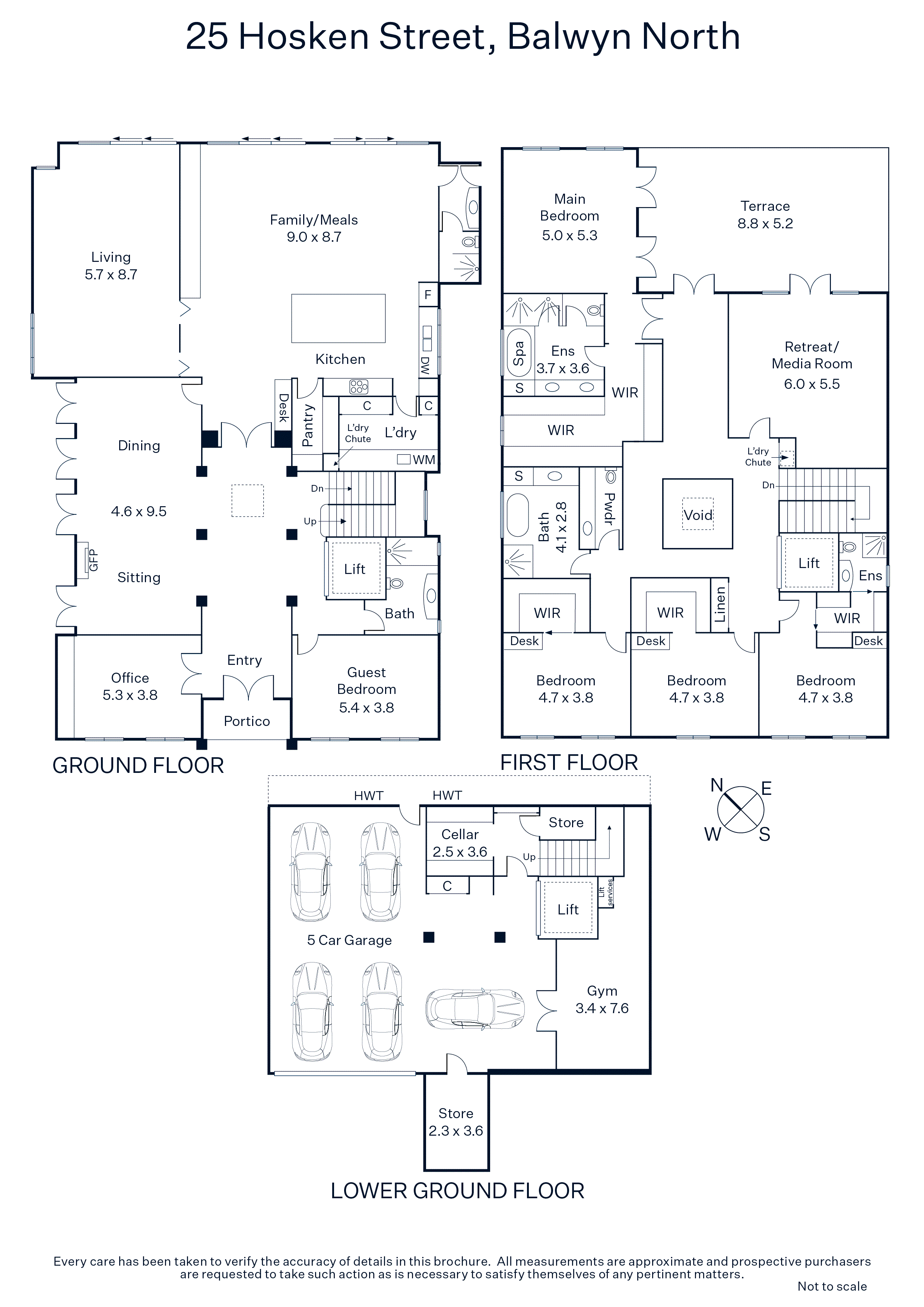 Reflecting refined European elegance, the impressive reception hall introduces an executive study with bespoke joinery and a gracious formal sitting and dining room opening through French doors to a side courtyard. Rich oak parquetry floors flow through an expansive media/family room and the palatial open plan living and dining room with a gourmet kitchen appointed with stone benches, European appliances and a walk in pantry. All the living areas open out to a large Vergola covered terrace with built in BBQ, an ideal al fresco entertaining area overlooking the picturesque northeast private landscaped garden with pool, spa and the mod grass tennis court. A downstairs bedroom with lavish bathroom is perfect for guests while upstairs, and accessed by lift, there is the opulent main bedroom with lavish walk in robes and deluxe marble en suite, a second king-sized bedroom with designer en suite and walk in robe, a 4th bedroom with walk in robe, 4th stylish bathroom, a generous retreat or 5th bedroom and spacious deck overlooking the garden. On the basement level there is a gym, wine cellar, storerooms and 5 garage.