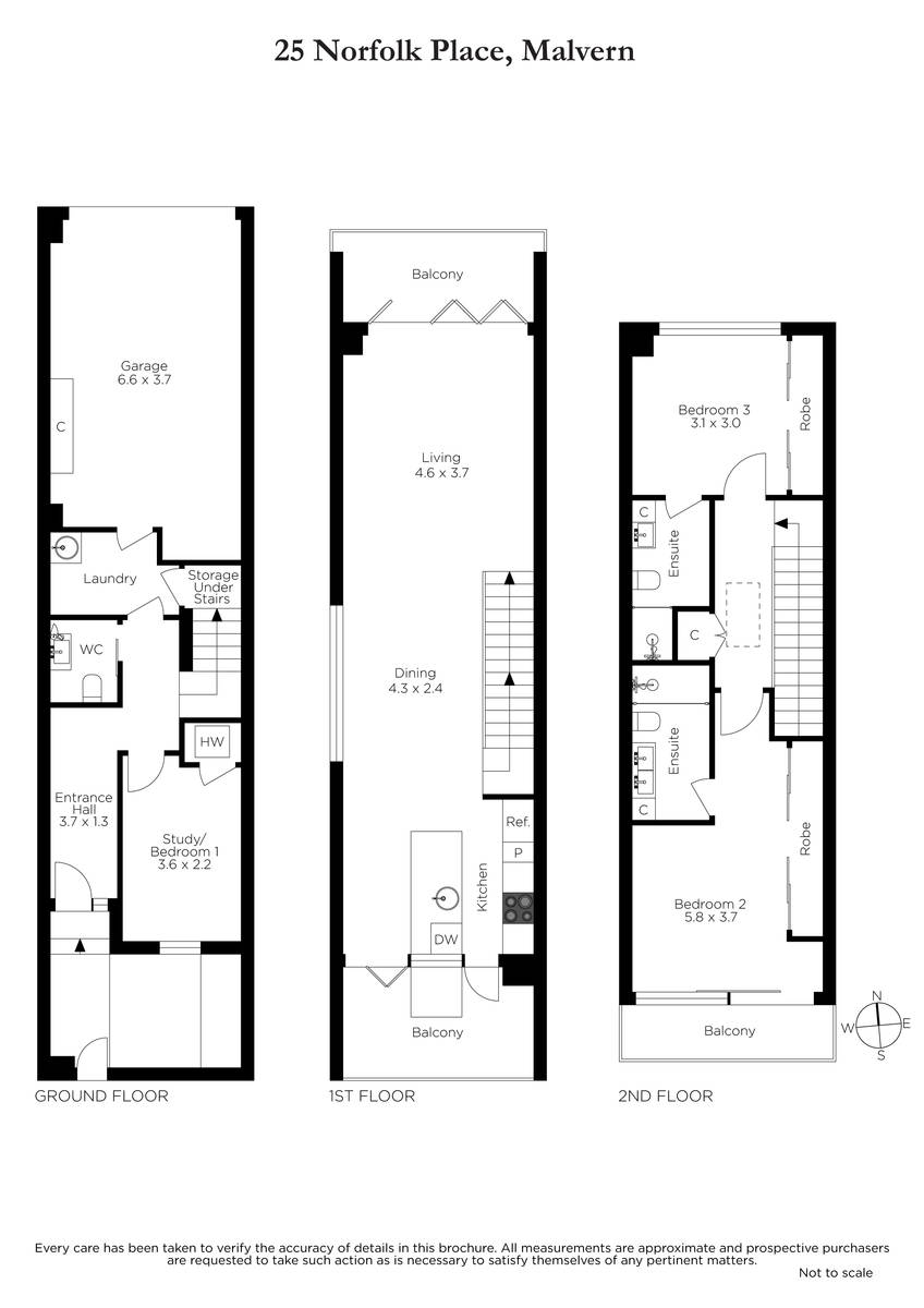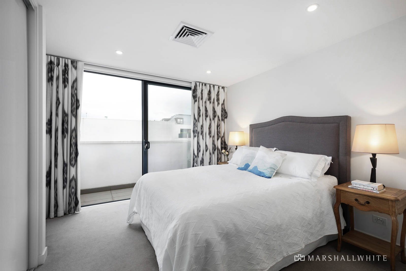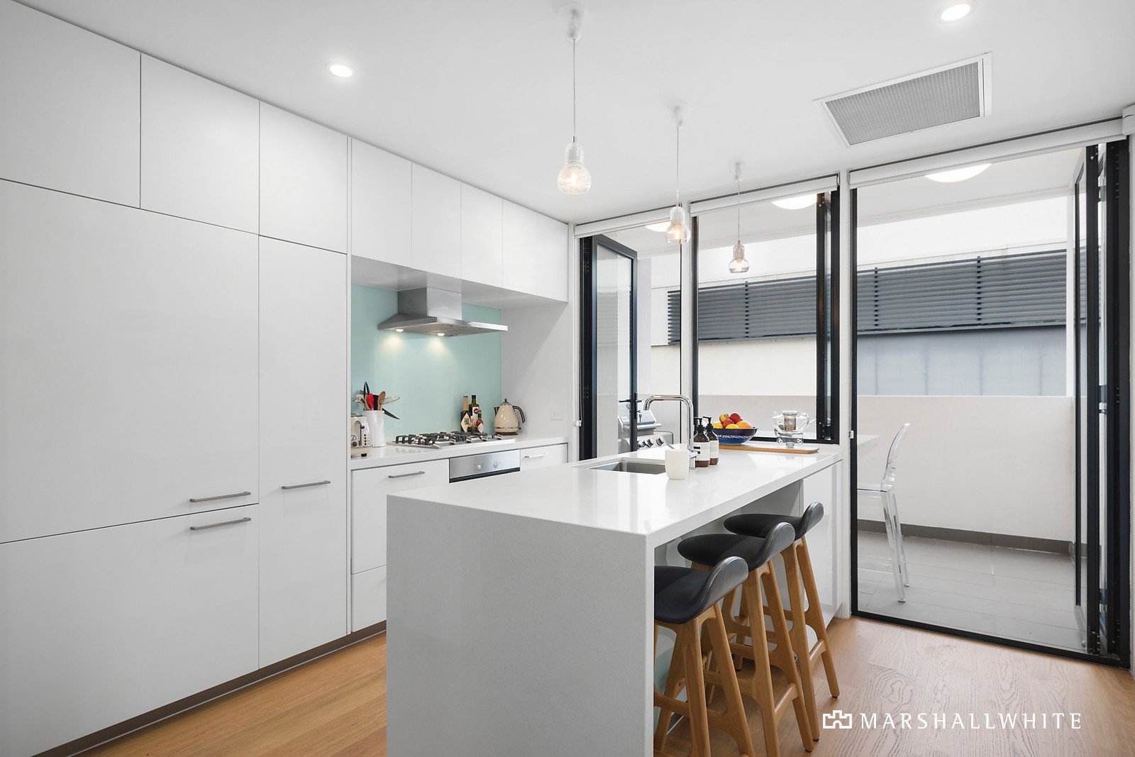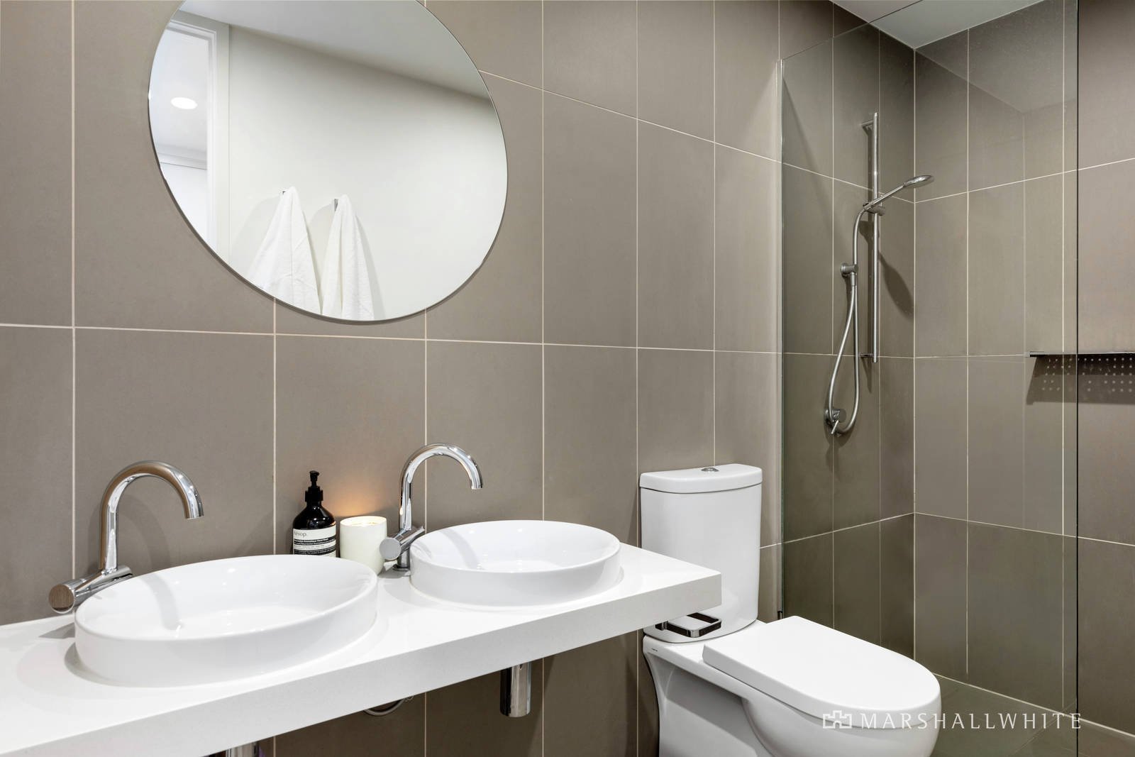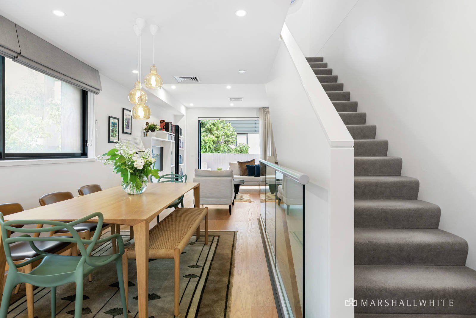 Behind its own private leafy garden, the entrance hall introduces a convenient ground level single bedroom or home office with robes and a powder-room. Streaming with northern light and featuring oak floors, the expansive open plan living and dining areas extending over the entire second level continues out through bi-fold doors to a private north-facing balcony. At the far end of the room, a sleek gourmet kitchen appointed with stone benches, Miele appliances and integrated fridge freezer opens to a second undercover balcony with built in marble topped bar/table, ideal for outdoor dining. On the third level, the gorgeous main bedroom with designer en suite, built in robes and a sunny balcony is matched by a second double bedroom also with a stylish en suite and robes.
