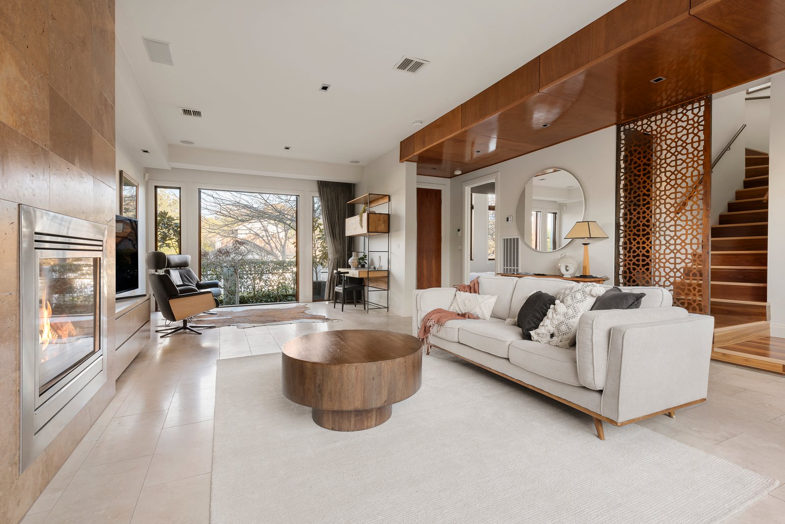 Bespoke features including travertine and Spotted Gum floors, Italian silk curtains and rare Italian marbles are highlighted throughout the sun-drenched interior dimensions. The entrance hall beneath a timber lined ceiling introduces an exceptionally spacious living room with gas log fire opening to both the front garden and through bi-fold doors to the gorgeous northwest facing decked courtyard with pond and fountain, remote sun-awning and lush greenery on all sides. The generous dining area with a sublime gourmet kitchen appointed with Smeg appliances, Vintec bar fridge, fridge/freezer and a lavish Ravello marble waterfall island bench also open to the courtyard. A light-filled bedroom with robes on the ground level is complemented upstairs by the captivating main bedroom with walk/built in robes, balcony and a designer en suite, two additional robed bedrooms and a stylish bathroom.