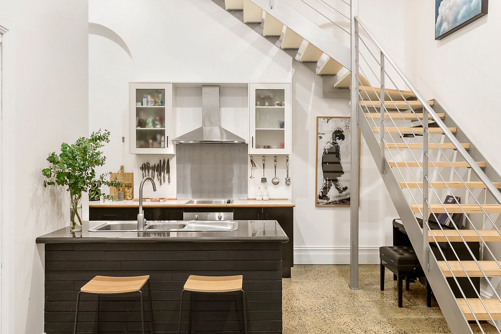 Behind the classic solid brick profile, very high ceilings accentuate the sense of space through the entrance hall and generous light-filled living room. Polished concrete floors flow through the dining area with decked light-well and the gourmet kitchen appointed with granite benches and stainless steel appliances. Open timber stairs lead up to the generous bedroom with walk in robe, stylish en suite and a north-facing sun deck offering sensational city views.