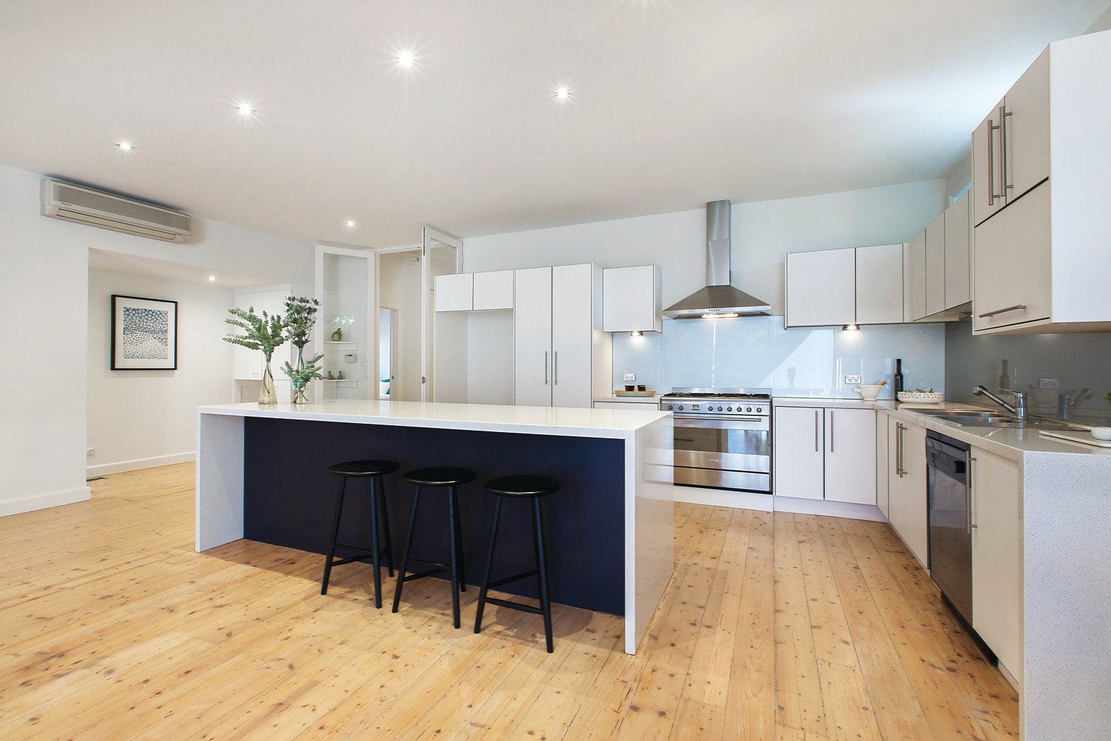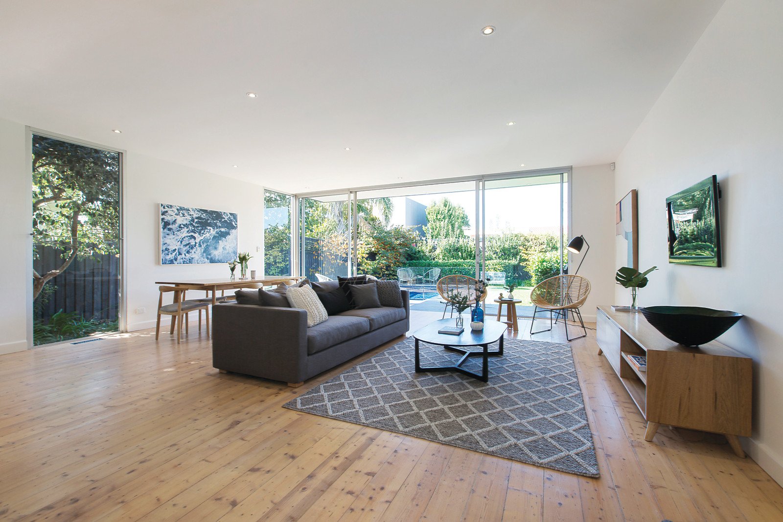 An interior streaming with natural light features limed timber floors through the wide entrance hall leading to a gorgeous sitting room with open fireplace, beautiful main bedroom with walk in robe and sleek en-suite/bathroom, three additional double bedrooms with built in robes and a second bathroom/laundry. The expansive living and dining room with a gourmet Smeg kitchen complete with stone benches opens through full width glass sliders to the glorious private northeast landscaped garden with solar heated pool, BBQ deck and bluestone terraces.
