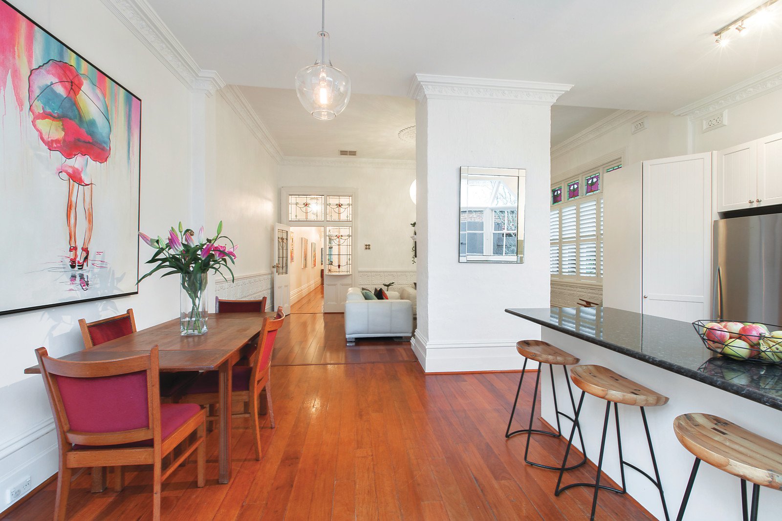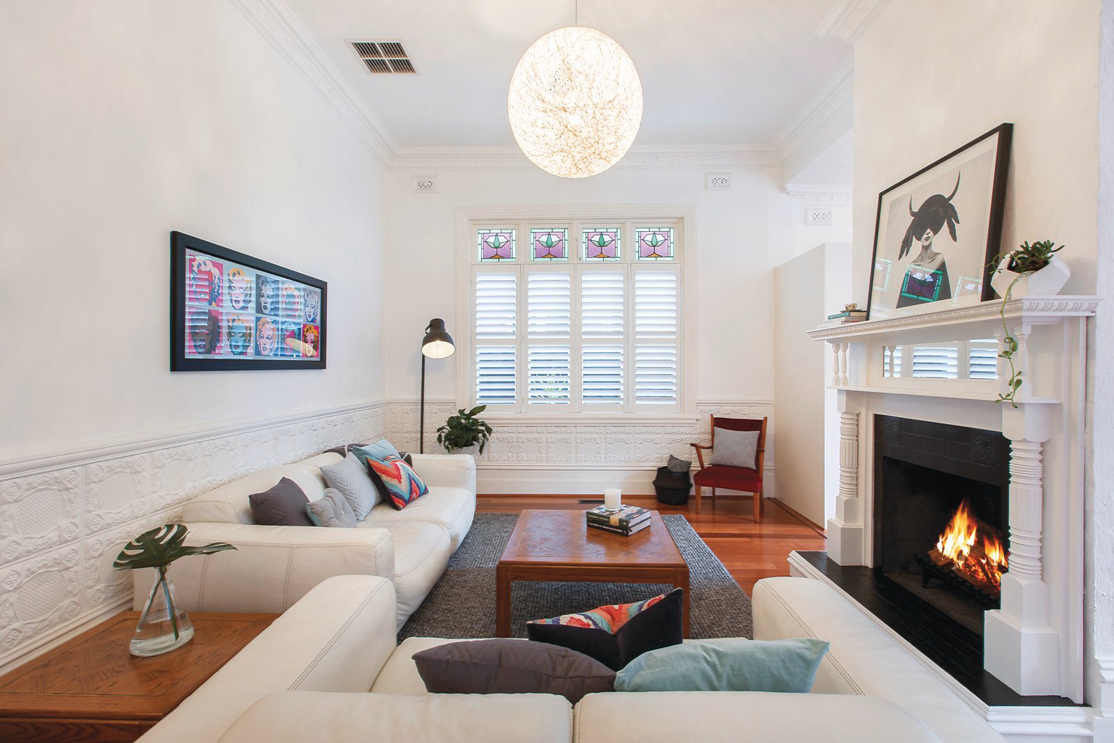 The stunning, open-plan lounge room boasting ornate pressed metal dadoes, leadlight windows and an open fireplace leads to the sun-drenched dining area and gourmet kitchen which open through French doors to a private landscaped northwest garden.