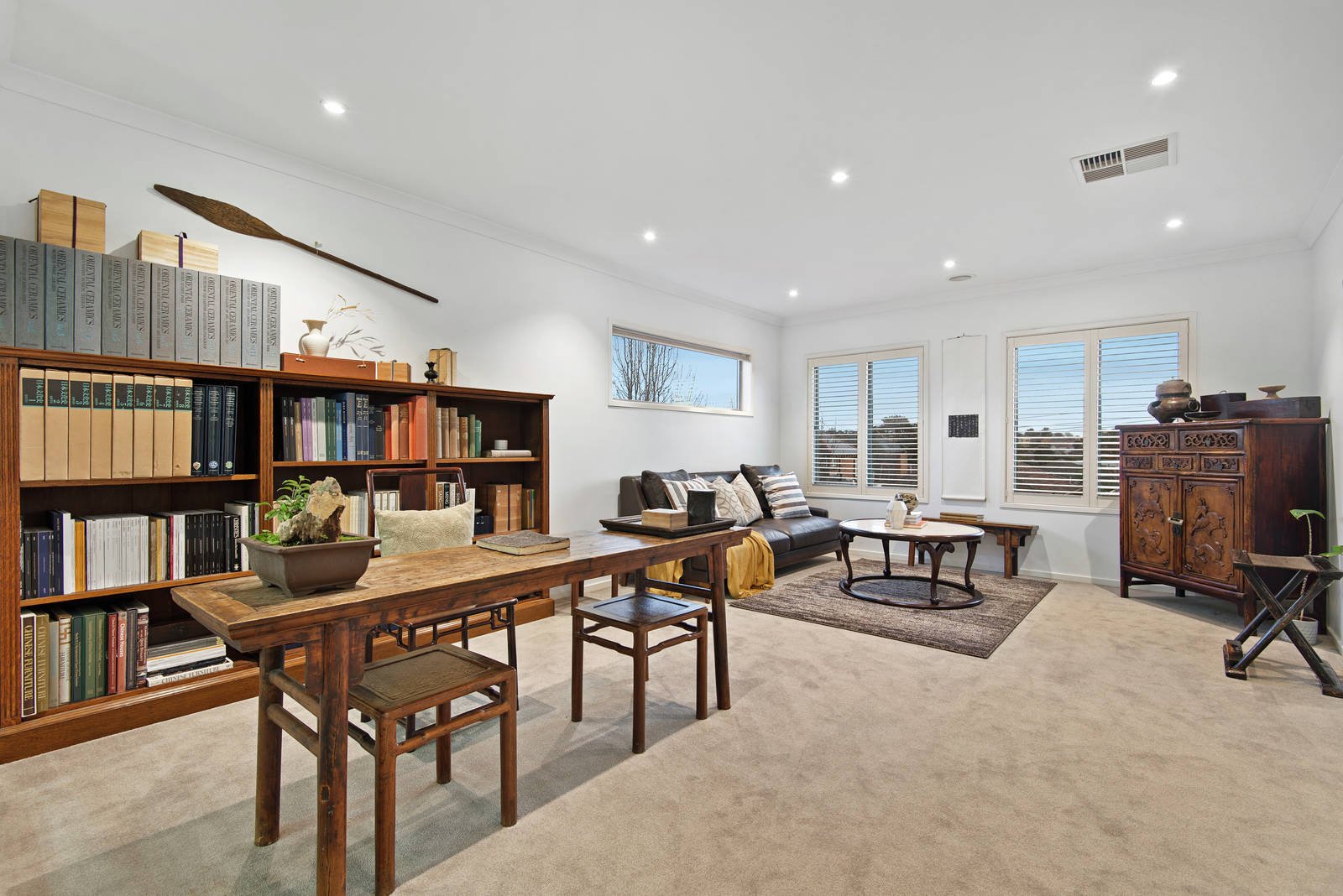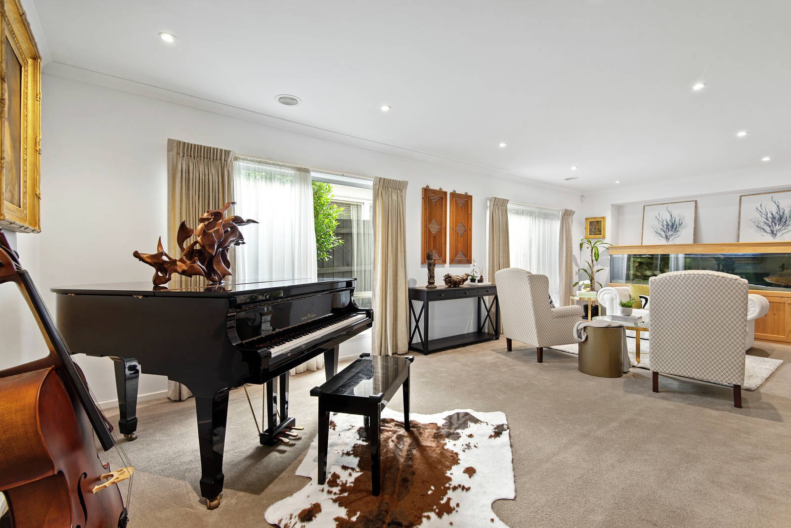 The flourishing, lush garden provides a private oasis for relaxing and plenty of space for the kids to play. Upstairs, the stairway with chandelier lighting, reveals yet another flexible living space alongside four bedrooms. The light-filled master bedroom reveals an enormous space with two walk-in-robes and dual access bathroom with double vanity and a bath overlooking leafy back garden below. Three further bedrooms, including a second with walk-in-robe and a sparkling family bathroom, offers ample room for family and guests. In front, the instant appeal is enhanced by ornamental trees and elegantly landscaped garden with the convenience of remote access, solar power, security and internal entry from the double garage.