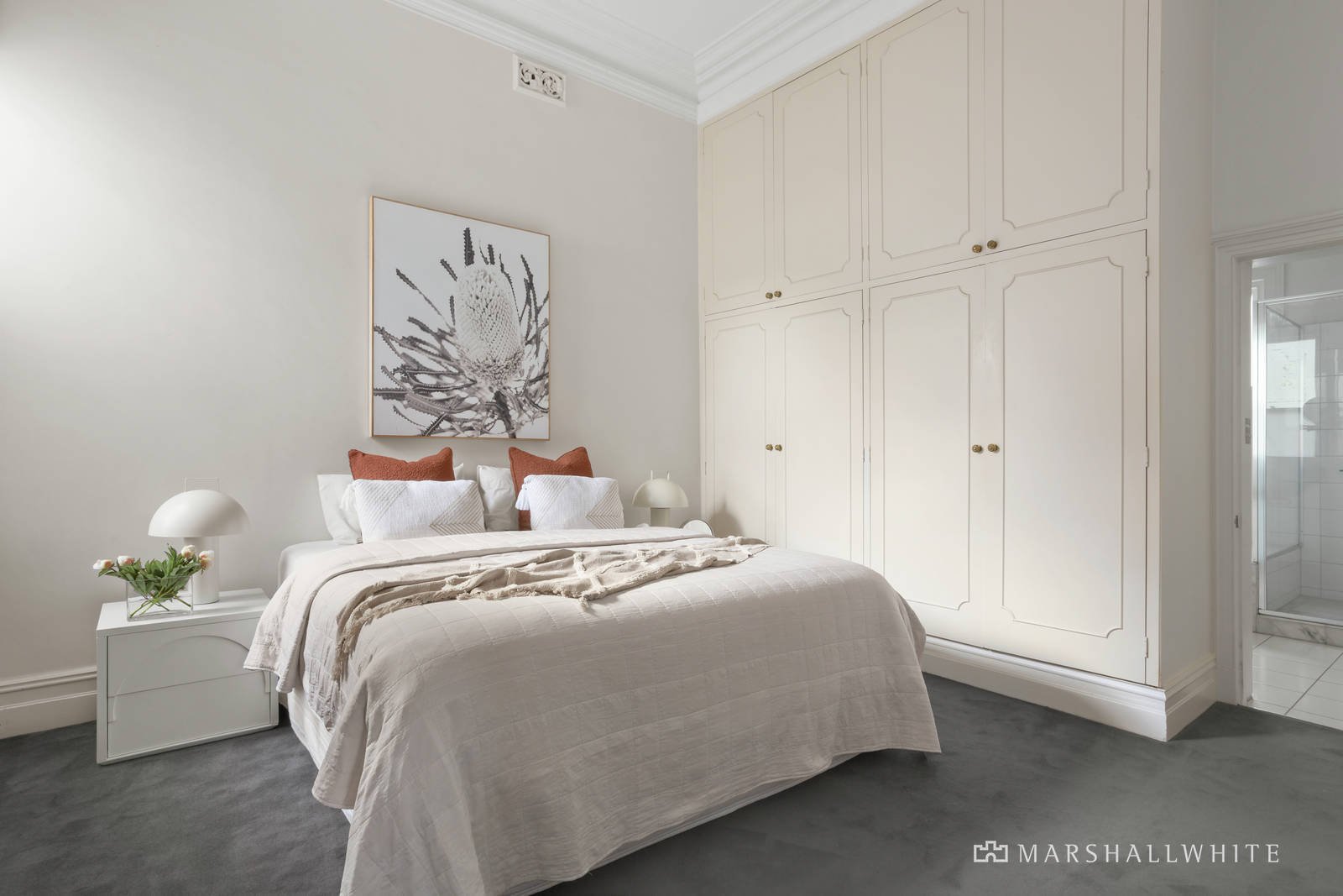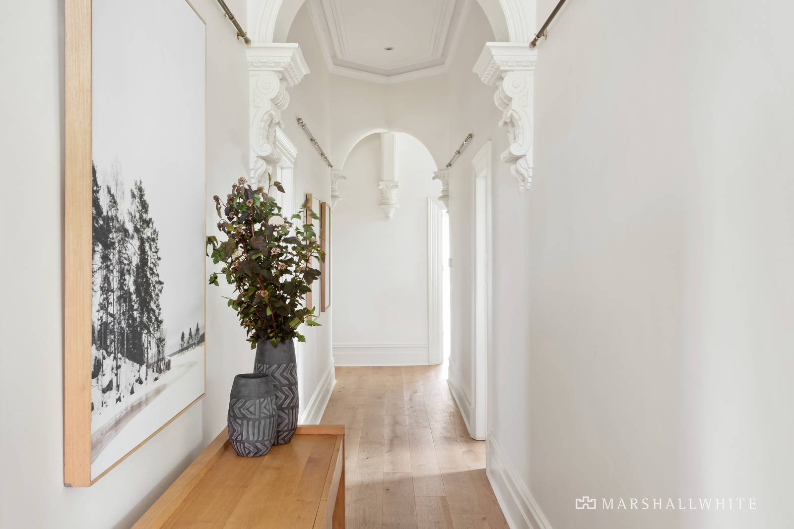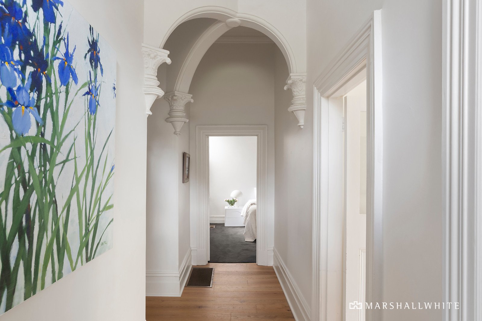A glorious arched hallway featuring traditional high ceilings and refined oak floors introduces a gracious sitting room with open fire and a beautiful formal dining room with marble fireplace. Bathed in northern light, the expansive open plan living and dining room is served by a gourmet kitchen appointed with a premium Wolf oven, porcelain benches and a walk in pantry. Glass sliders extend the living out to a completely private leafy north-facing garden oasis with extensive bluestone paving and an undercover area. Two gorgeous double bedrooms with marble fireplaces and a stylish bathroom accompany the main bedroom with robes and an en suite.