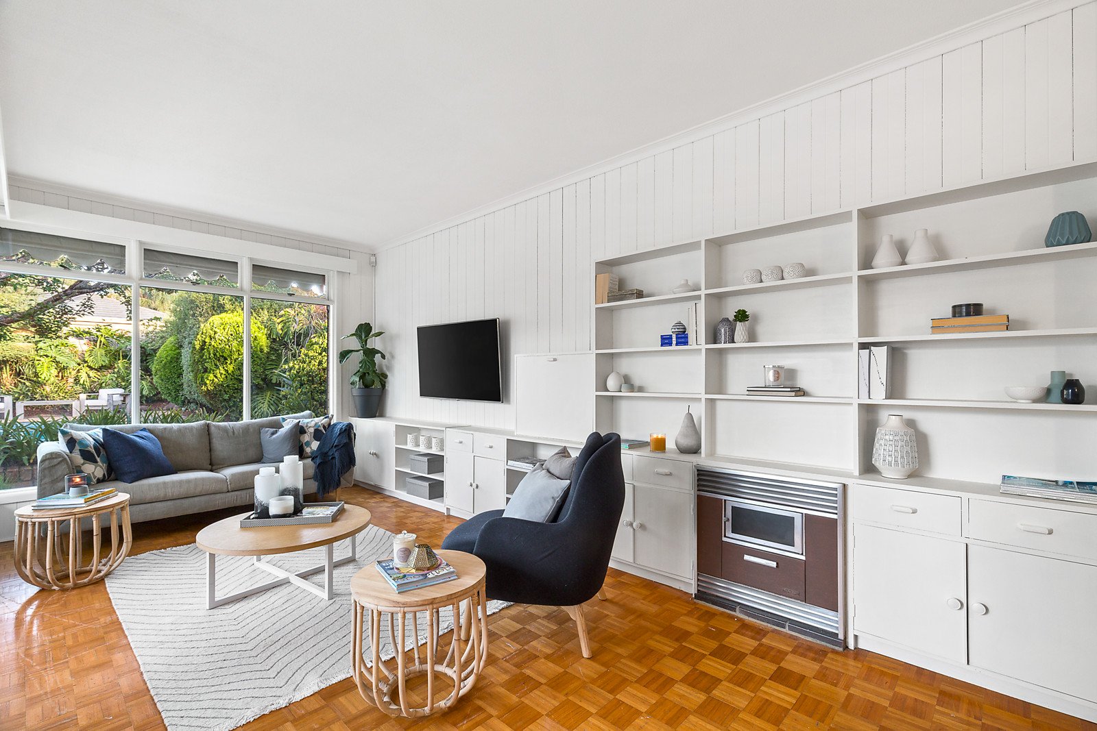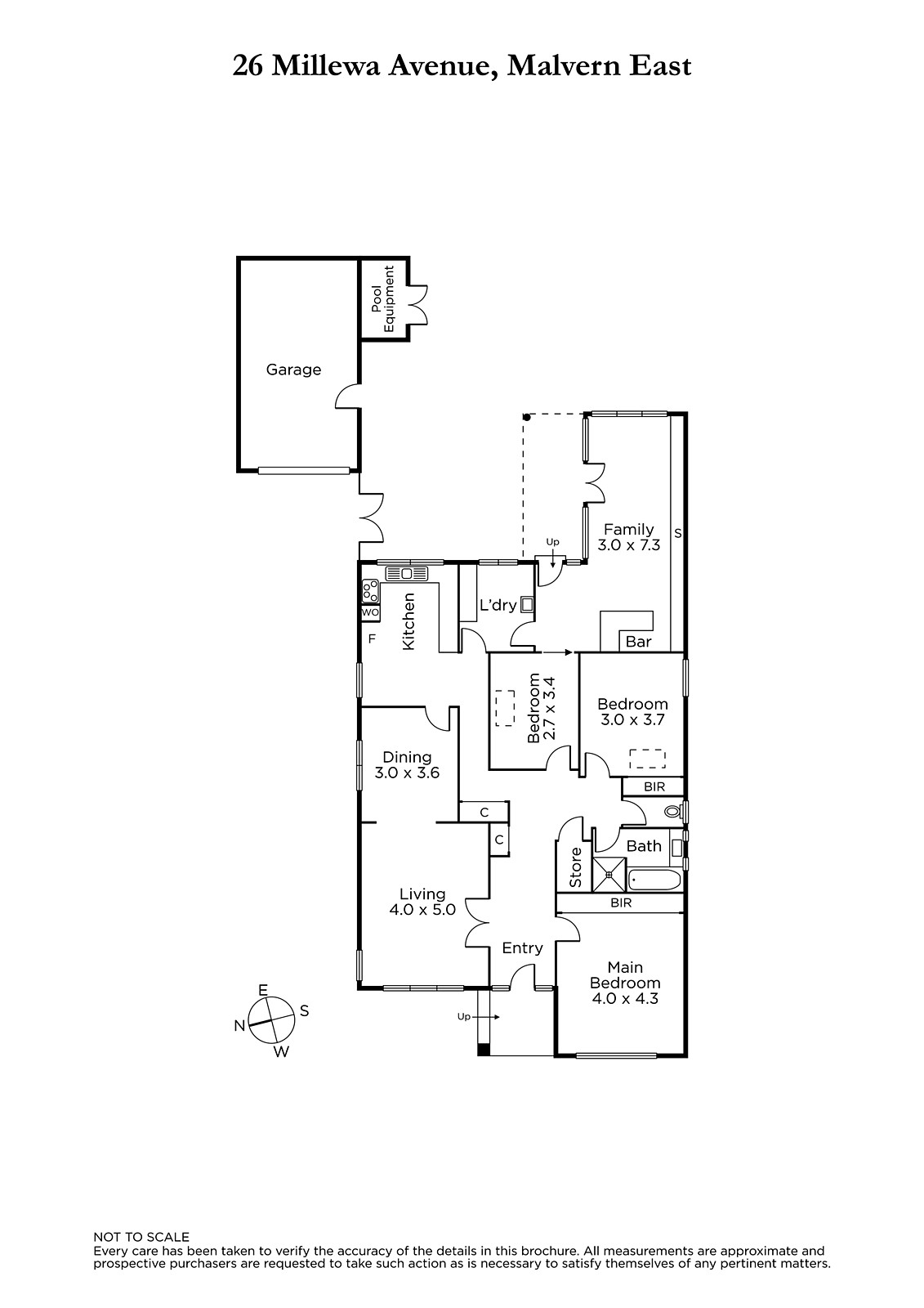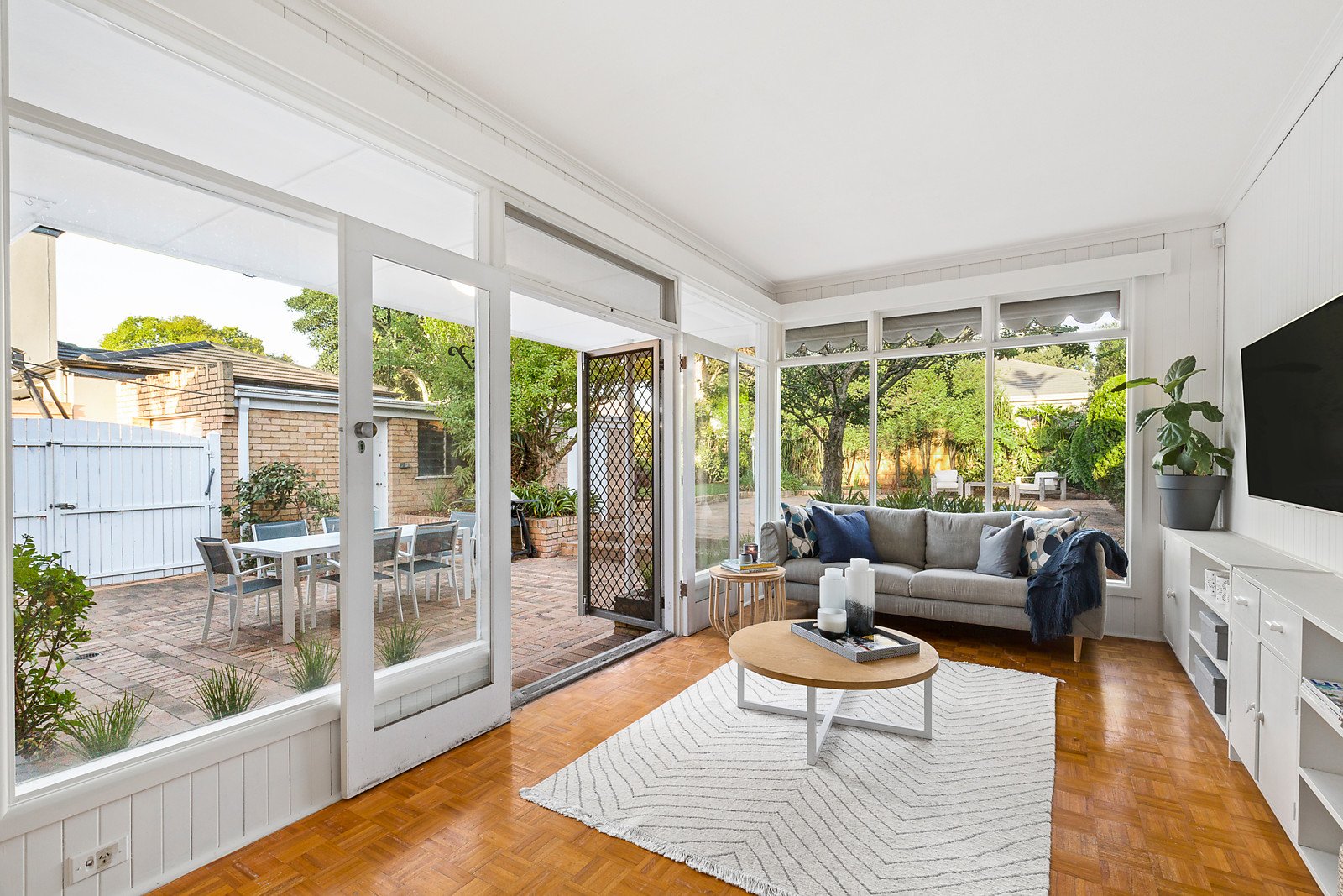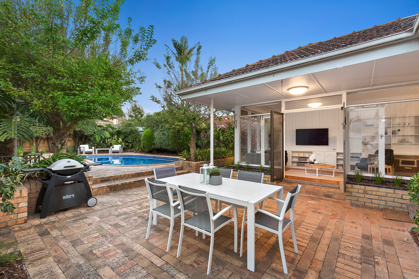 Natural light streams through the central hall, spacious living room and separate dining room served by a bright kitchen with casual meals area. Parquetry floors flow through to a large north-facing family room with bar opening to the deep private northeast garden with inground pool. Three good-sized bedrooms are accompanied by a fully tiled bathroom with separate toilet.